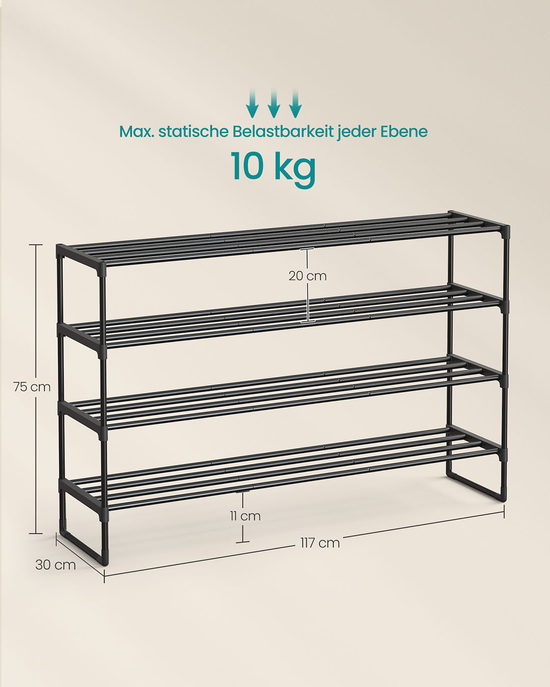 SONGMICS kenkähylly 4 tasoa, metallinen kenkäteline, kenkien säilytys, kenkien järjestelijä, pystyssä tai ylösalaisin, 5–10 parille kenkiä, pinottava, eteinen, 30 x 42,5 x 71,5 cm, musta LSA004B01