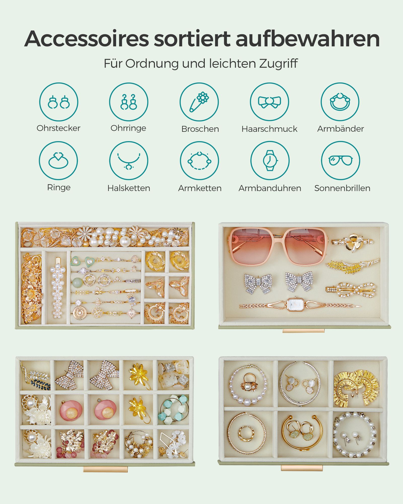 SONGMICS korurasia, 4-tasoinen korulaatikko, korurasia lasikannella, 3 laatikkoa, aurinkolaseille, suurille koruille, korujen säilytys, moderni, grafiitinmusta-kultainen JBC161B02