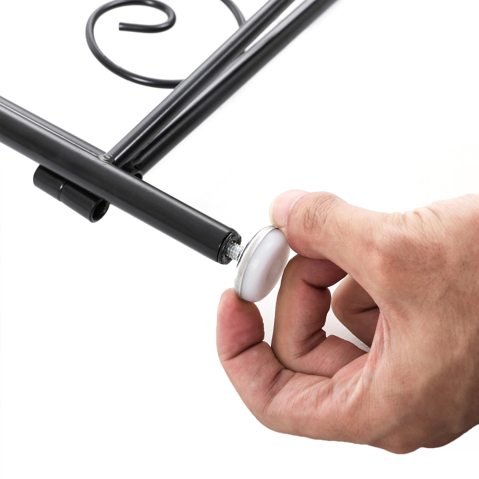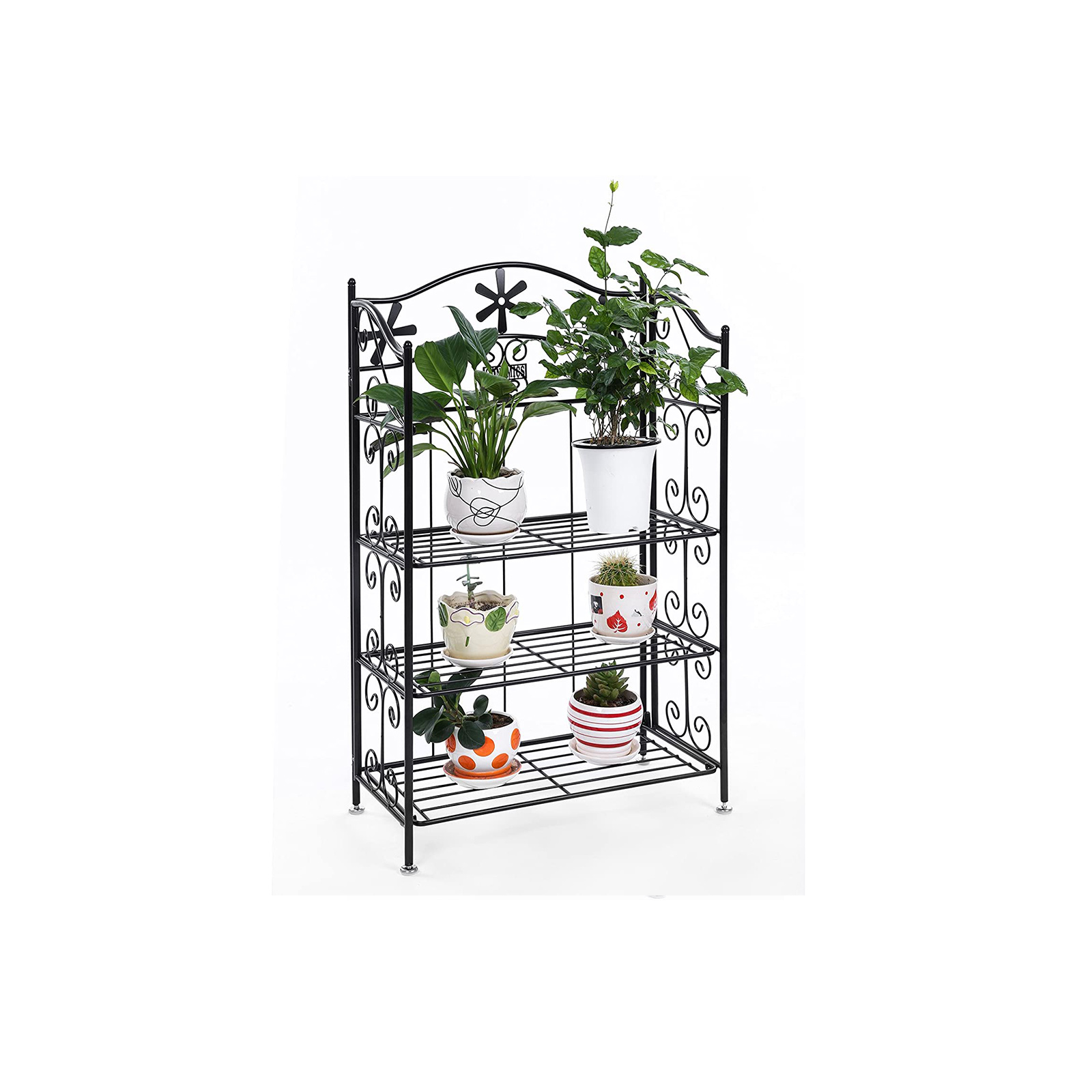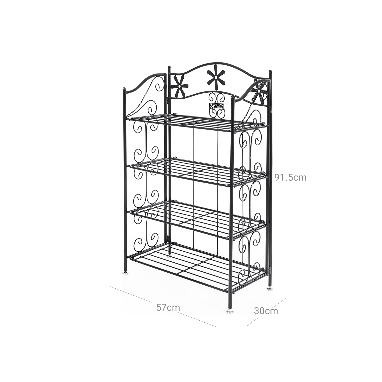 Songmics-puutarhahylly 4 hyllyllä on valmistettu jauhemaalatusta raudasta, ja se sopii sekä sisä- että ulkokäyttöön hyvän ruostumattomuutensa ansiosta. Kevyestä rakenteestaan ja helposta kokoonpanostaan huolimatta se on erittäin vakaa ja tukeva. Tyylikkään mustan värinsä ansiosta se on helppo yhdistää muihin huonekaluihin ja sopii lähes mihin tahansa ympäristöön. Kasvien ja kukkien säilytyspaikkana asunnossa, puutarhassa, terassilla, parvekkeella jne. Käsityönä valmistettu rautahylly luo viehättävän tunnelman kotiisi sen kietoutuvilla koristeilla. Tuotetiedot: – Mitat: 57 x 91,5 x 30 cm (L x K x S) – Hyllyjen välinen korkeus: 20 cm – Materiaali: rauta – Väri: musta Toimitus sisältää: – 1 x teline – 4 x hylly – 4 x jalka