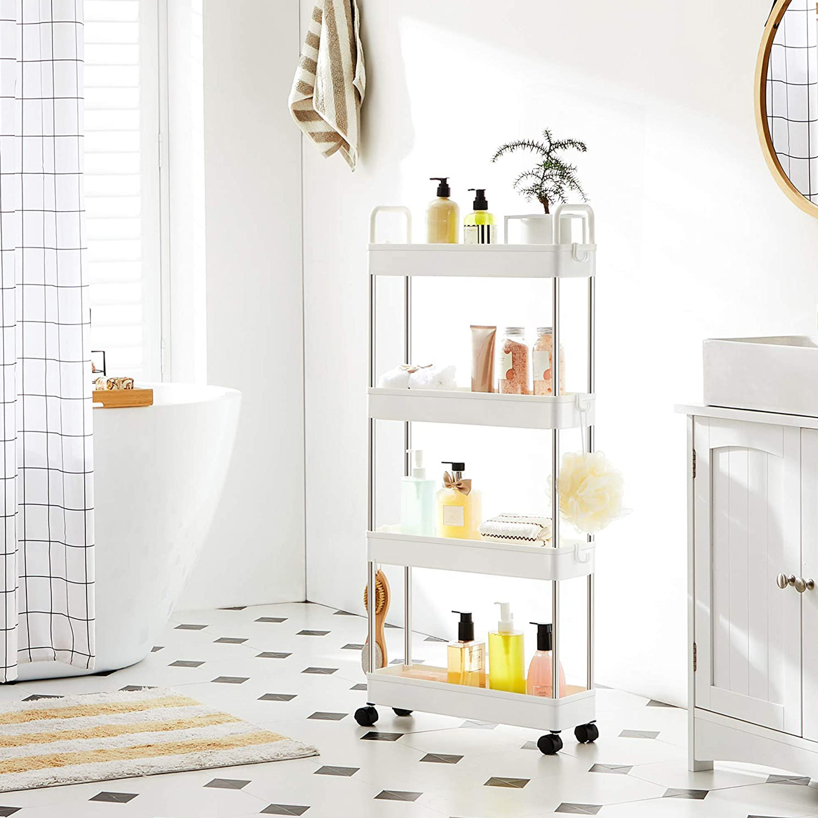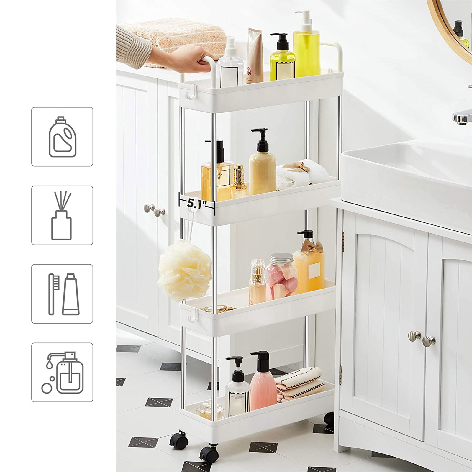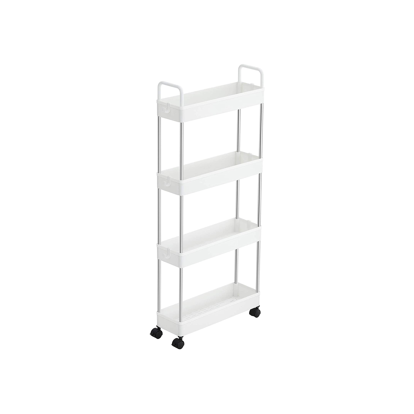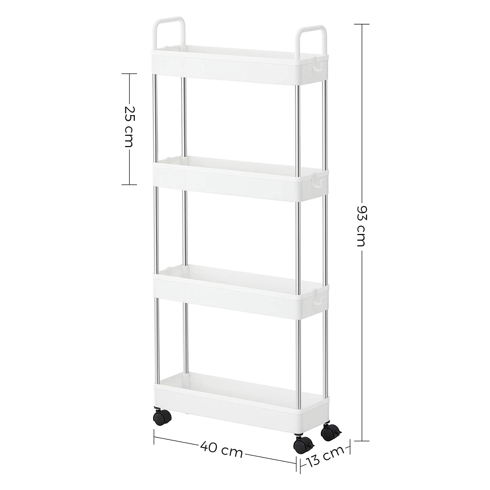 Baaritiskin vieressä: Aseta mausteet, kastikkeet, ruokaöljyt ja muut usein käytetyt ruoanlaittoaineet tälle keittiöhyllylle ja työnnä se pieneen koloon baaritiskin vieressä. Näin suola, pippuri ja oliiviöljy ovat heti käden ulottuvilla, kun haluat antaa ruoalle viimeisen silauksen.Kylpyammeen viereen: Täytä tämä käytännöllinen kylpyhuonehylly kylpyvaahdolla, shampoolla ja pyyhkeillä, rullaa se kylpyammeen viereen ja hyppää kuumaan vaahtokylpyyn! Pesukoneen viereen: Aseta pesuaineet ja puhdistusaineet tälle joustavalle rullavaunulle ja työnnä se pesukoneen viereen. Pyykki on nyt puolet helpompaa. Tuotetiedot:Väri: valkoinen Materiaali: ruostumaton teräs, PP (polypropeeni) Kokonaismitat: 40 x 13 x 93 cm (P x L x K) Paino: 1,3 kg Maks. staattinen kantavuus per taso: 5 kg Toimitus sisältää: 1 x rullavaunu 6 x koukku 1 x ohjeet (DE, EN, DE, FR, ES, IT) SONGMICS-ohjeet:Sijoita raskaammat esineet alimmalle hyllylle ja aseta tai ripusta esineet tasaisesti jokaiselle tasolle kaatumisen estämiseksi.