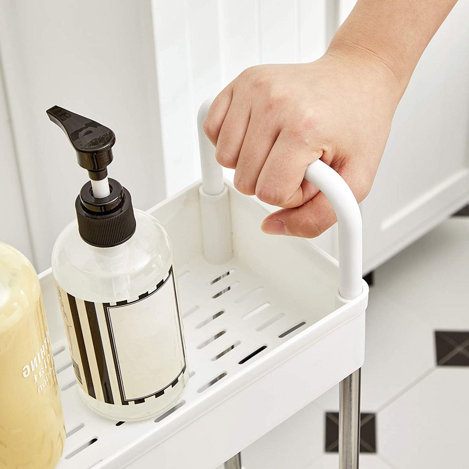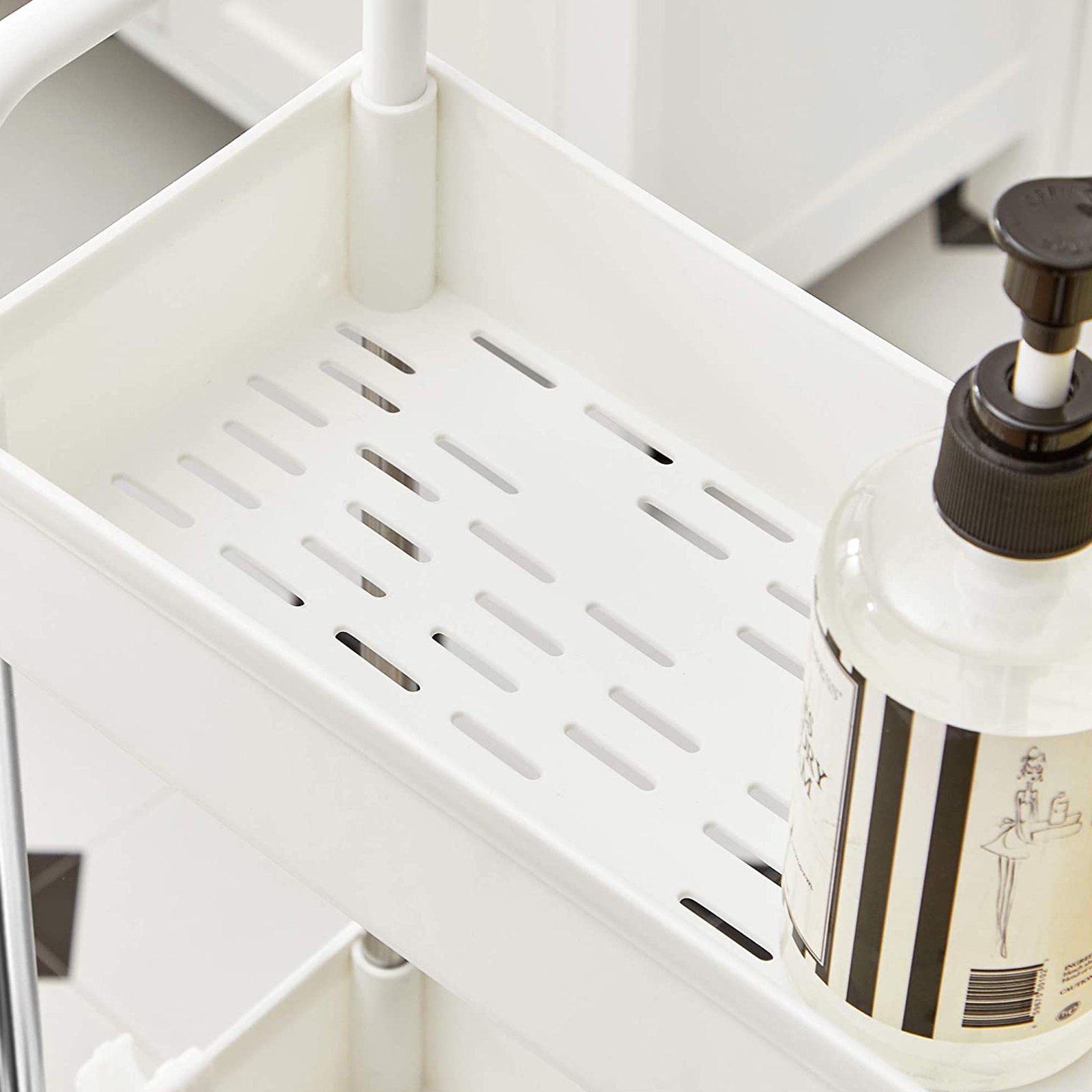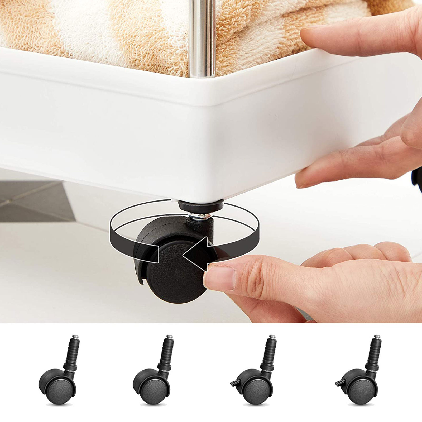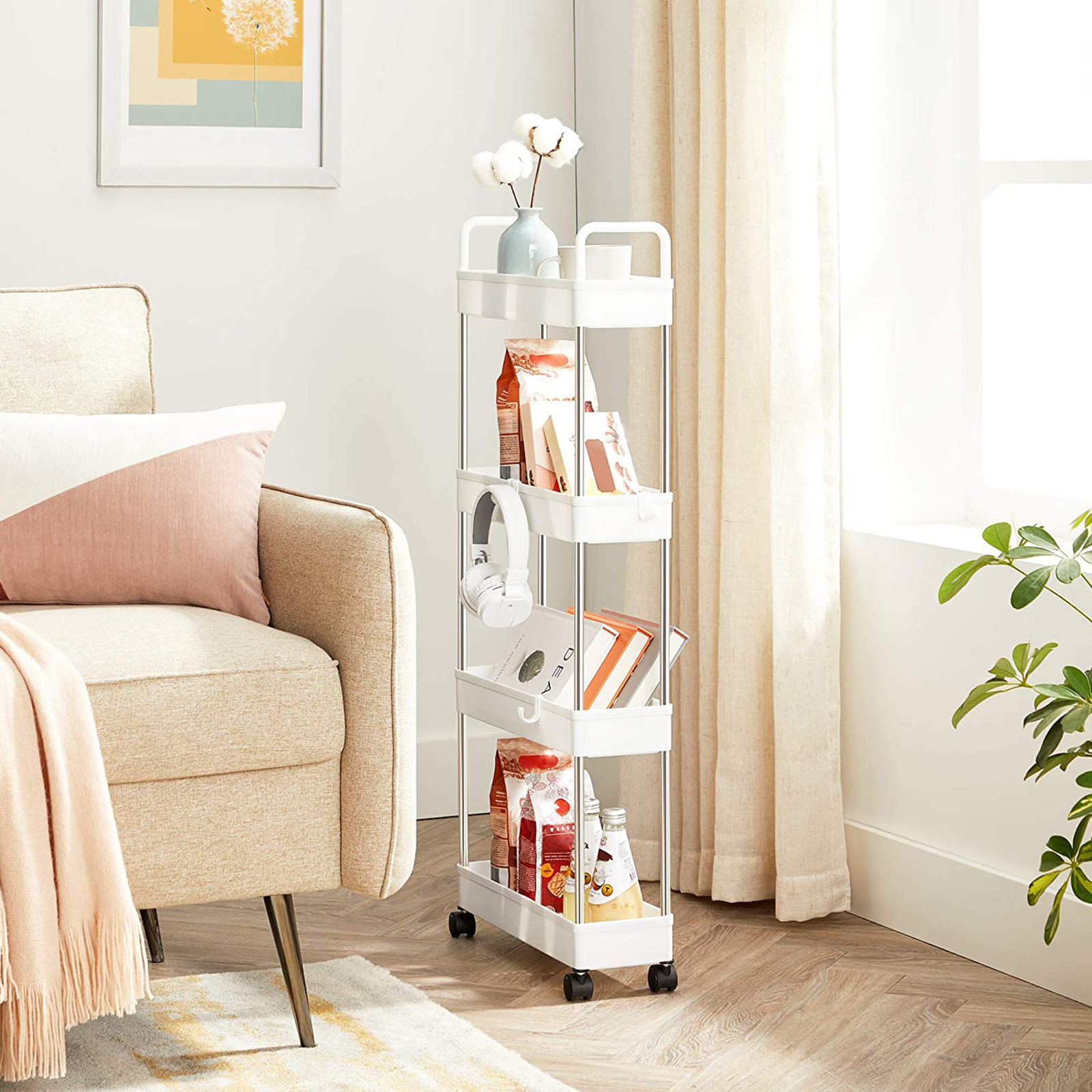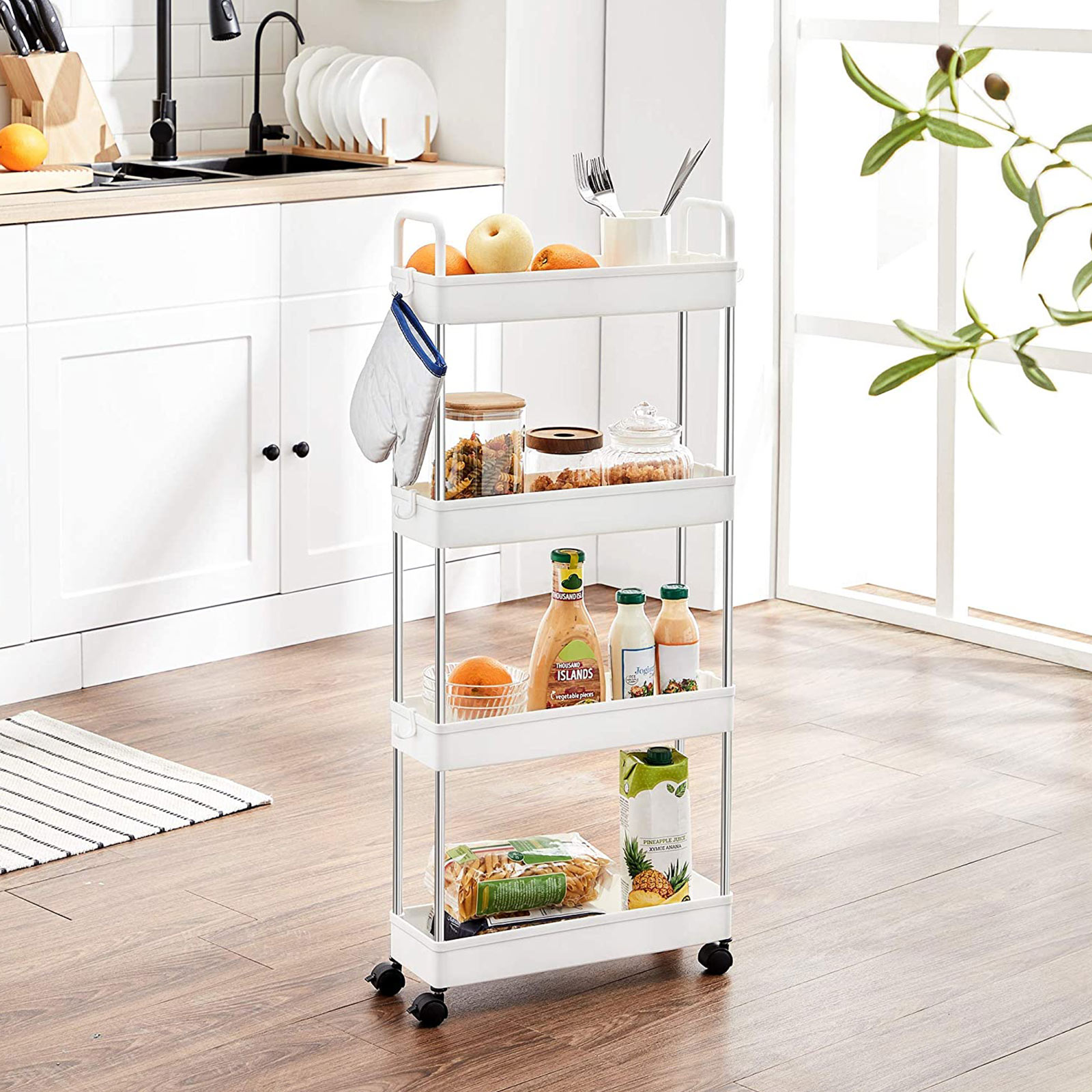 Baaritiskin vieressä: Aseta mausteet, kastikkeet, ruokaöljyt ja muut usein käytetyt ruoanlaittoaineet tälle keittiöhyllylle ja työnnä se pieneen koloon baaritiskin vieressä. Näin suola, pippuri ja oliiviöljy ovat heti käden ulottuvilla, kun haluat antaa ruoalle viimeisen silauksen.Kylpyammeen viereen: Täytä tämä käytännöllinen kylpyhuonehylly kylpyvaahdolla, shampoolla ja pyyhkeillä, rullaa se kylpyammeen viereen ja hyppää kuumaan vaahtokylpyyn! Pesukoneen viereen: Aseta pesuaineet ja puhdistusaineet tälle joustavalle rullavaunulle ja työnnä se pesukoneen viereen. Pyykki on nyt puolet helpompaa. Tuotetiedot:Väri: valkoinen Materiaali: ruostumaton teräs, PP (polypropeeni) Kokonaismitat: 40 x 13 x 93 cm (P x L x K) Paino: 1,3 kg Maks. staattinen kantavuus per taso: 5 kg Toimitus sisältää: 1 x rullavaunu 6 x koukku 1 x ohjeet (DE, EN, DE, FR, ES, IT) SONGMICS-ohjeet:Sijoita raskaammat esineet alimmalle hyllylle ja aseta tai ripusta esineet tasaisesti jokaiselle tasolle kaatumisen estämiseksi.