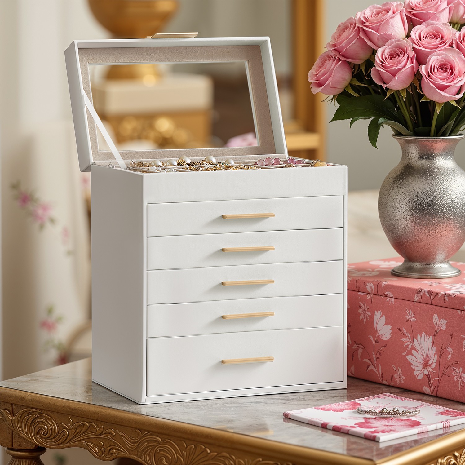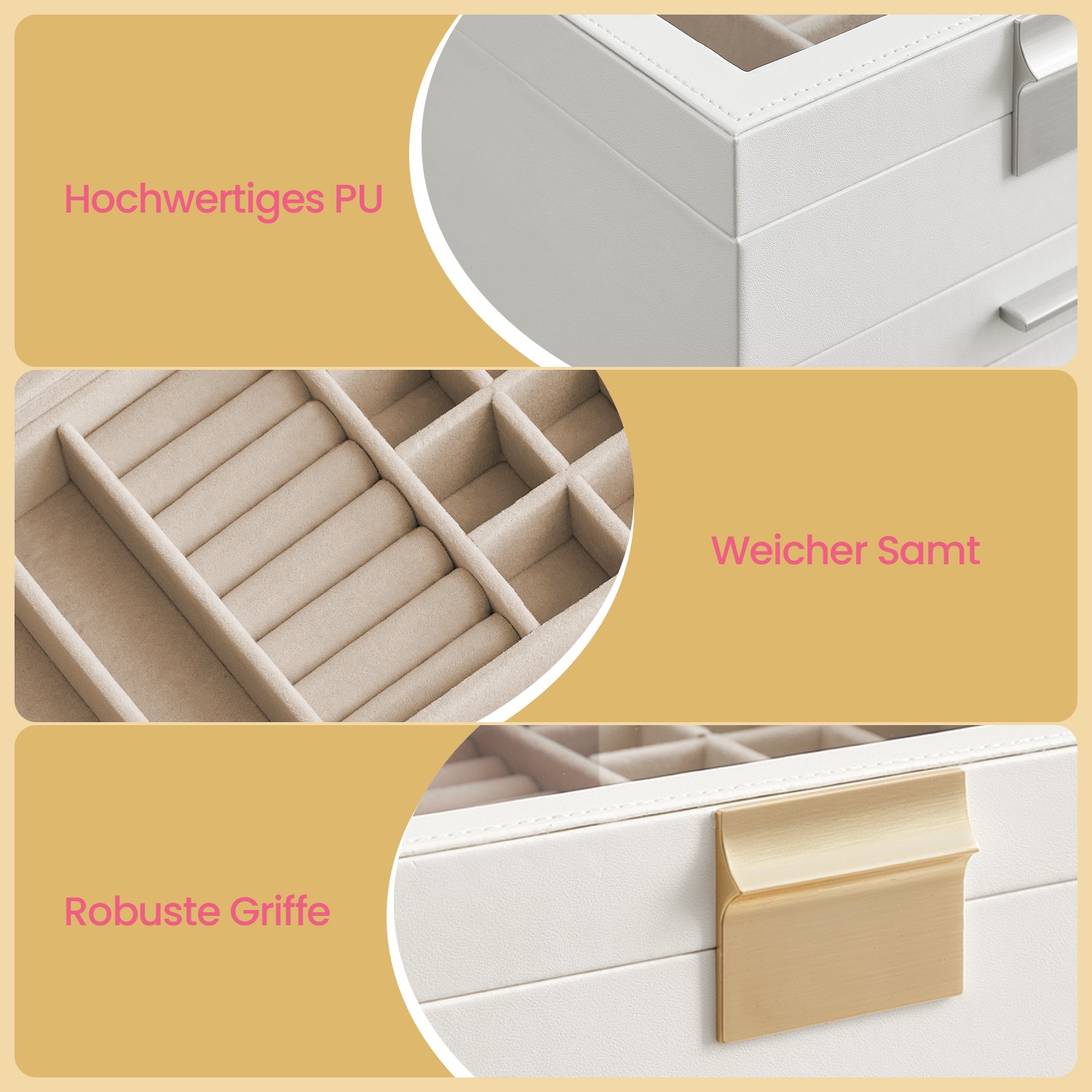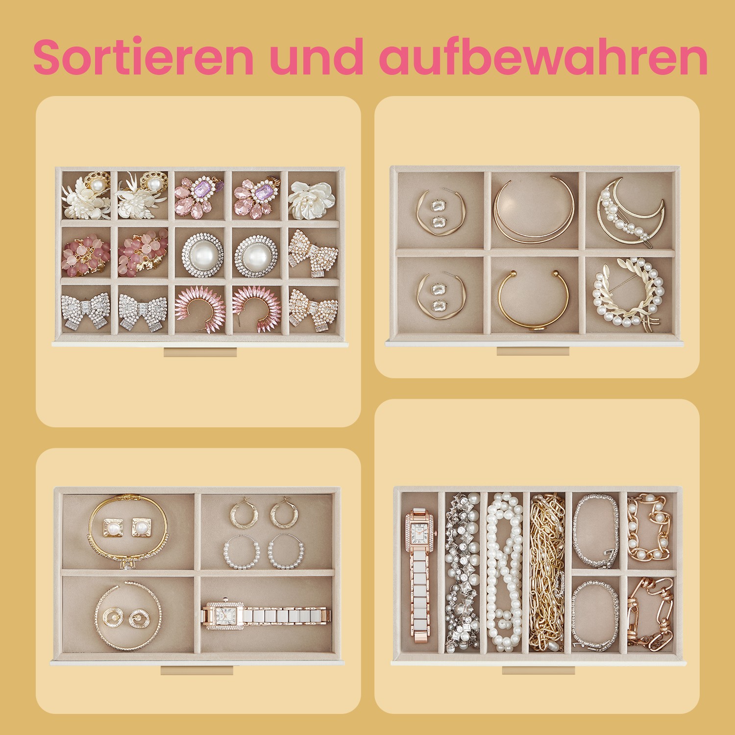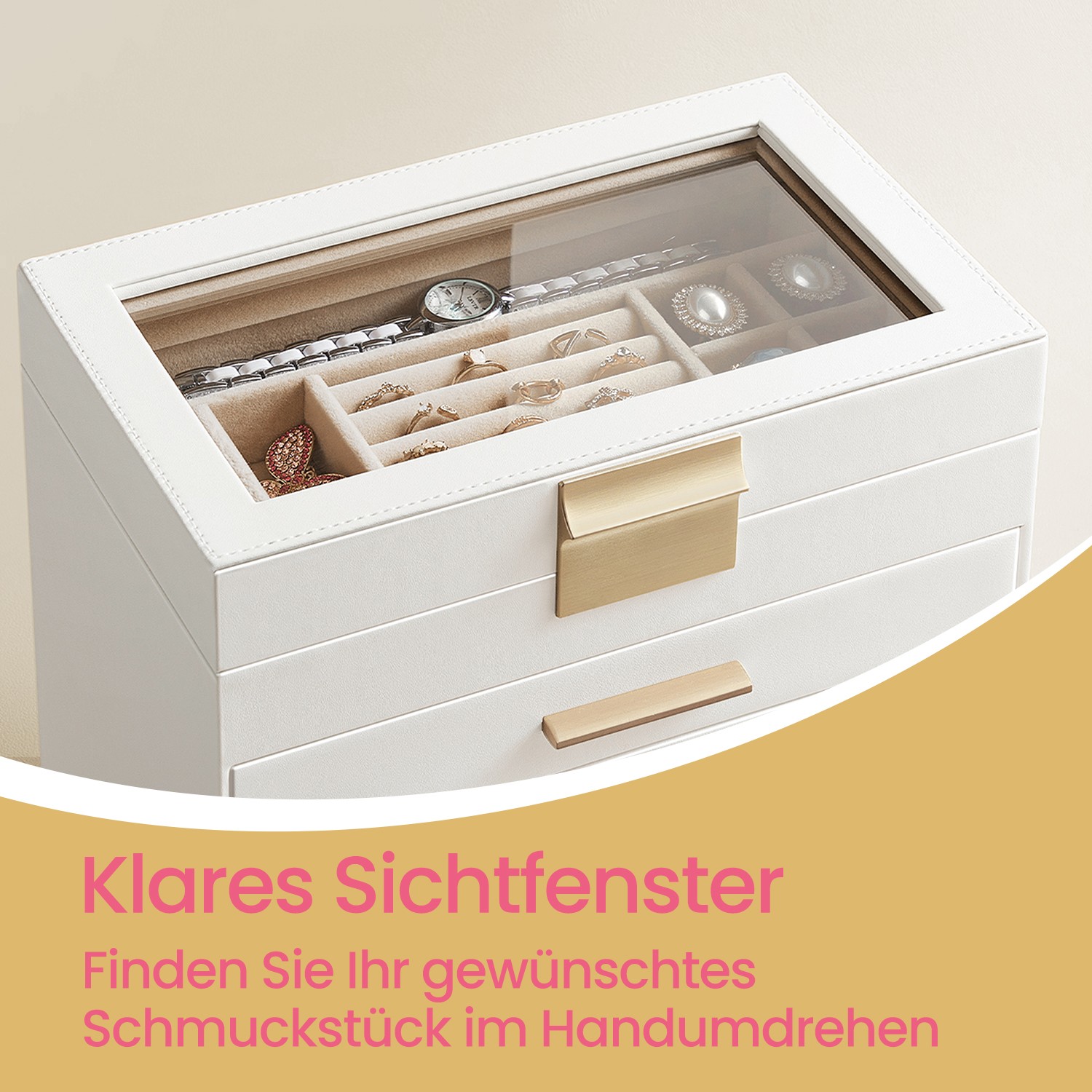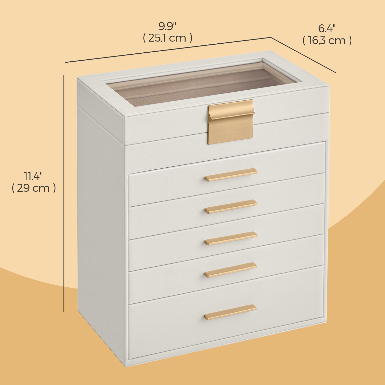 SONGMICS korurasia, 6-tasoinen korulaatikko, korurasia lasikannella, 5 laatikkoa, aurinkolaseille, suurille koruille, korujen säilytys, moderni, kyyhkynharmaa-kultainen JBC171G01