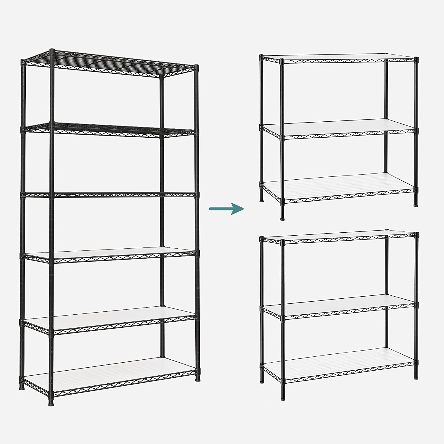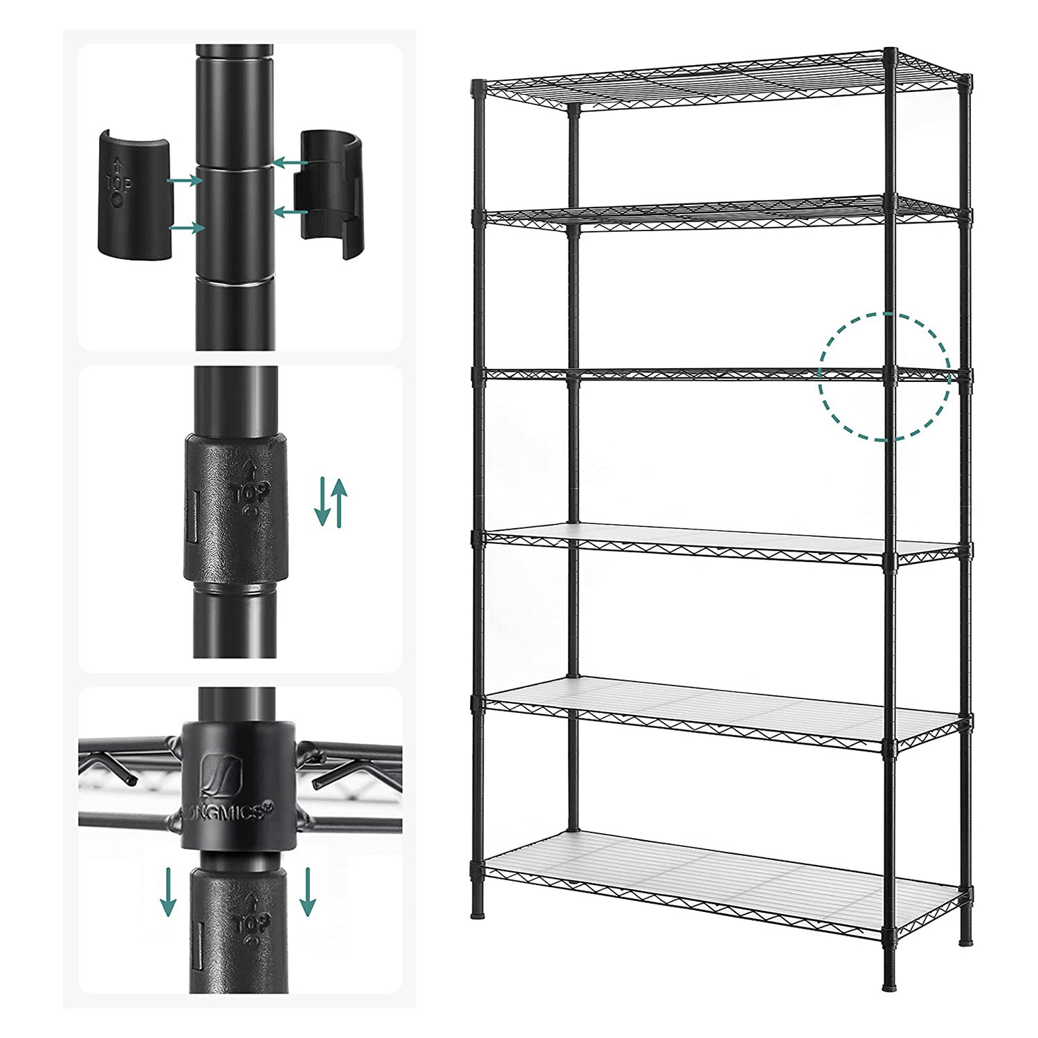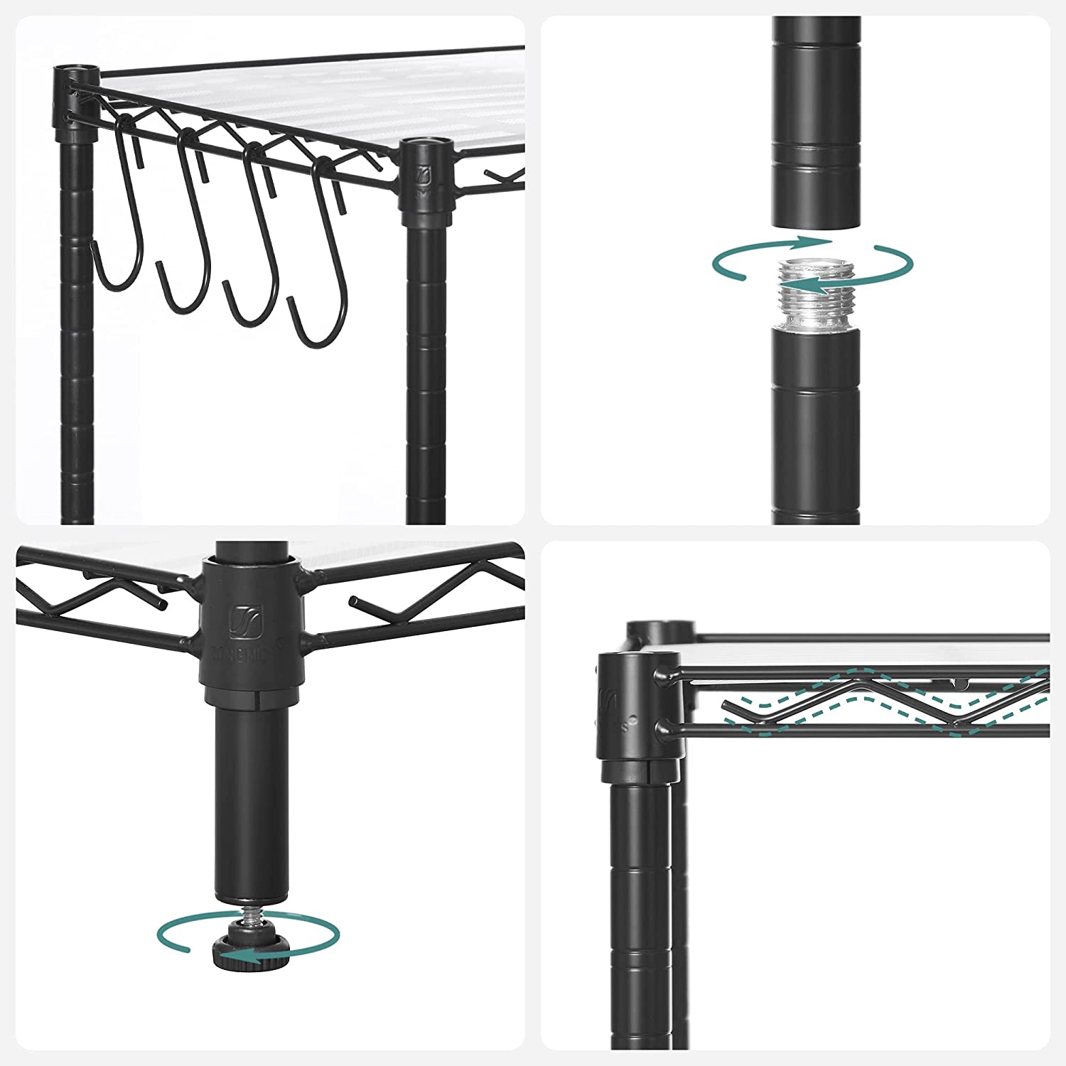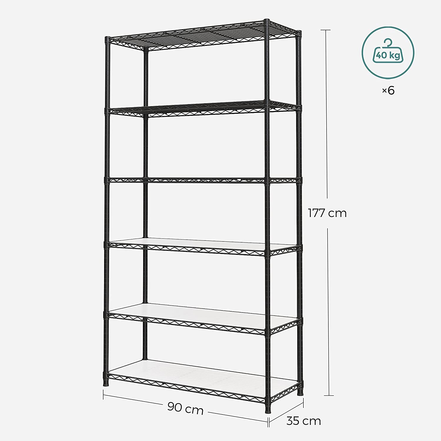 Tuotetiedot: Väri: musta Materiaali: teräs Koko: 90 x 35 x 177 cm (P x L x K) Paino: 11,9 kg Maks. staattinen kantavuus per hyllytaso: 40 kg Maks. staattinen kantavuus yhteensä: 240 kg Toimitus sisältää: 1 x keittiöhylly 6 x PP-levy 8 x S-koukku 2 x kaatumissuoja 1 x ohjeet SONGMICS Huomautukset:Muovikiinnikkeitä asennettaessa TOP-nuolen tulee aina osoittaa ylöspäin. Tarkista asennuksen jälkeen kaikki kiinnikkeet varmistaaksesi, että ne eivät liiku. Varmista, että kaikki kiinnikkeet ovat kunnolla paikallaan putkien syvennyksissä, jotta hyllyt ovat keittiön pöydän kanssa samansuuntaiset. Kiinnitä tuote seinään kaatumissuojalla turvallisen käytön varmistamiseksi.