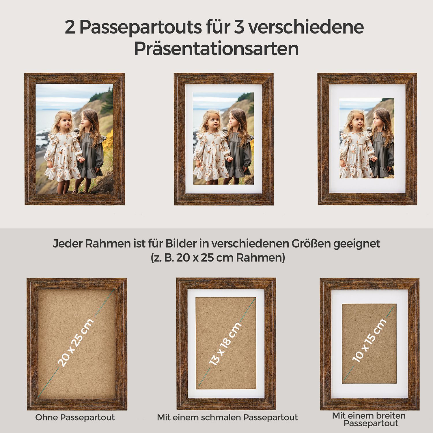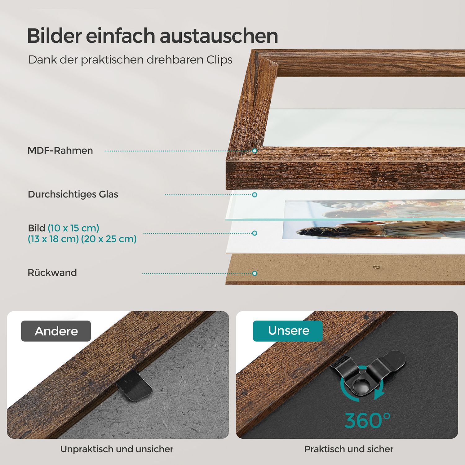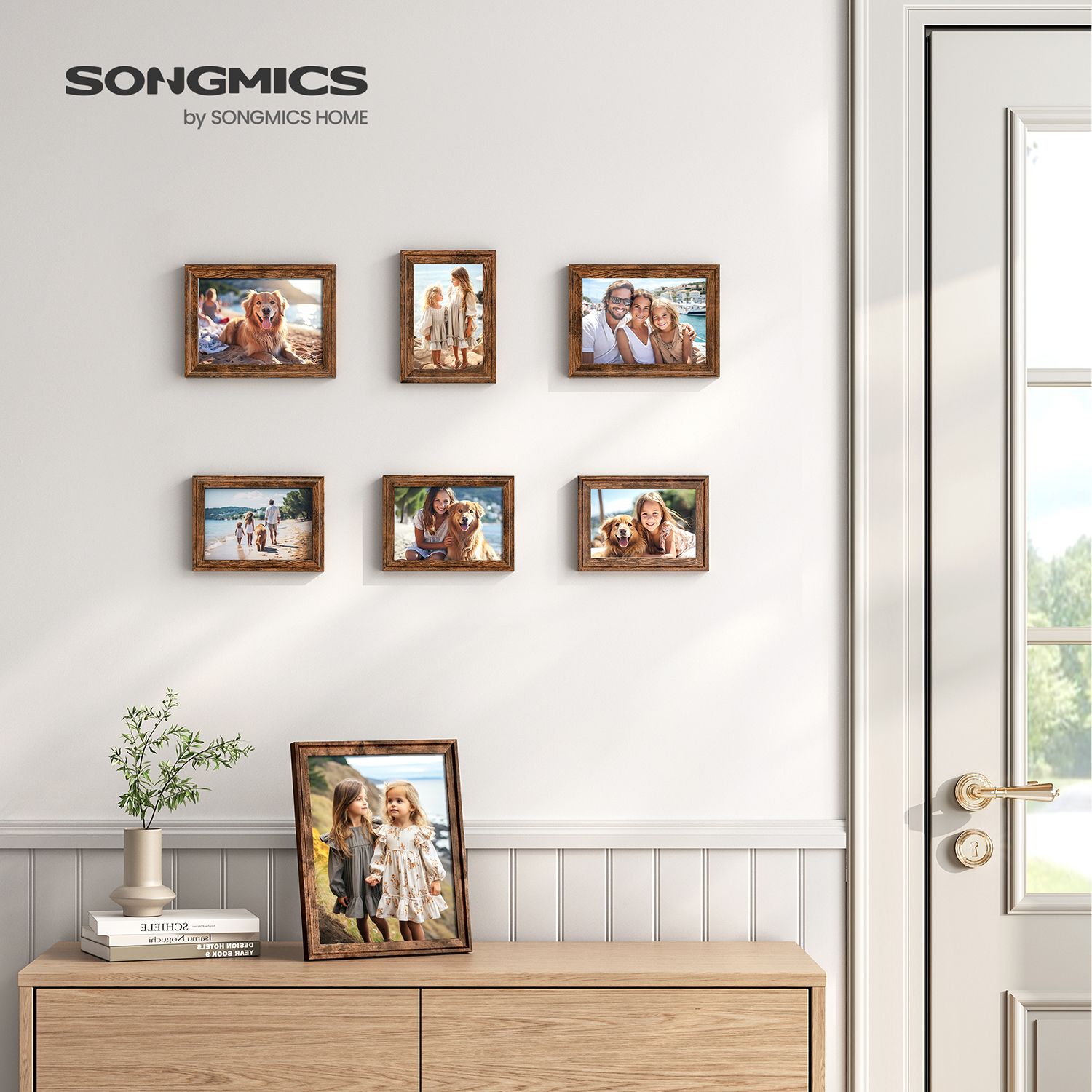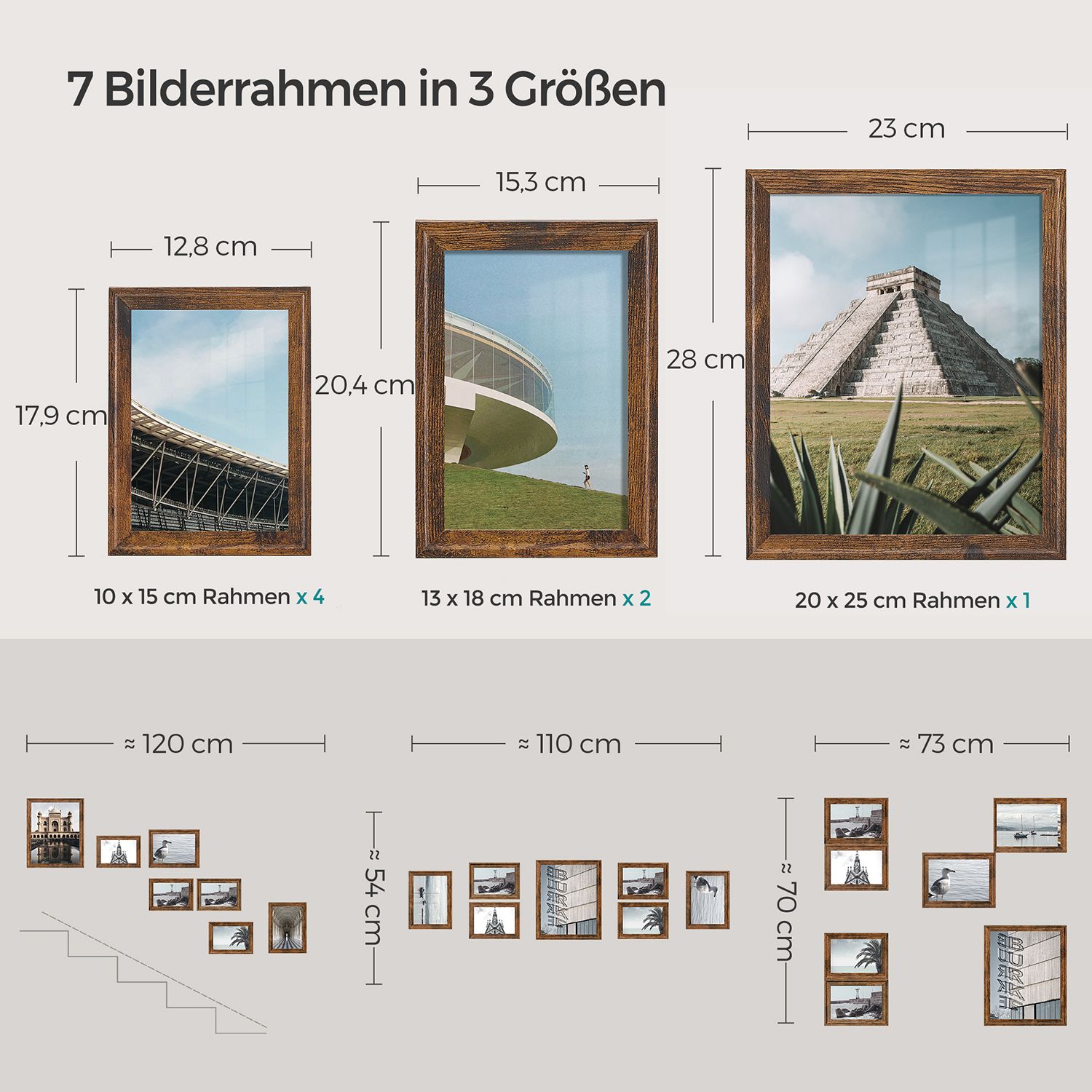 SONGMICS-valokuvakehys 10 passepartoutia, 7-osainen valokuvakehyssetti, yksi 20 x 25 cm, kaksi 13 x 18 cm, neljä 10 x 15 cm, ripustettava, pystytettävä, MDF, lasi, 9 jälkiä jättämätöntä seinäkoukkua, tuhkanmusta RPF047B01