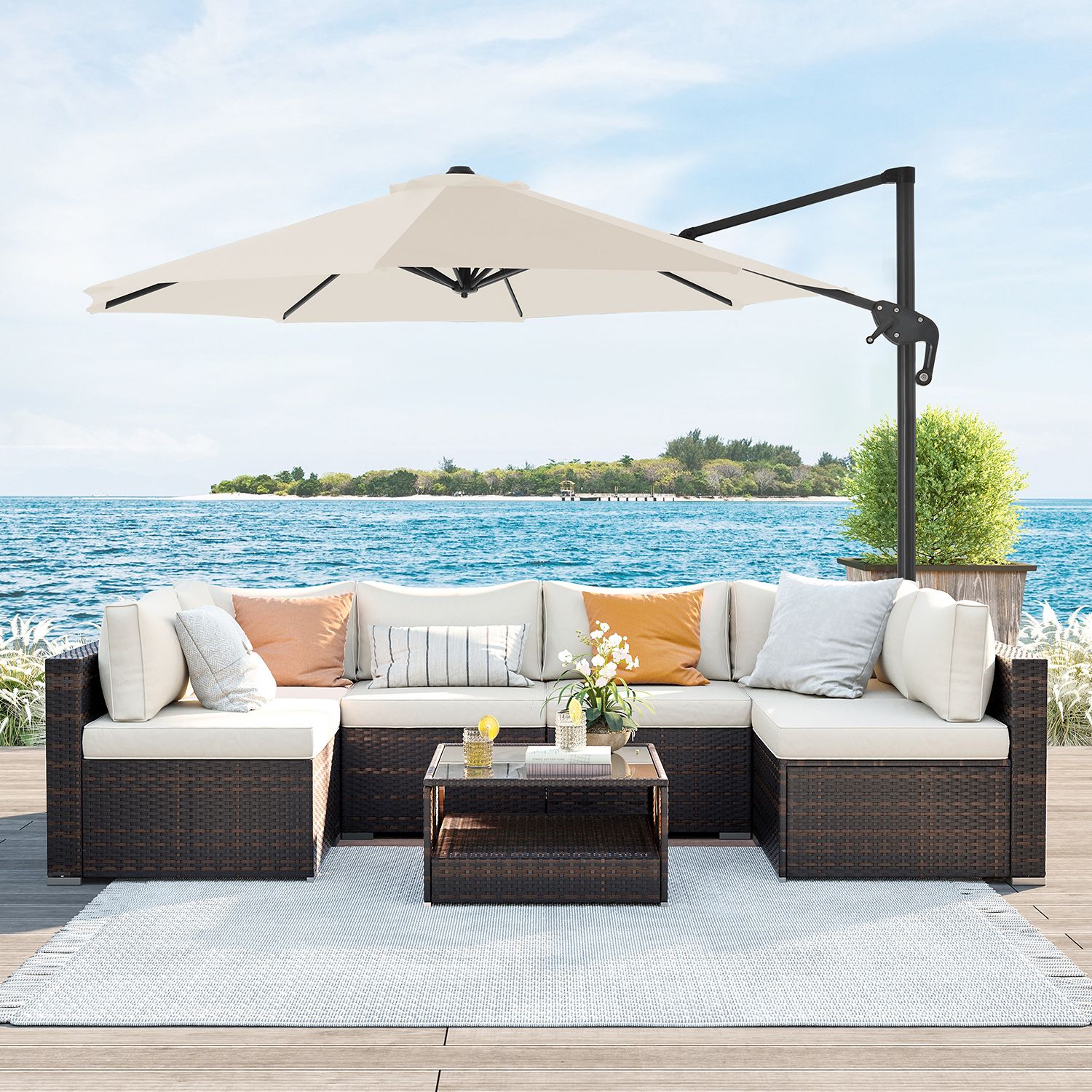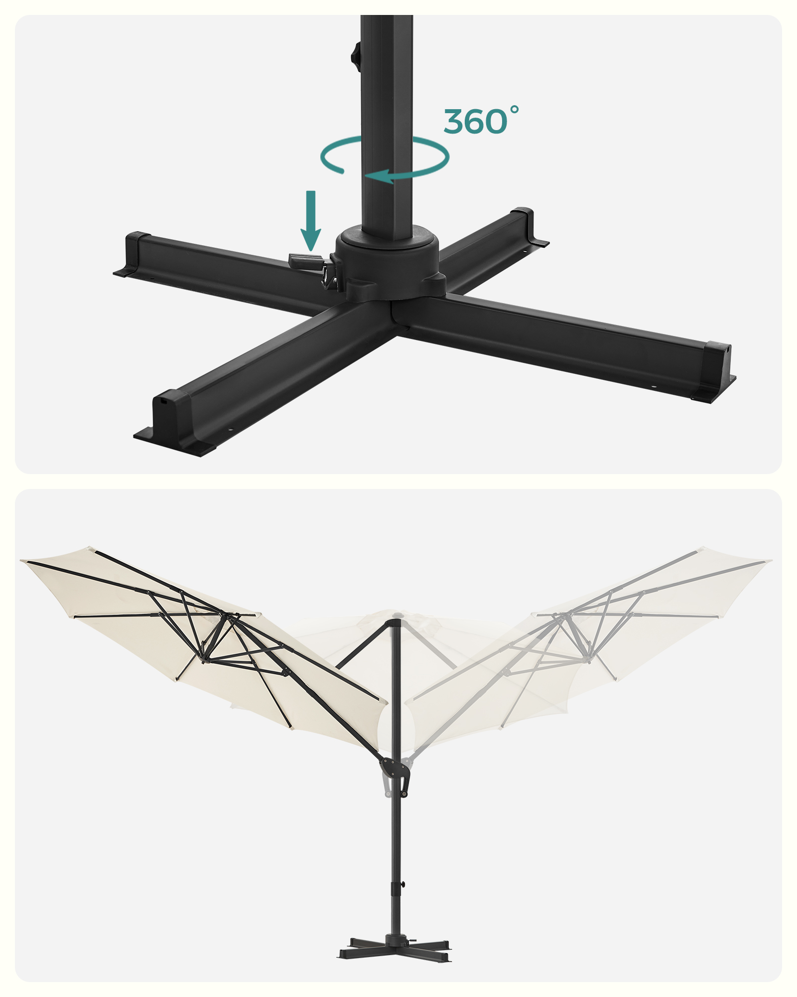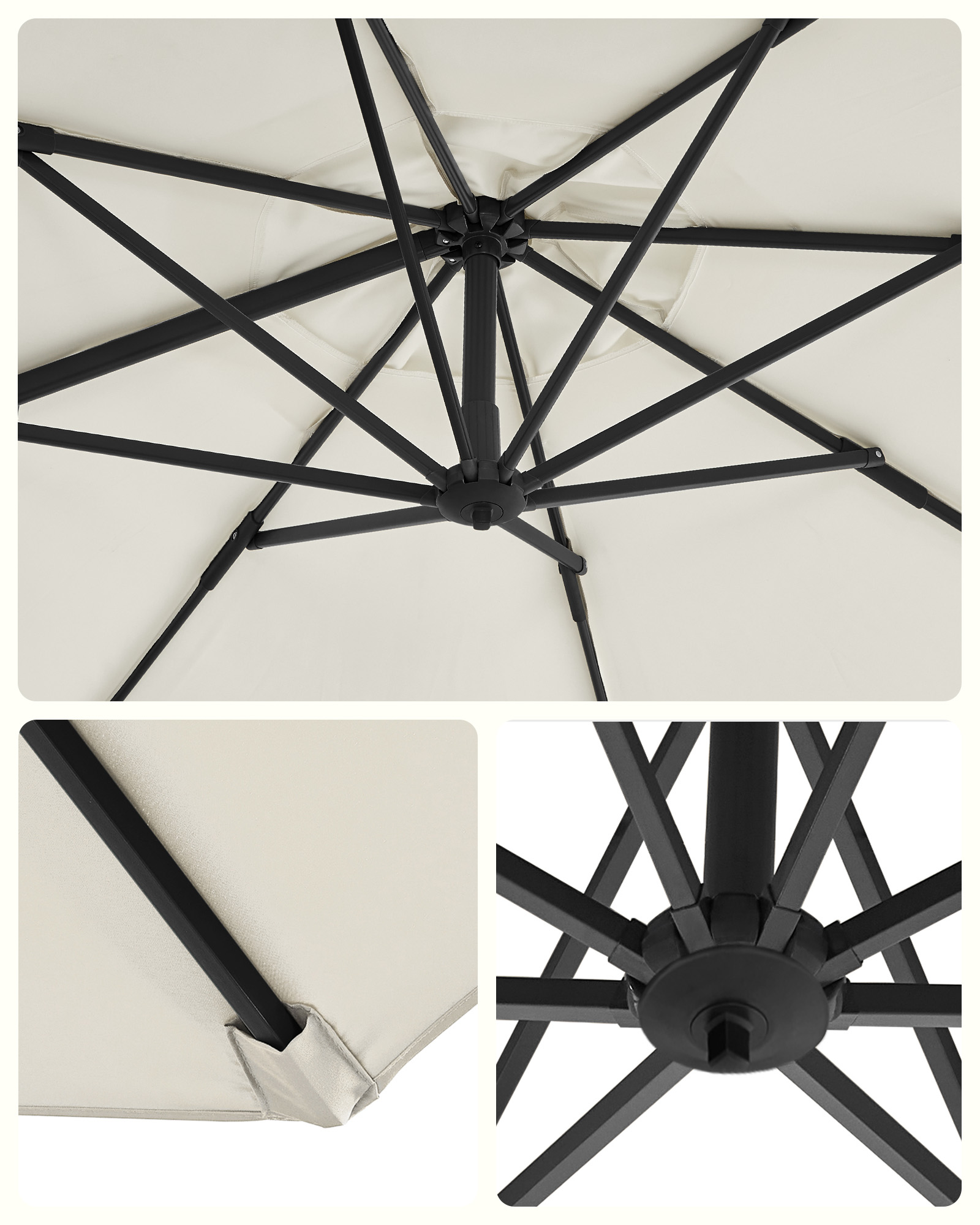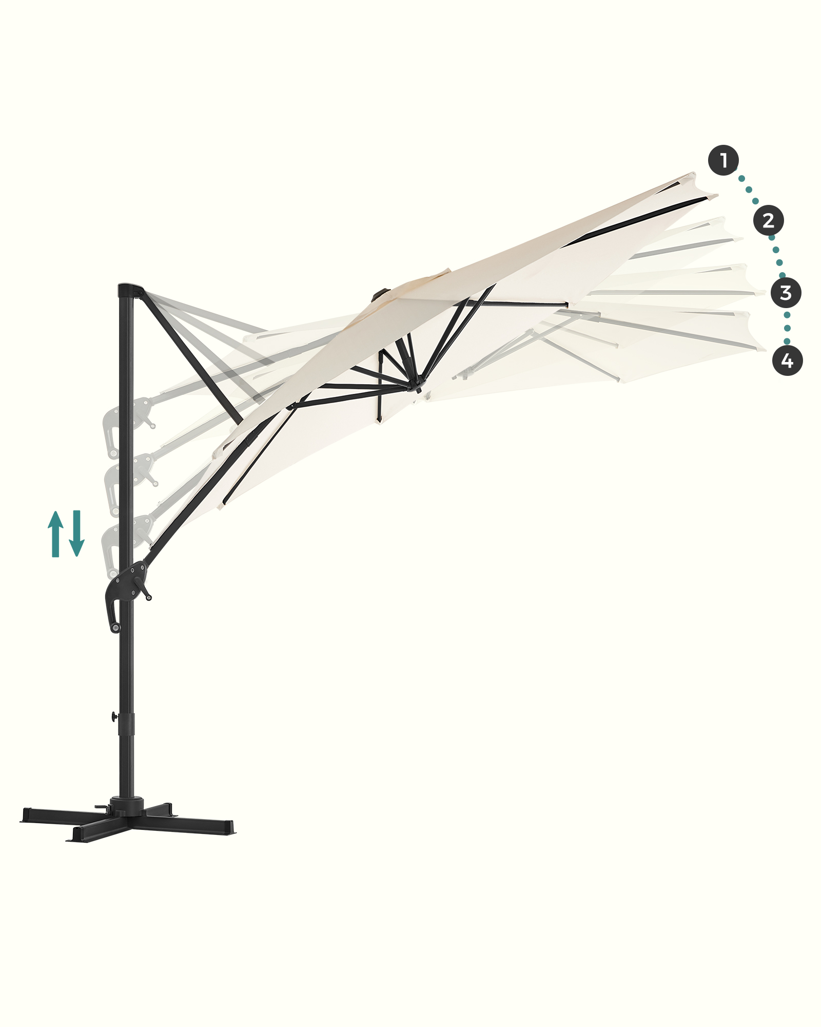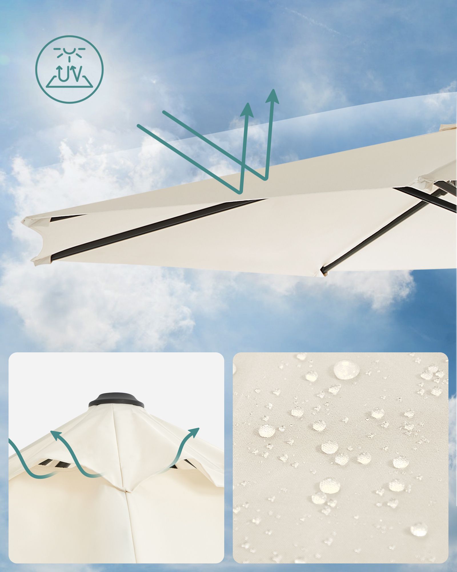 Lämmin aurinko, sininen taivas, raikas ilma, kaunis luonto… Mitä vielä odotat? Aika rentoutua ulkona! Pelkäätkö voimakkaita auringon säteitä? Älä huoli. Avaa vain tämä SONGMICS:n Ø 3 m aurinkovarjo ja nauti kauniista säästä varjossa! Unohtumaton kesä: Haluatko ottaa nokoset puutarhassa, syödä terassilla ystävien kanssa tai nauttia kahvitauosta perheen kanssa ulkona, mutta pelkäät kirkasta auringonvaloa? Tarvitset vain aurinkovarjon! Varjomme on valmistettu 240 g/m² polyesterikankaasta ja tarjoaa erinomaisen UV-suojan jopa UPF 50+. Näin sinun ei tarvitse huolehtia siitä, että kirkas valo satuttaa silmiäsi ja punoittaa ihoasi. Seuraa aurinkoa: Vietätkö mielelläsi koko sunnuntain parvekkeella lukemassa hyvää kirjaa, jotta voit rentouttaa mielesi ja paeta arjen stressiä? Sinun ei tarvitse siirtää aurinkovarjoa jatkuvasti pysyäksesi varjossa! Paina poljinta ja käännä sateenvarjon masto, jotta sateenvarjo osoittaa toiseen suuntaan. Säädä sateenvarjon kallistuskulmaa sivussa olevalla kahvalla, kun aurinko siirtyy. Tuotetiedot:Väri: beige Materiaali: alumiininen aurinkovarjon varsi, metalliset aurinkovarjon säteet, 240 g/m² polyesterikangas Aurinkovarjon halkaisija: 3 m Korkeus: 2,5 m Paino: 18,5 kg Toimitus sisältää: 1 x aurinkovarjo 1 x jalusta 1 x ohjeet SONGMICSin ohjeet: Älä avaa aurinkovarjoa väkisin, vaan avaa se varovasti ja hitaasti.Sulje aurinkovarjo tuulisina päivinä vahingoittumisen estämiseksi. Aseta painavat esineet (ei sisälly toimitukseen) jalustalle tuotteen vakauden varmistamiseksi.