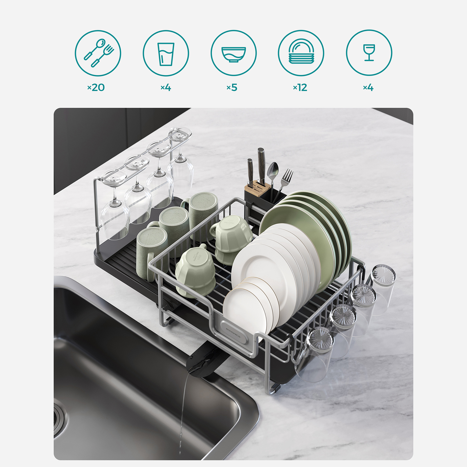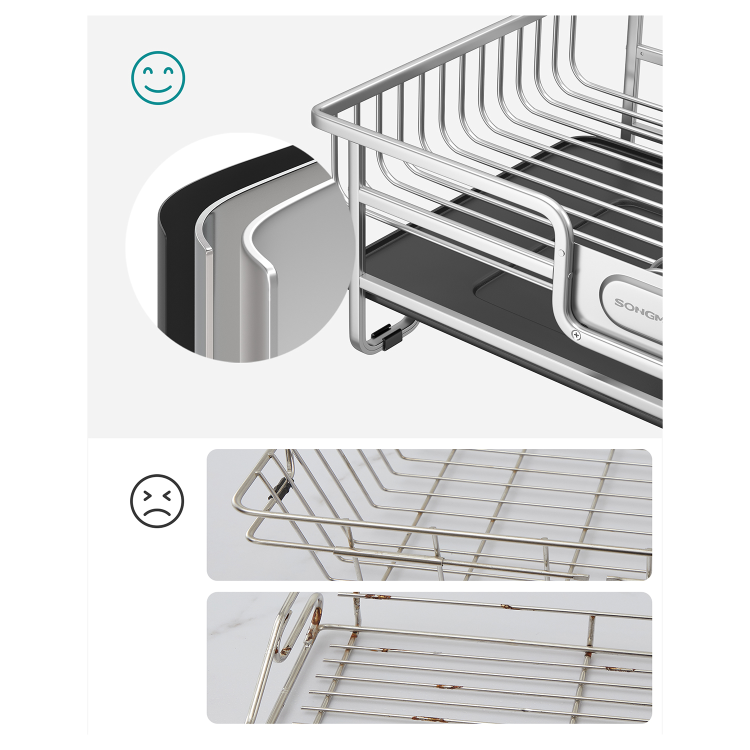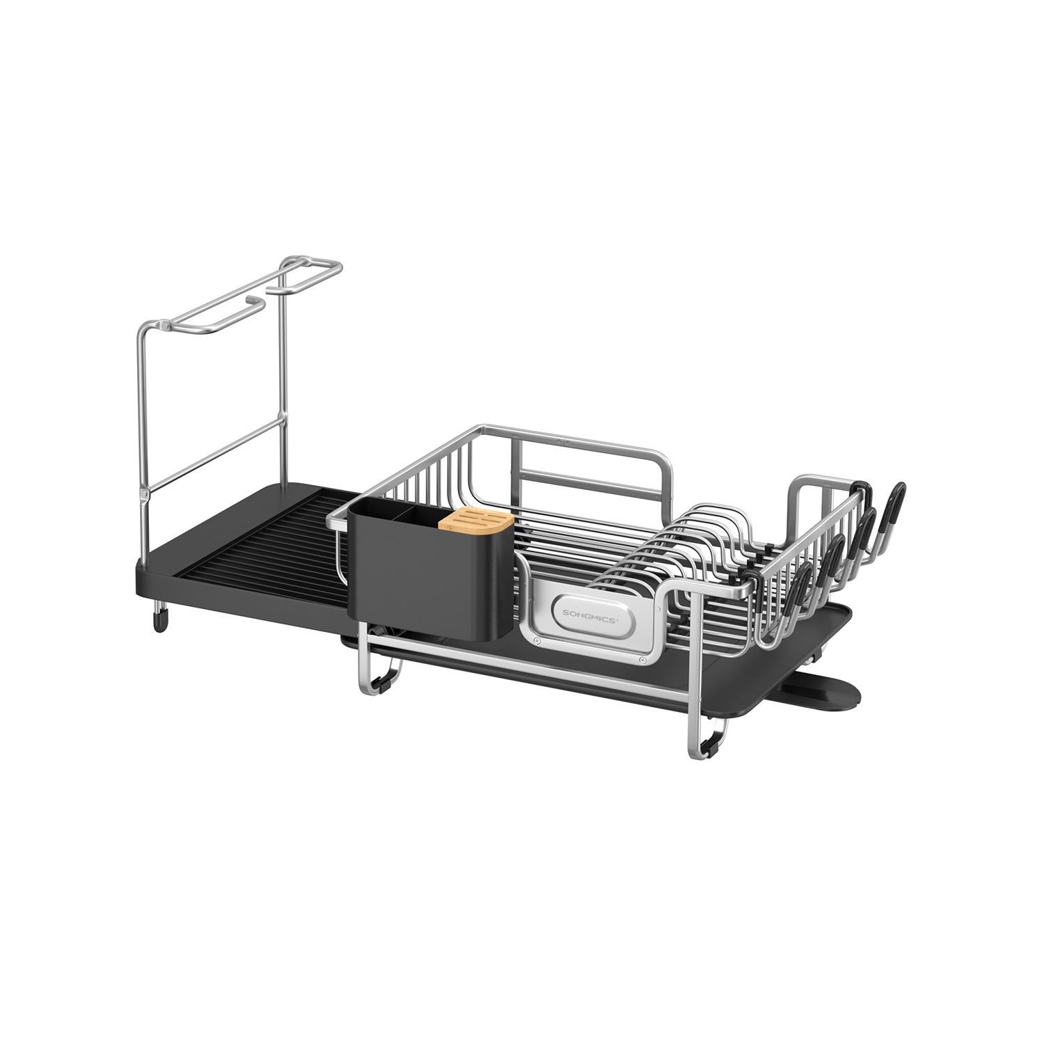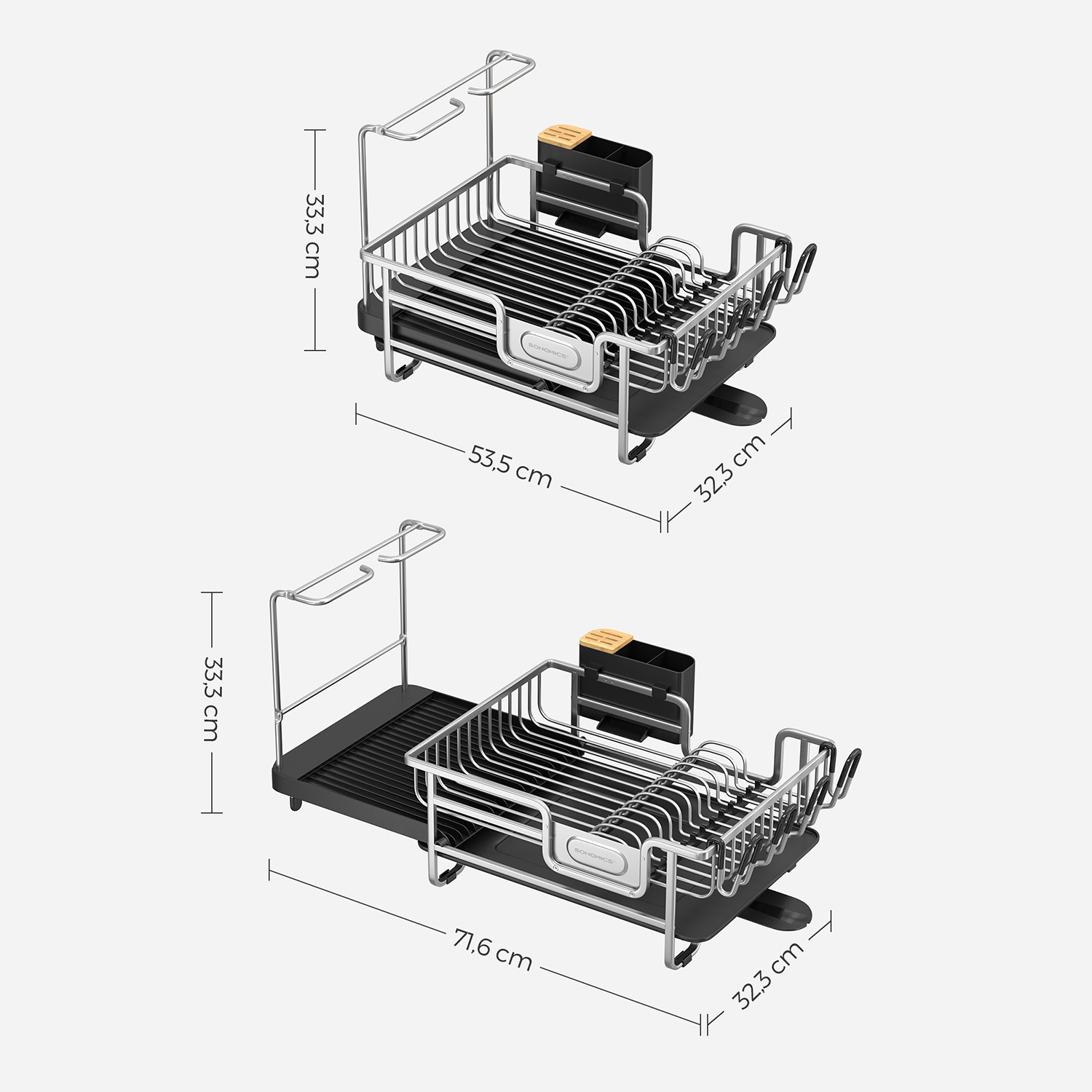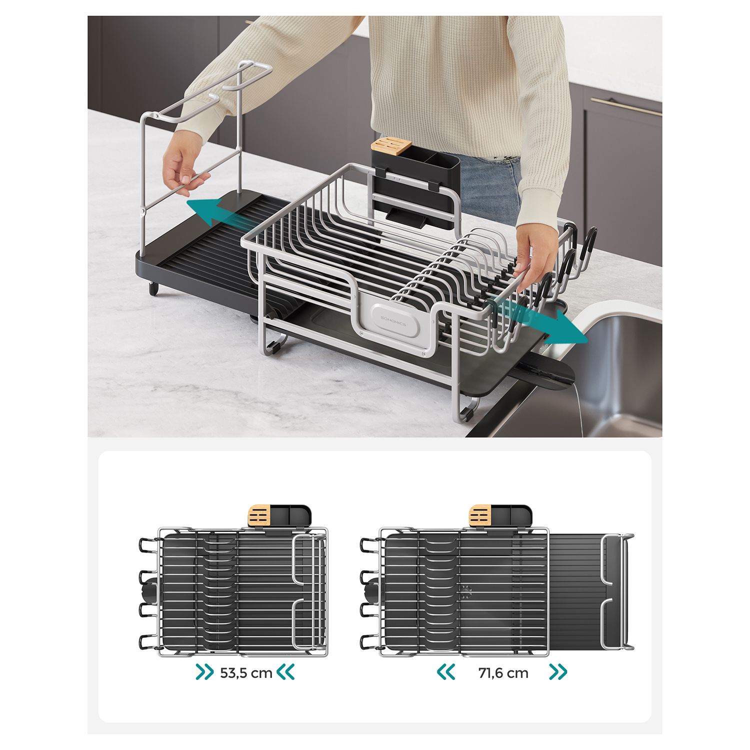 Laajennettava ja mukautettava muotoilu: Tässä astiankuivaushyllyssä on tippakaukalo, jonka pituutta voi säätää 53,5 cm:stä 71,6 cm:iin. Näin voit säätää tippakaukalon kokoa, jotta saat lisää säilytystilaa tai säästät tilaa keittiön työtasolla. Tippakaukalon alla oleva 360 astetta kääntyvä kaatonokka mahdollistaa sen sijoittamisen astiankuivaushyllyn pidemmälle tai lyhyemmälle sivulle, jotta vesi voi valua pesualtaaseen kummaltakin puolelta.Laadukas suorituskyky: Vankka alumiinirunko on ruostumaton ja eloksoitu, harjattu pinta kestää öljyä ja sormenjälkiä, joten voit pitää sen puhtaana vähällä huollolla. PP-muovista valmistettu tippakaukalo, jossa on erityinen pinnoite, jakaa veden tehokkaammin kuivattamiseksi.Tuotetiedot: Väri: hopeanmusta Materiaali: alumiini, PP-muovi Koko: (53,5-71,6) x 32,3 x 33,3 cm (P x L x K) Paino: 2 kg Toimitus sisältää: 1 x astiankuivaushylly 1 x lisävarustepaketti 1 x ohjeet