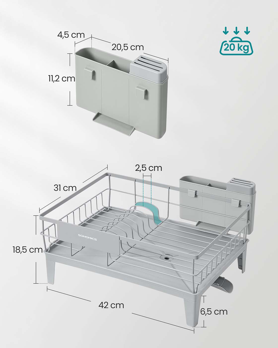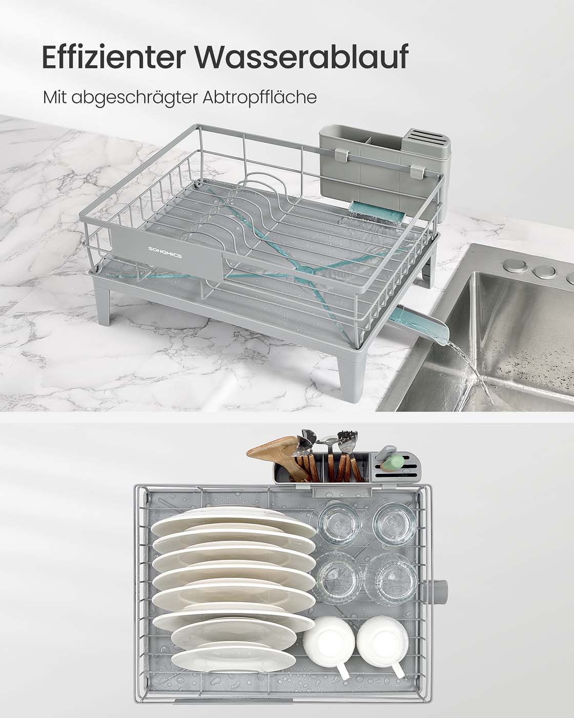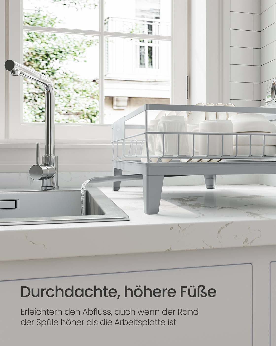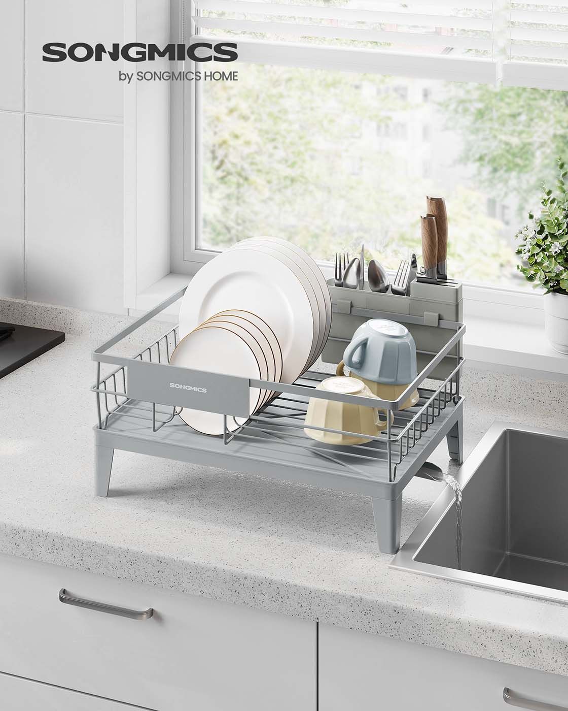 SONGMICS astiankuivaushylly, astiankuivausjalusta, 360° kääntyvä ja ulosvedettävä valutus, valutusastia, ruokailuvälineiden pidike, keittiö, 31 x 42 x 18,5 cm, musta KCS550B01