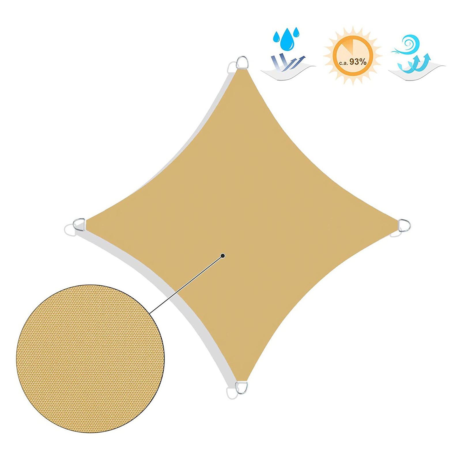 SONGMICS aurinkopurje – aika harkitulle aurinkosuojalle. Kaikkialla. Kun rentoudut kauniina kesäpäivänä puutarhatuolissasi ja katsot uutta aurinkopurjetta juuri ennen kuin suljet silmäsi, unelmoit varmasti jännittävästä purjehduksesta eksoottisiin maihin. Älä huoli, jos pieni päiväunesi ulkona kestää hieman kauemmin. Suuri aurinkosuoja päälläsi suojaa erinomaisesti UV-säteilyltä. On selvää, että tämä purje sopii täydellisesti puutarhaan, terassille tai parvekkeelle. Käytä sitä esimerkiksi myös suojaamaan lastesi yksityistä leikkikenttää tai uima-allasta auringolta, sillä lasten iho on erityisen herkkä UV-säteilylle.Aurinkopurje on myös uskollinen kumppani leirintäalueella. Kiinnitä se esimerkiksi asuntovaunun oviaukon eteen ja muokkaa siitä eräänlainen eteisteltta. Aurinkopurje sopii täydellisesti myös suojaamaan perhettäsi ja ystäviäsi, jotka istuvat nälkäisinä grillin ääressä, liialta auringonvalolta.Harkitse aurinkoseilaa myös, jos haluat varustaa liiketilasi, kuten kahvilan tai ravintolan ulkotilan, riittävällä aurinkosuojalla. Näin asiakkaasi voivat nauttia erikoisuuksistasi varjossa. Tätä aurinkoseilaa voidaan siis käyttää joustavasti monissa eri paikoissa. Mihin aiot ripustaa sen? Tuotetiedot:Väri: hiekka Materiaali: polyesteri (160 g/m²) Koko: 3,6 x 3,6 m Paino: 2,5 kg Toimitus sisältää: 1 x aurinkopurje ja laukku 4 x kiinnitysköysi SONGICSin ohjeet: Kallista kangasta 25 astetta, jotta sadevesi valuu pois sujuvasti.Säilytä aurinkopurje suojaisessa paikassa myrskyn aikana tai talvella. Puhdista purje miedolla puhdistusaineella tai vedellä. Älä missään tapauksessa käytä kovaa harjaa tai kemiallisia nesteitä. Varo ripustamasta purjetta väärin päin.