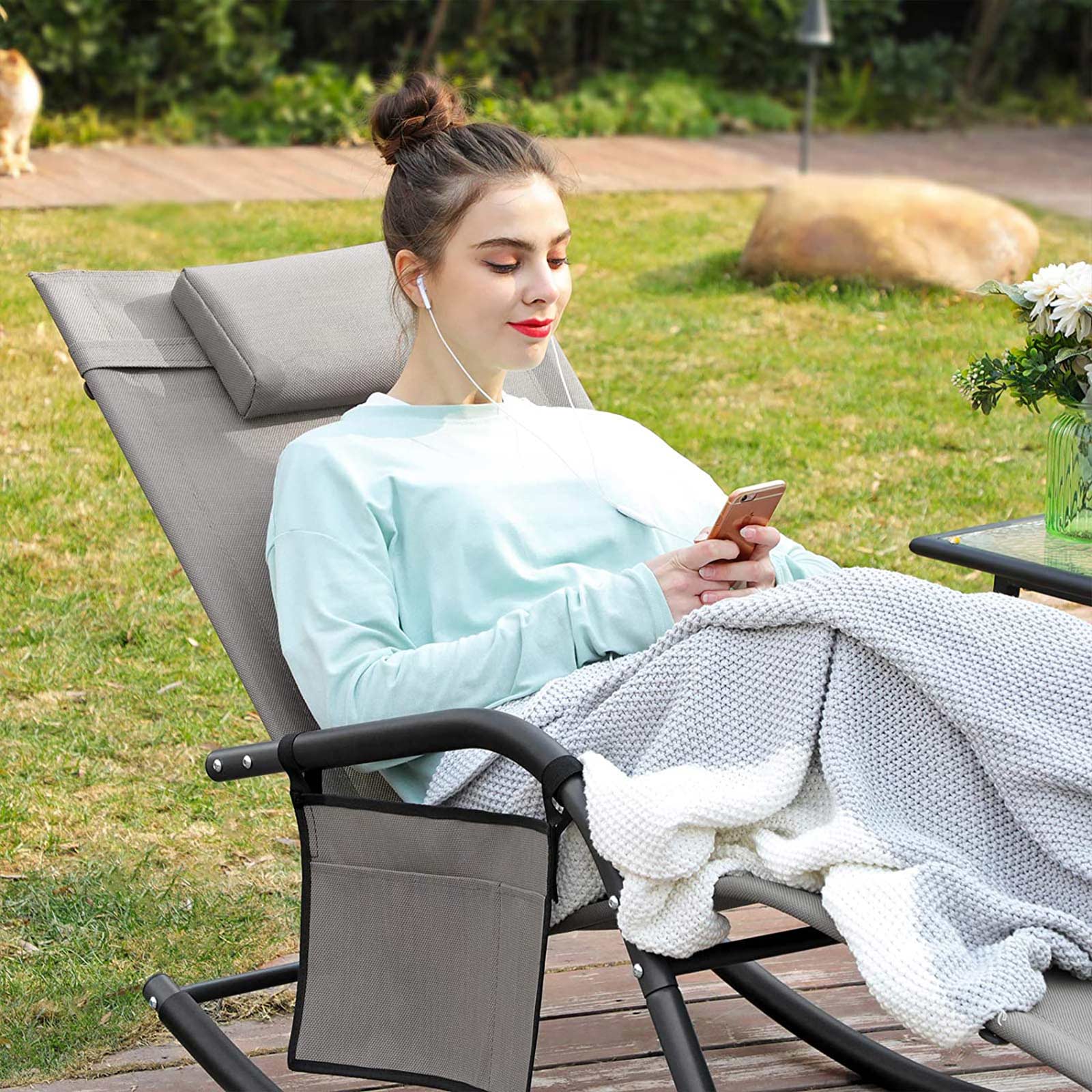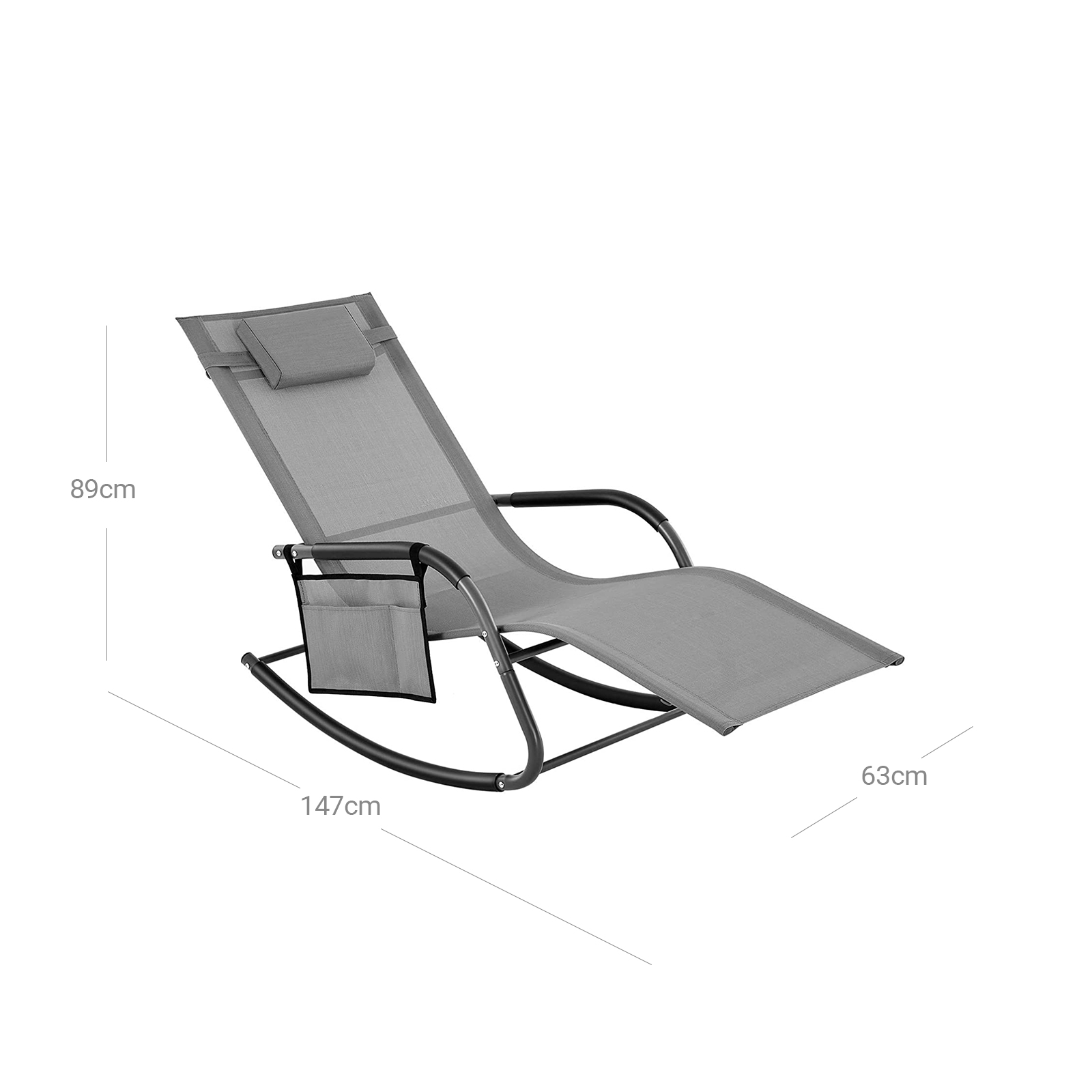 Etsitkö aurinkotuolia, jossa voit rentoutua puutarhassa lämpiminä kesäpäivinä ja nauttia raikkaasta ilmasta? Tämä SONGMICS-keinutuoli tulee apuusi! Ah! Mikä nautinto! Istu tähän keinutuoliin, nojaa taaksepäin ja keinua rennosti edestakaisin. Laadukkaasta synteettisestä kuitukankaasta valmistettu makuualusta on hengittävä ja tuntuu miellyttävältä, ja korkealaatuinen rautakehys takaa pitkän käyttöiän. Kätevät käsinojat, pehmeä pääntuki ja irrotettava säilytyslaukku – tämä puutarhatuoli tarjoaa sinulle täydellisen rentoutumispaikan, jossa voit nauttia viileitä juomia kesällä tai katsella kaunista auringonlaskua. Aseta tämä keinutuoli nyt puutarhaan ja tee olosi mukavaksi! Tuotetiedot: – Väri: harmaa – Materiaali: rautakehys, synteettinen kuitukangas – Kokonaiskoko: 63 x 147 x 89 cm (P x L x K) – Pakkauksen koko: 97 x 38 x 8 cm – Paino: 10,3 kg – Maks. staattinen kantavuus: 150 kg Toimitus sisältää: – 1 x keinutuoli – 1 x ohjeet (DE, EN, FR, ES, IT) SONGMICS-ohjeet: – Keinutuolin maksimaalinen kantavuus on 150 kg. Älä ylitä tätä enimmäispainoa. – Suojaa tuote sateelta; älä altista keinutuolia voimakkaalle auringonvalolle pitkäksi aikaa.