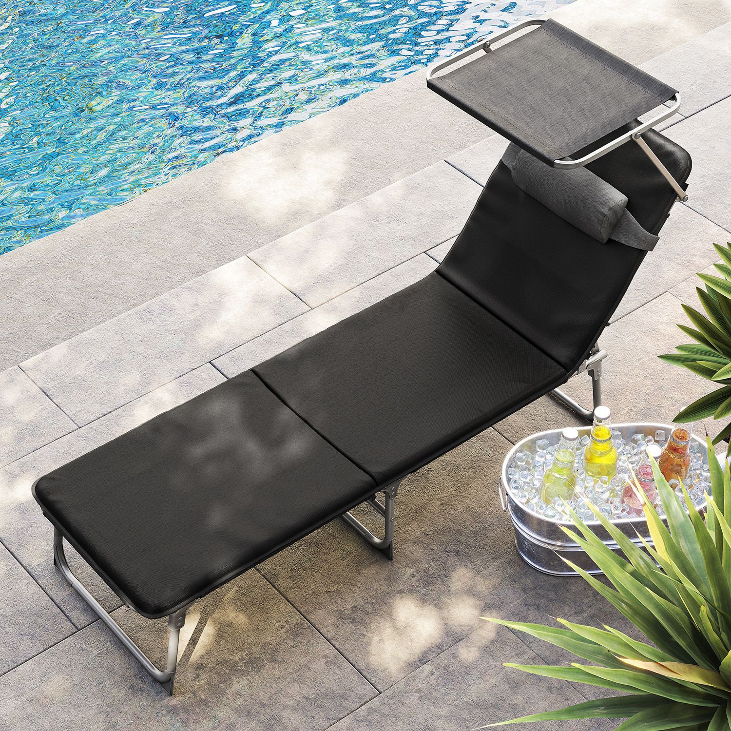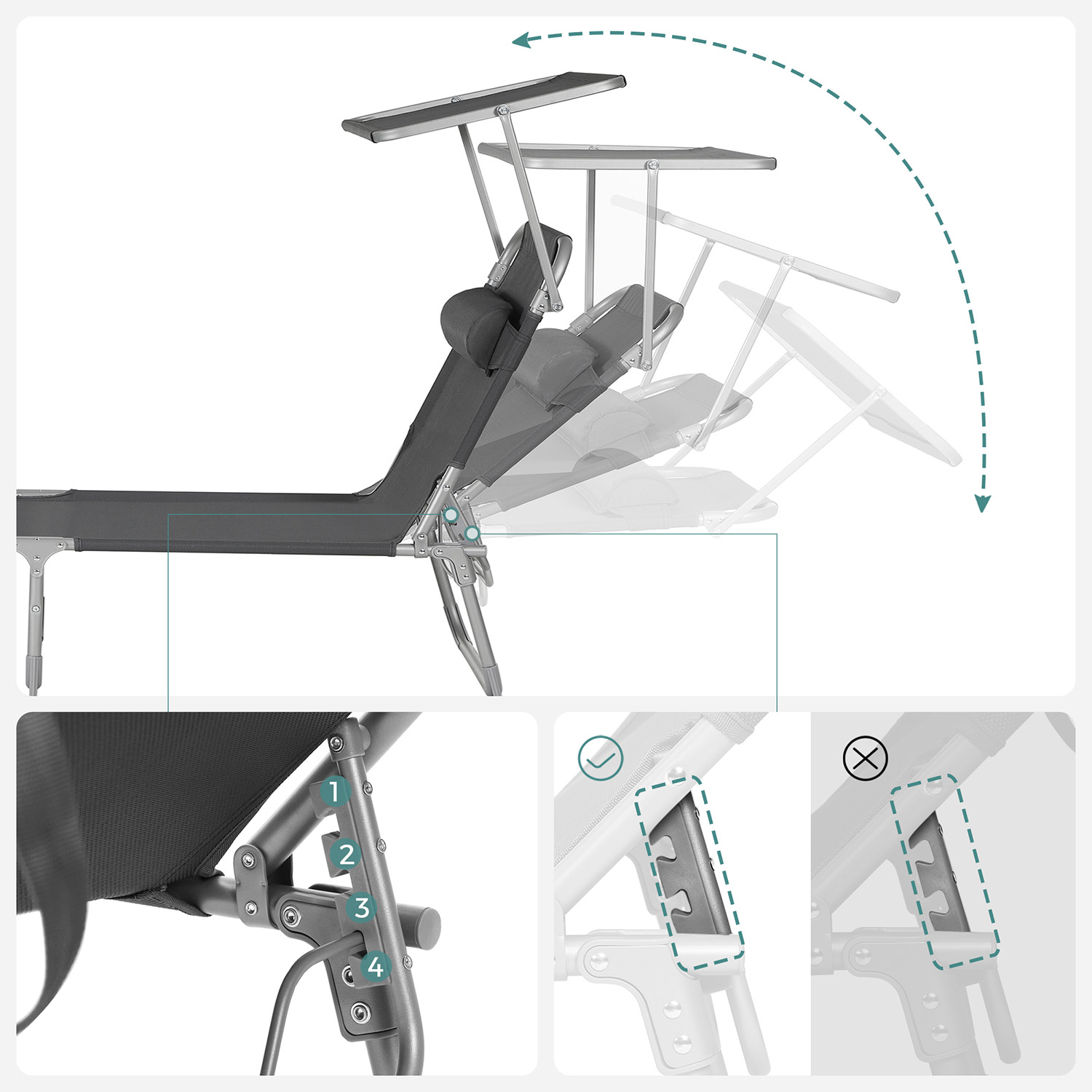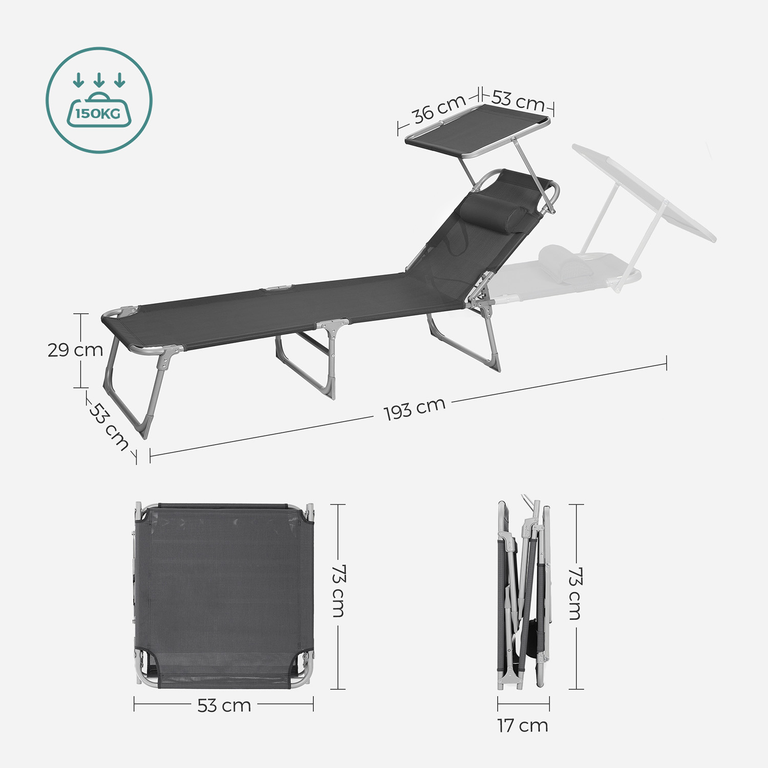 Rento ilmapiiri! Olipa kyseessä terassi, parveke tai puutarha, tämä taitettava aurinkotuoli on täydellinen sisustuselementti, joka luo rennon ilmapiirin. Näin voit tuntea olosi kuin olisit lomalla rannalla, vaikka oletkin kotona. Ei mitään tekemistä! Kuka haluaa koota tämän aurinkotuolin? Kukaan… Älä huoli, SONGMICSilla oli hyvä idea! Sinun tarvitsee vain avata se, ja saat aurinkotuolin aurinkokatoksella täydellisiin rentoutumisen hetkiin.Tuotetiedot: Väri: musta Materiaali: metalli, synteettinen kuitukangas Koko: 53 x 193 x 29,5 cm (P x L x K) Paino: 8,1 kg Maks. staattinen kantavuus: 150 kg Toimitus sisältää: 1 x aurinkotuoli katoksella SONGMICS-ohjeet: Aurinkotuolin suurin kantavuus on 150 kg. Älä ylitä tätä enimmäispainoa. Avaa aurinkotuoli kokonaan ennen käyttöä. Älä jätä tuotetta pitkäksi aikaa ulos; älä altista aurinkotuolia sateelle tai voimakkaalle auringonpaisteelle.