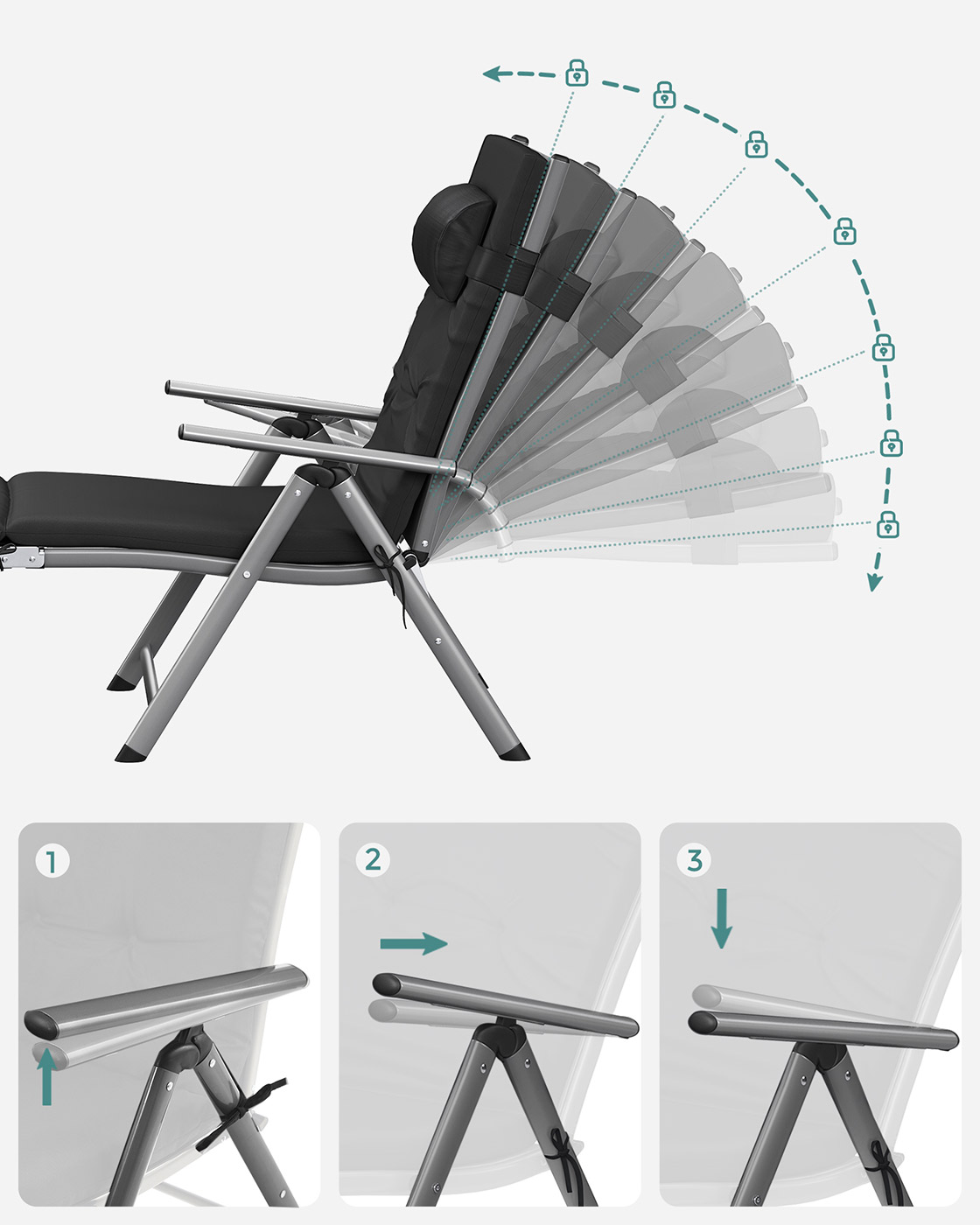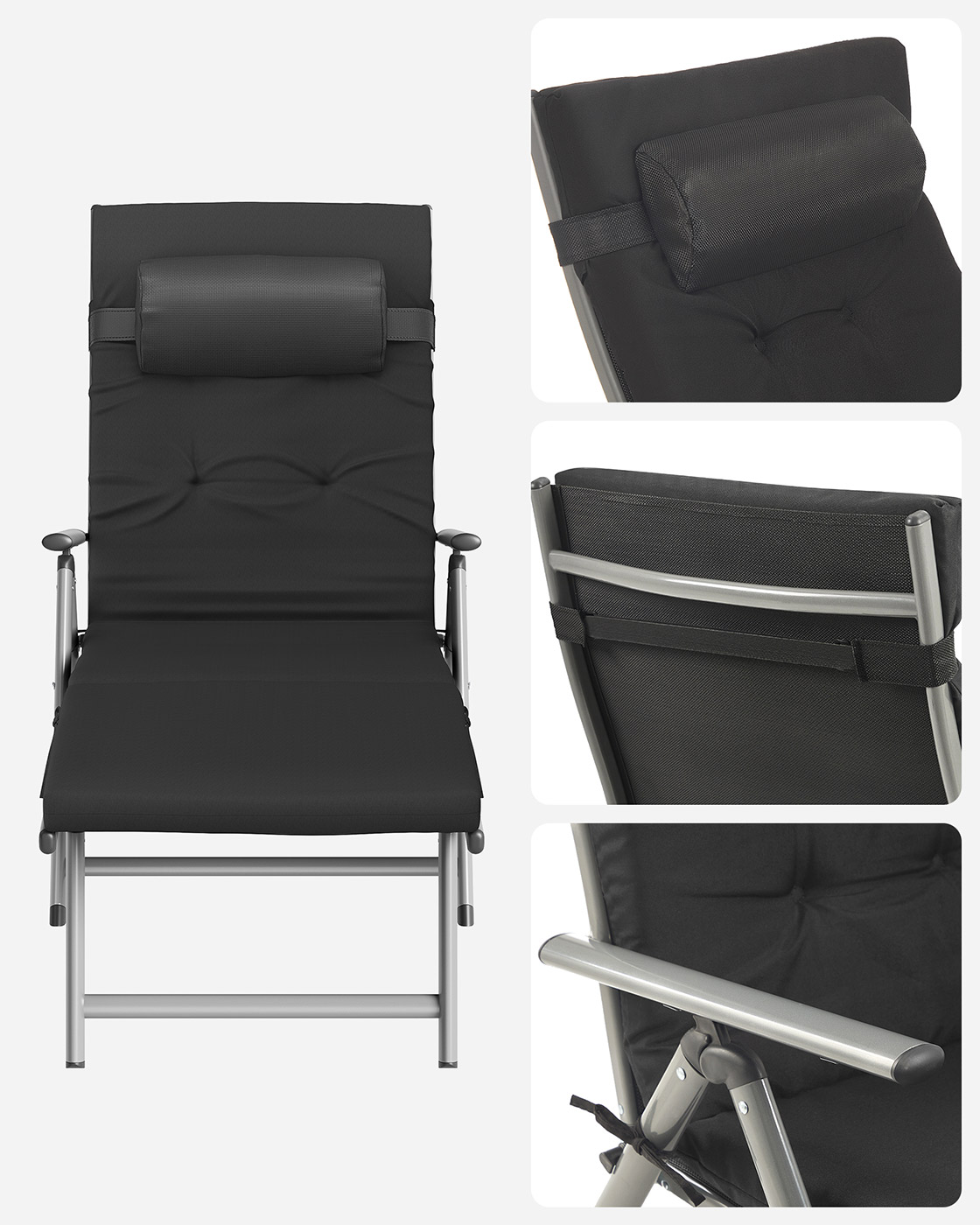 SONGMICS on kehittänyt sarjan ulkoilutuoleja, jotka lisäävät mukavuutta, kun rentoudut rannalla, leirintäalueella tai puutarhassa. Nauti lomastasi! Sopii kaikkialle Haluatko rentoutua puutarhassa kauniina kesäpäivänä? Tämä aurinkotuoli on täydellinen ratkaisu! Voit myös asettaa sen terassille tai rannalle aurinkovarjon alle ja viettää koko päivän meren rannalla perheen tai ystävien kanssa! Mukava ja käytännöllinen Tämä taitettava aurinkotuoli on erittäin mukava pehmeän 6 cm paksun patjan ansiosta, joka on kiinnitetty aurinkotuolille useilla nauhoilla. Lisäksi makuualusta on valmistettu hengittävästä synteettisestä kuitukankaasta. Voit myös säätää selkänojaa yksilöllisesti ja irrottaa päätytyynyn tarpeen mukaan. Nauti puutarhan rauhasta tällä aurinkotuolilla! Jos olet luonnon ystävä, tutustu myös muihin SONGMICS-ulkoilutuoleihin! Tuotetiedot:- Väri: musta – Materiaali: synteettinen kuitukangas, alumiinirunko, vaahtomuovi – Mitat: 183 x 60 x 39 cm (P x L x K) – Paino: 8 kg – Maks. kantavuus: 150 kg Toimitus sisältää: – 1 x taitettava aurinkotuoli – 1 x patja