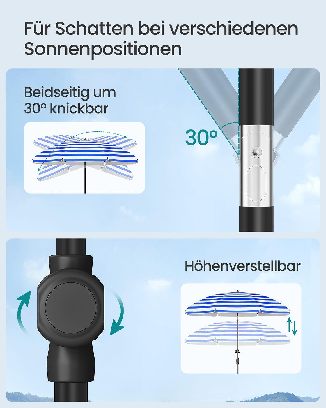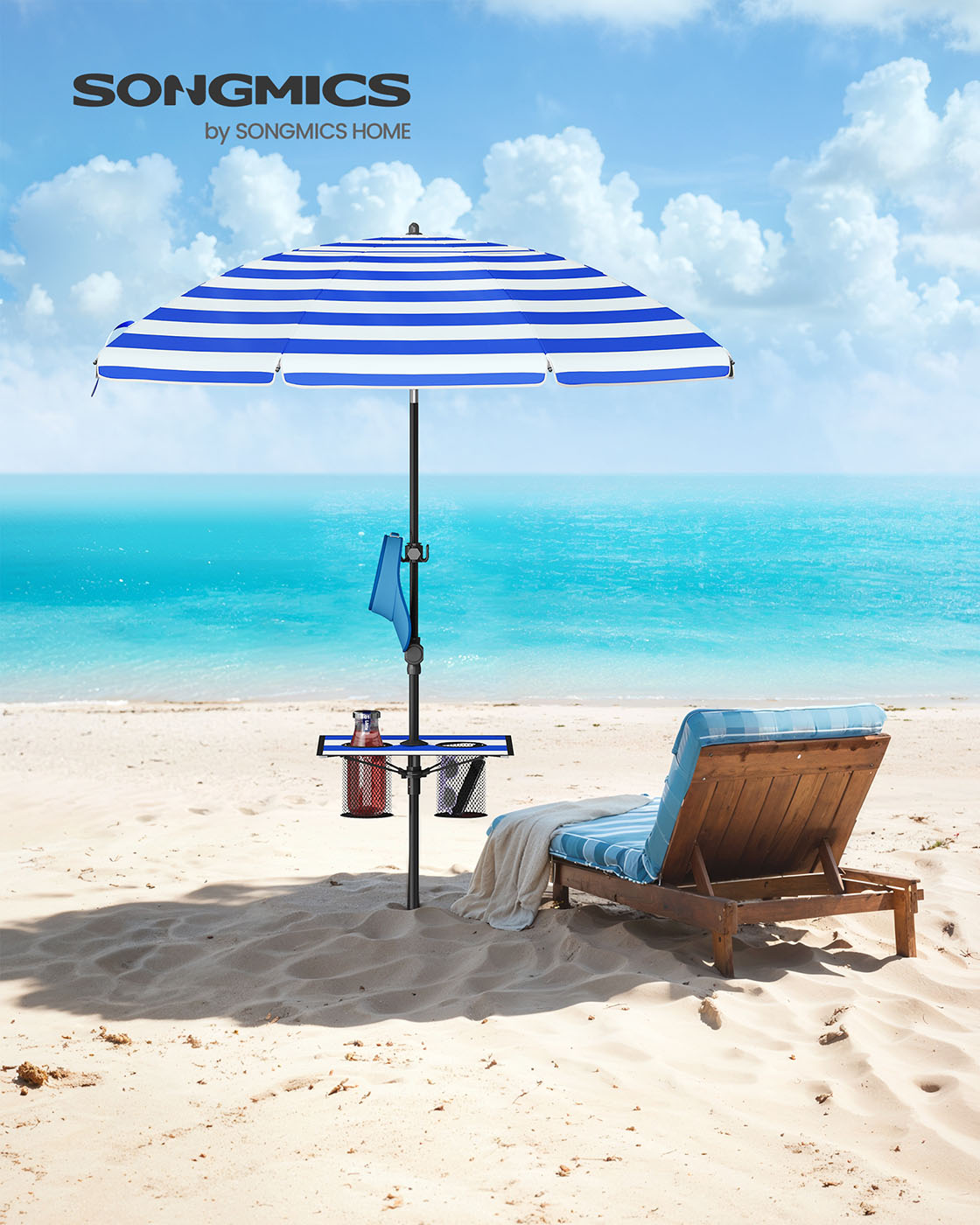 SONGMICS aurinkovarjo 160 cm, rantavarjo, aurinkosuoja UPF 50+, taivutettavissa 30° molemmin puolin, korkeussäädettävä, säilytystila, koukku, rannalle, puutarhaan, ilman jalustaa, sininen GPU0080Q01