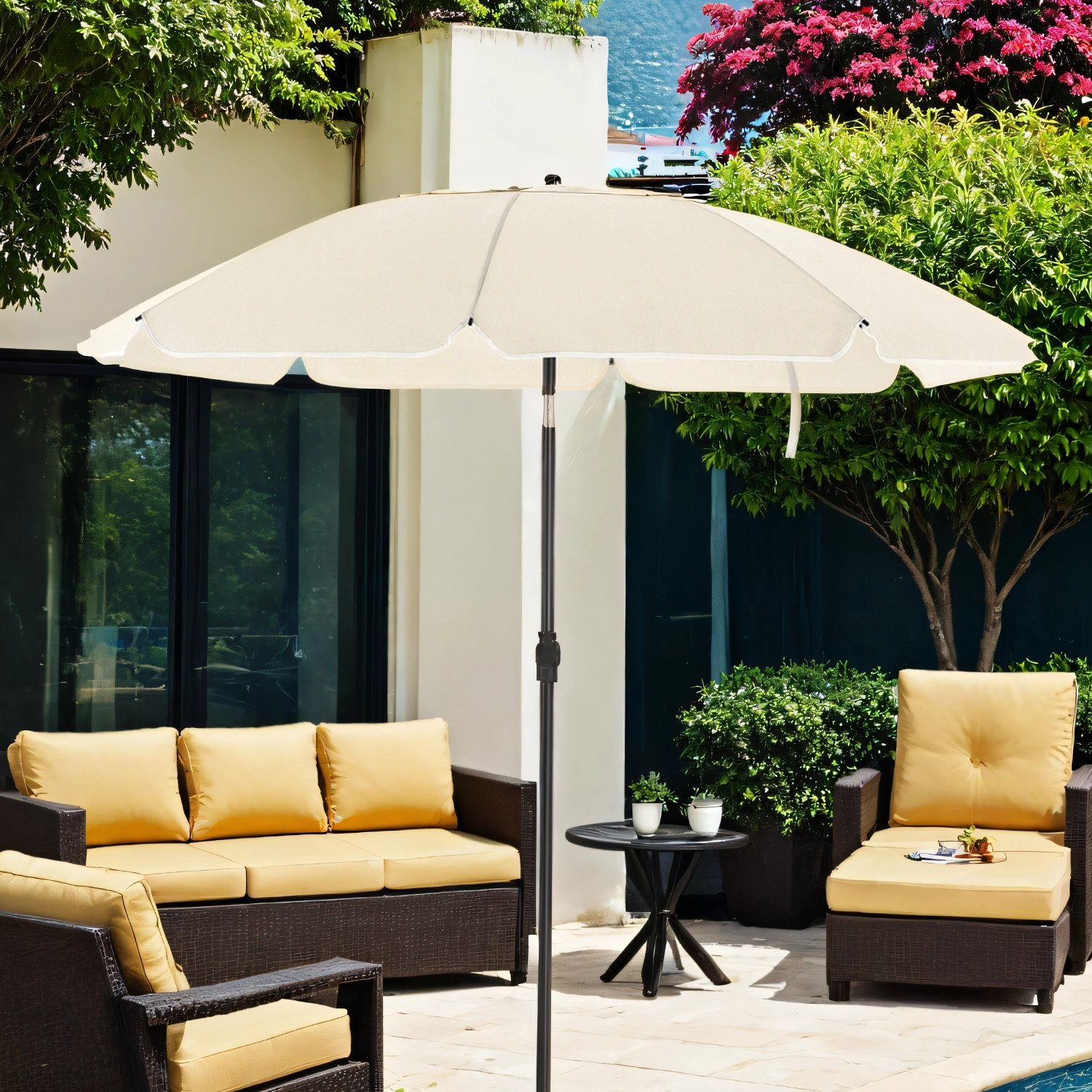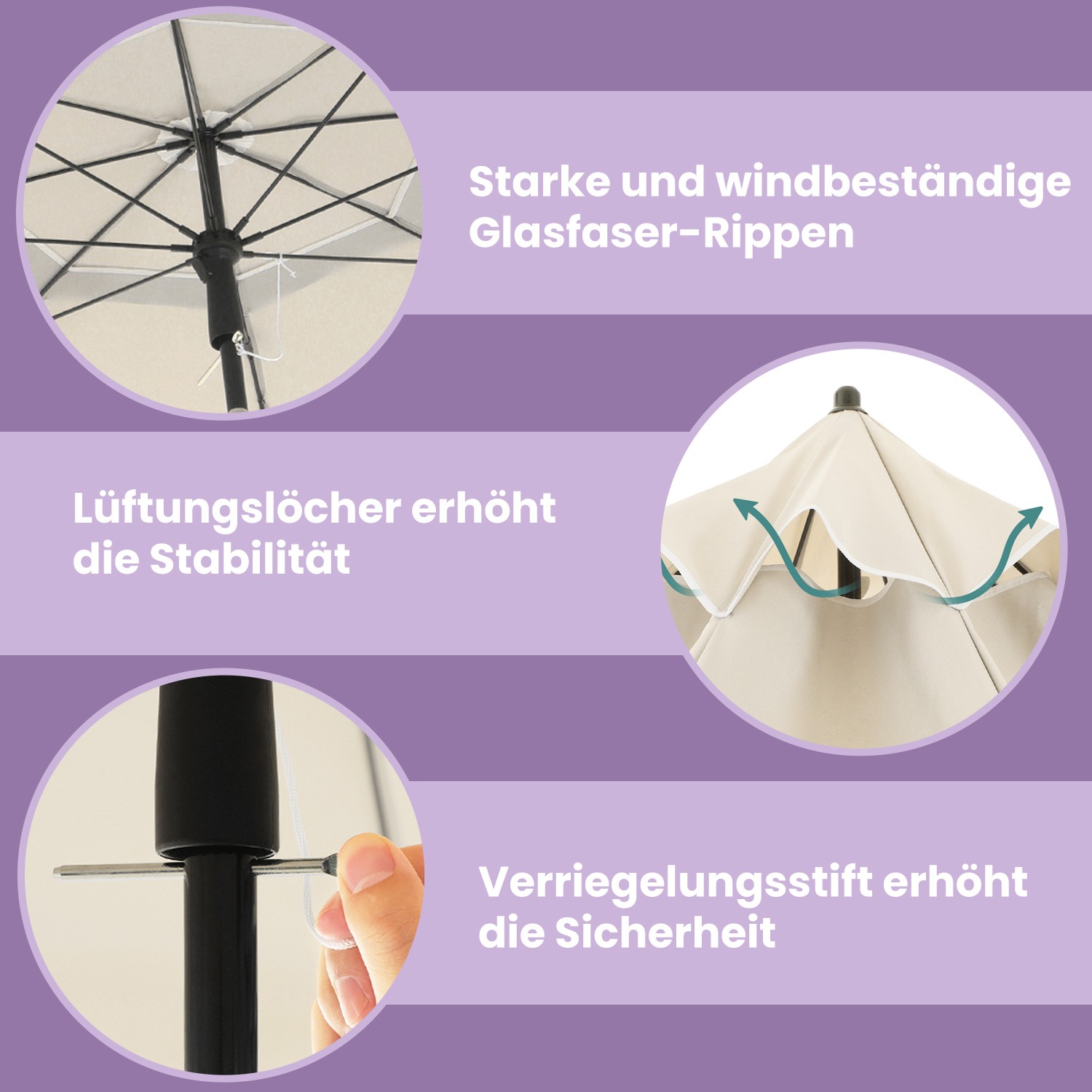Nauti kauniista säästä varjossa! Ulkouima-kausi on alkanut, ja on aika valloittaa puutarha, terassi tai ranta! Mutta varo! Muista hankkia riittävä aurinkosuoja! Kun vihdoin valloitat ulkotilasi takaisin pitkän, kylmän talven jälkeen ja kutsut ystäväsi grillijuhliin, on tullut täydellinen hetki ottaa käyttöön uusi SONGMICS-aurinkovarjosi! Kesän välttämätön varuste Tämä aurinkovarjo voidaan taivuttaa vasemmalle ja oikealle. Näin voit säätää sen kulloisenkin vuorokaudenajan ja valon tulokulman mukaan. Sateenvarjon halkaisija on 1,8 m ja korkeus 2,3 m. Sateenvarjon alle mahtuu siis 1–2 henkilöä. Sateenvarjon masto on ruostumatonta terästä. Lisäksi polyesteristä valmistettu suojakangas tarjoaa erinomaisen UV-suojan jopa UPF 50+ -tasolle asti. Tuotetiedot: Väri: beige Materiaali: sateenvarjon masto jauhemaalattua terästä, 160 g/m² polyesterikangas PA-pinnoitteella, sateenvarjon säteet lasikuitua Kaarevuuden pituus: 2,2 m Vaakasuora halkaisija: 2 m Paino: 2 kg Toimitus sisältää: 1 x sateenvarjo 1 x kuljetuslaukku 1 x turvalukko SONGMICSin huomautukset:Sateenvarjotelinettä ei toimiteta mukana. Älä avaa sateenvarjoa väkisin, vaan avaa se varovasti ja hitaasti. Sulje sateenvarjo yöllä, kovalla tuulella tai sateisella säällä vahingoittumisen estämiseksi.Suojaa sateenvarjo suojapeitteellä (ei sisälly toimitukseen), jotta se kestää pidempään. Sulje sateenvarjo hitaasti, jotta sormesi eivät jää puristuksiin.
