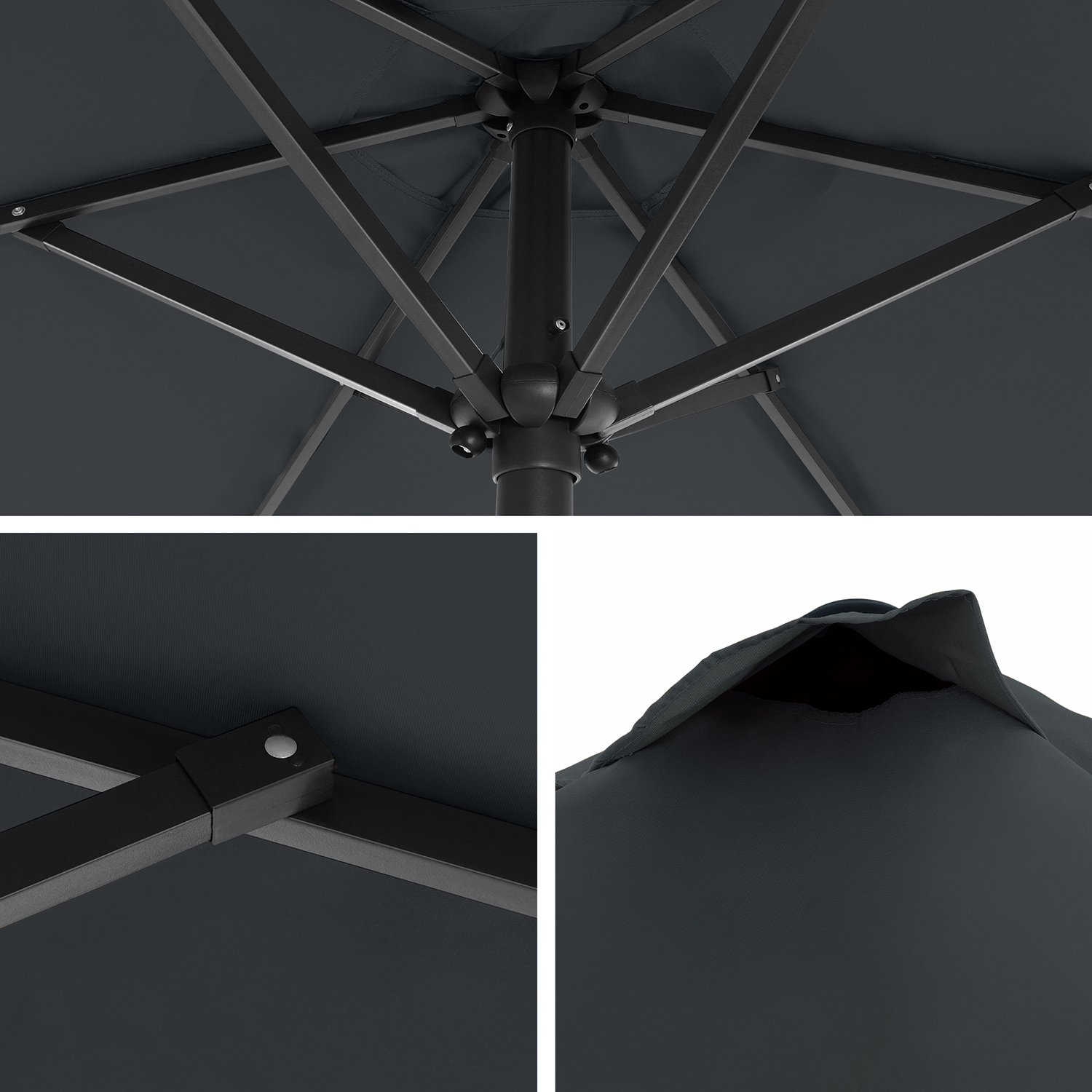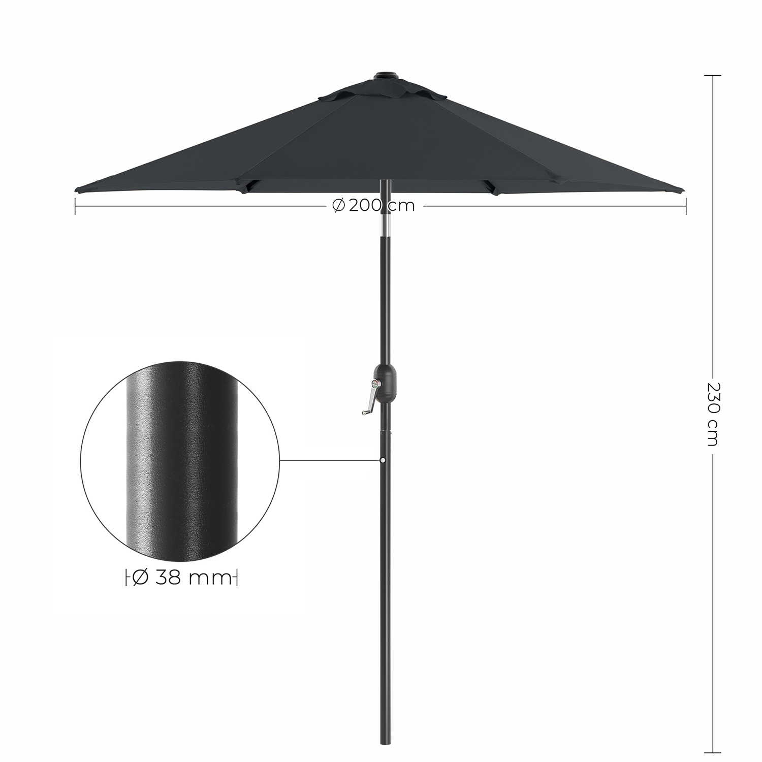 Lämmin aurinko, sininen taivas, raikas ilma, kaunis luonto… Mitä vielä odotat? Aika rentoutua parvekkeella! Pelkäätkö voimakkaita auringon säteitä? Älä huoli. Avaa vain tämä SONGMICS-aurinkovarjo ja nauti kauniista säästä varjossa! Tässä ovat tämän aurinkovarjon kohokohdat: – 180 g/m² polyesterikankaasta valmistettu kangas tarjoaa erinomaisen UV-suojan UPF 50+ asti – Laadukas metallinen taivutusmekanismi takaa pitkän käyttöiän – Tukeva metallinen varjostimen varsi takaa hyvän vakauden ja antaa parvekkeellesi modernin ilmeen – 6 suorakulmaista varjostimen ripaa antavat varjostimelle vahvan tuen- Sateenvarjo on helppo avata ja sulkea kätevän vipukahvan avulla. – Sateenvarjon varsi koostuu kahdesta tangosta, jotka on helppo ruuvata yhteen. – Yläosan tuuletusaukkojen ansiosta sateenvarjo pysyy vakaana myös kevyessä tuulessa. Tuotetiedot:- Väri: harmaa – Materiaali: metallinen aurinkovarjo, 180 g/m² polyesterikangas – Aurinkovarjon halkaisija: 2 m – Korkeus: 2,3 m – Paino: 3,5 kg Toimitus sisältää: – 1 x aurinkovarjo – 1 x ohjeet SONGMICSin huomautukset:- Varjostimen jalustaa ei toimiteta mukana. – Älä avaa varjostinta väkisin, vaan avaa se varovasti ja hitaasti. – Sulje varjostin yöllä, kovalla tuulella tai sateisella säällä vahingoittumisen estämiseksi. – Suojaa varjostin suojapeitteellä (ei sisälly toimitukseen), jotta se kestää käytössä pidempään.