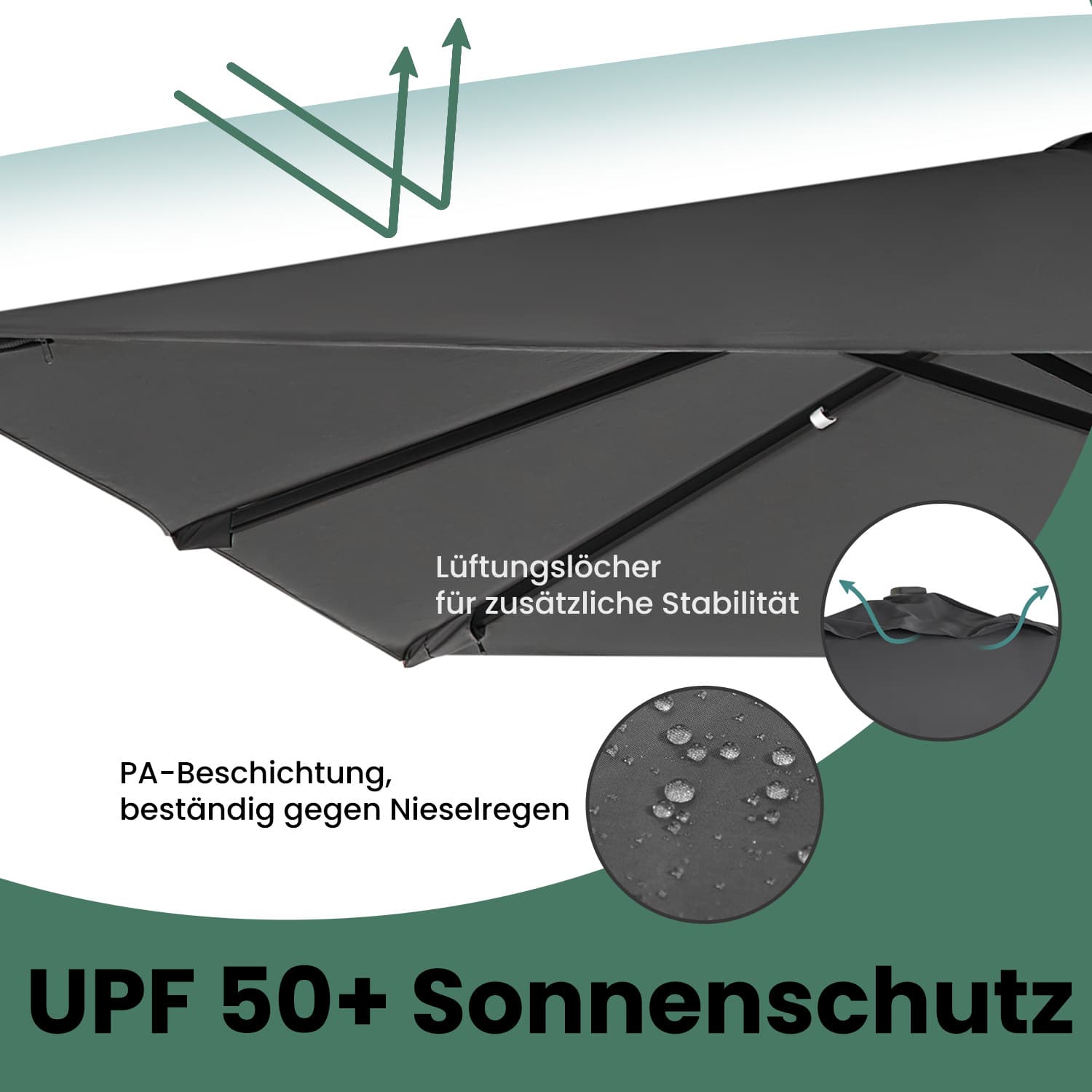 Erinomainen aurinkosuoja: Terassivarjo tarjoaa erinomaisen UV-suojan (UPF 50+) ja estää yli 98 % UV-säteistä.