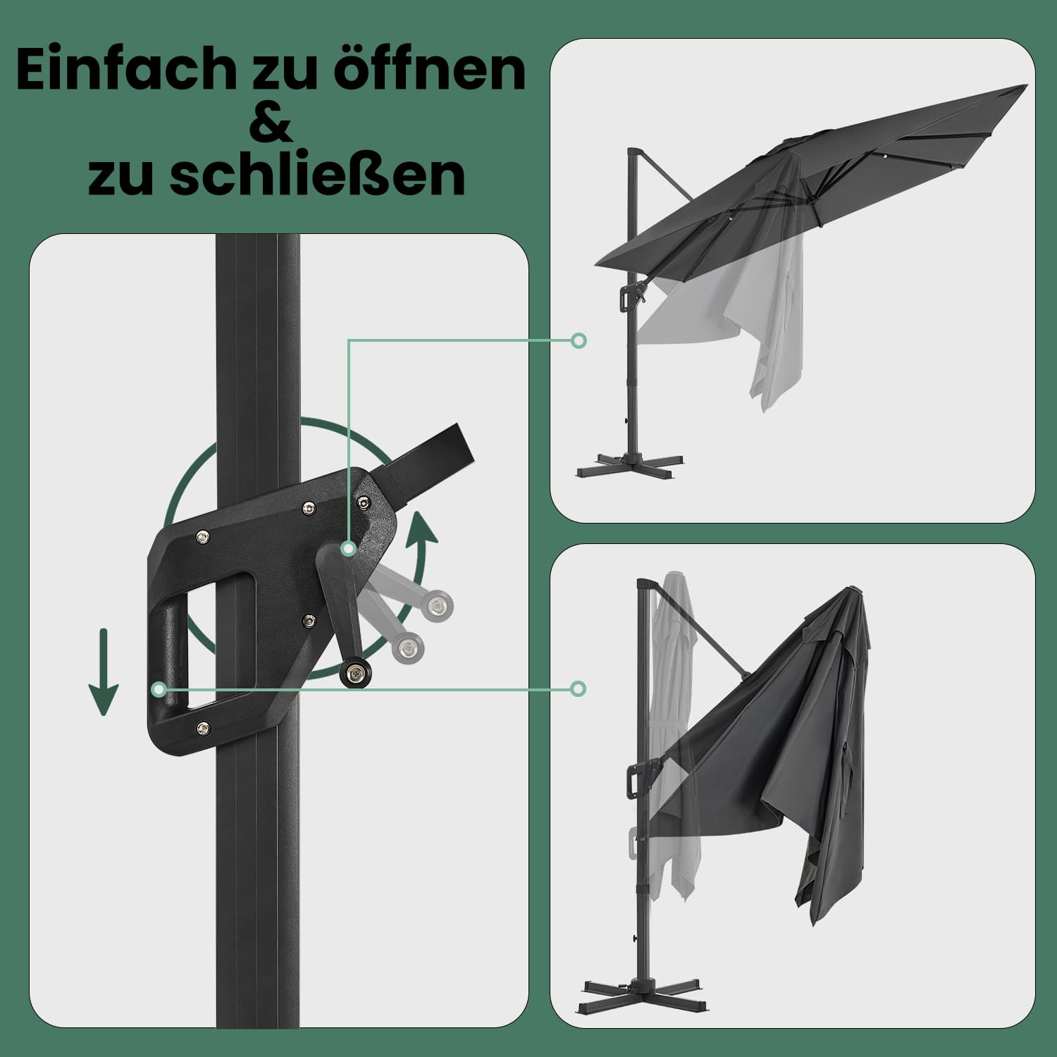 Helppo avata ja sulkea: Käännä kahvasta avataksesi ja sulkeaksesi puutarhavarjon.