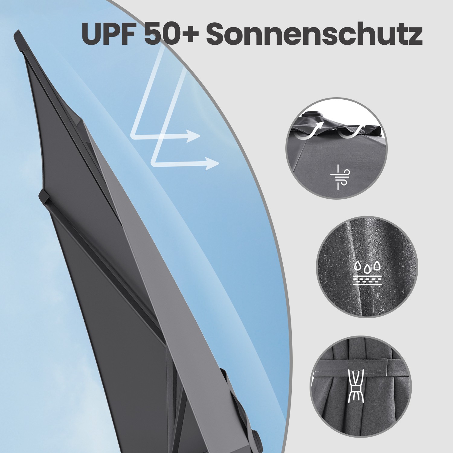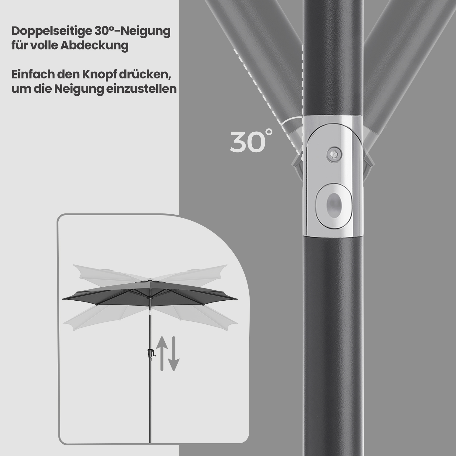 Nauti kauniista säästä varjossa! Ulkona vietettävä kausi on alkanut, ja on aika valloittaa puutarha, terassi tai ranta! Mutta varo! Muista hankkia riittävä aurinkosuoja! Kun vihdoin valloitat ulkotilasi takaisin pitkän, kylmän talven jälkeen ja kutsut ystäväsi grillijuhliin, on tullut täydellinen hetki käyttää uutta SONGMICS-aurinkovarjoasi! Kesän välttämätön varuste Tämä aurinkovarjo voidaan taivuttaa vasemmalle ja oikealle. Näin voit säätää sen päivänajan ja valon tulokulman mukaan. Varjon halkaisija on 3 m ja korkeus 2,4 m. Aurinkovarjon alle mahtuu siis 4–6 henkilöä. Aurinkovarjon masto on ruostumatonta terästä. Kestävä ja pitkäikäinen suojakangas UV-suojakangas (UPF 50+) on valmistettu 100 % polyesteristä, se on vettä hylkivä ja värinkestävä. Lisäksi siinä on muutamia tuuletusaukkoja. Näin puutarhaparapyyhe kestää paremmin tuulta. Suojakangas on irrotettava ja se voidaan pestä käsin. Tuotetiedot: – Väri: harmaa – Materiaali: jauhemaalattu teräs, 180 g/m² polyesteri – Korkeus: 2,4 m – Ø sateenvarjo: 3 m – Ø sateenvarjon varsi: 36/38 mm, seinämän paksuus: 1 mm – Paino: 6,2 kg Toimitus sisältää: – 1 x sateenvarjo SONGMICS Huomautukset:- Varjostimen jalustaa ei toimiteta mukana. – Sulje varjostin yöllä ja kovalla tuulella. – Tätä varjostinta ei suositella käytettäväksi sateisella säällä.