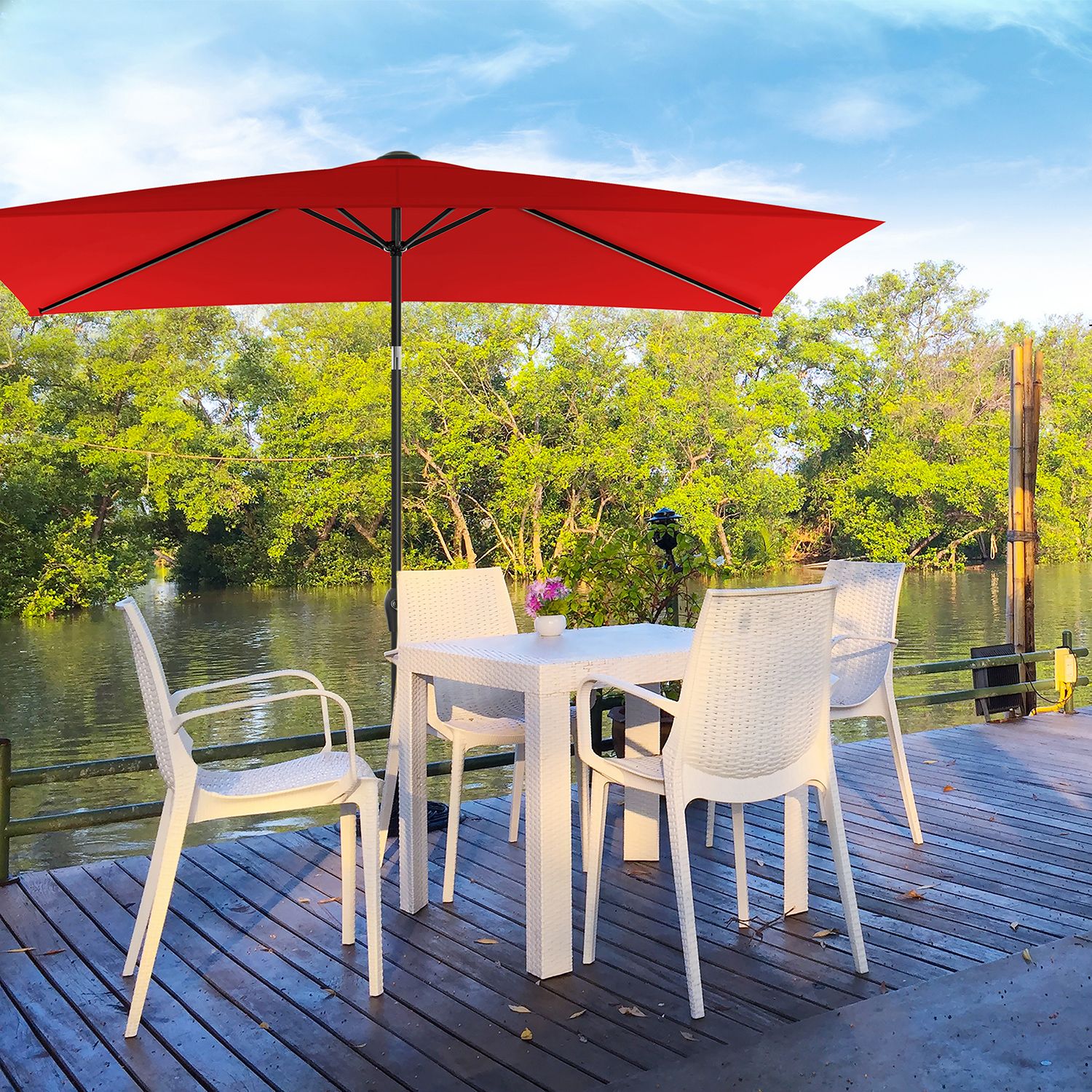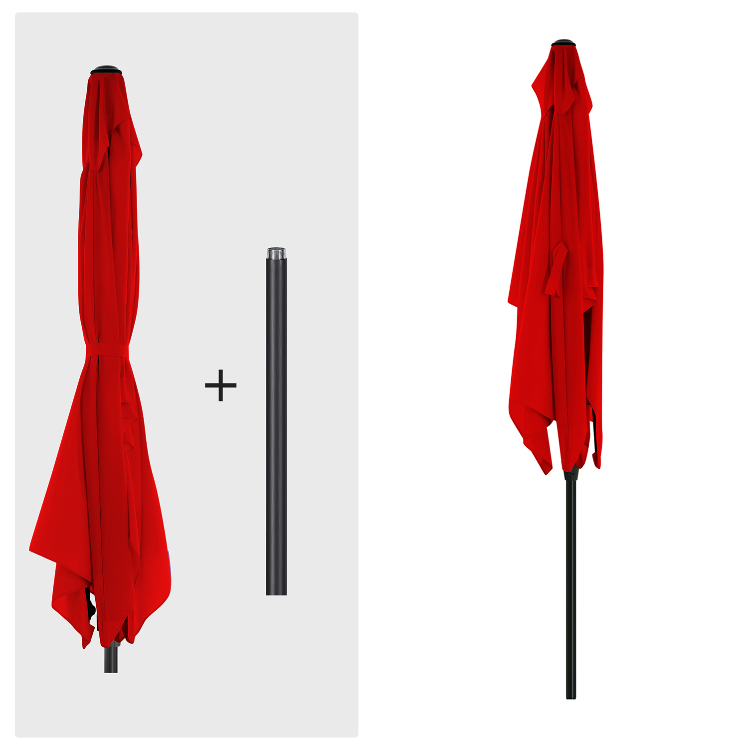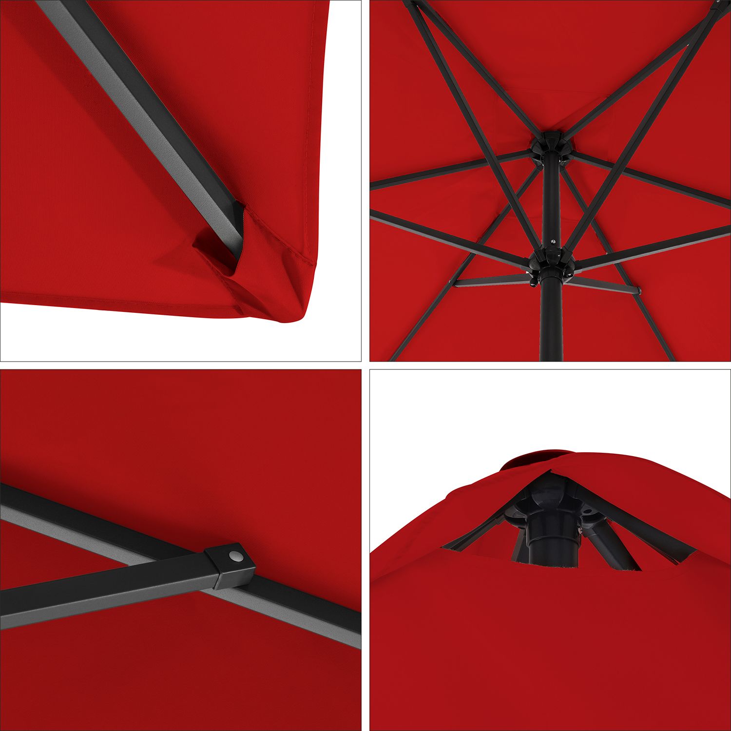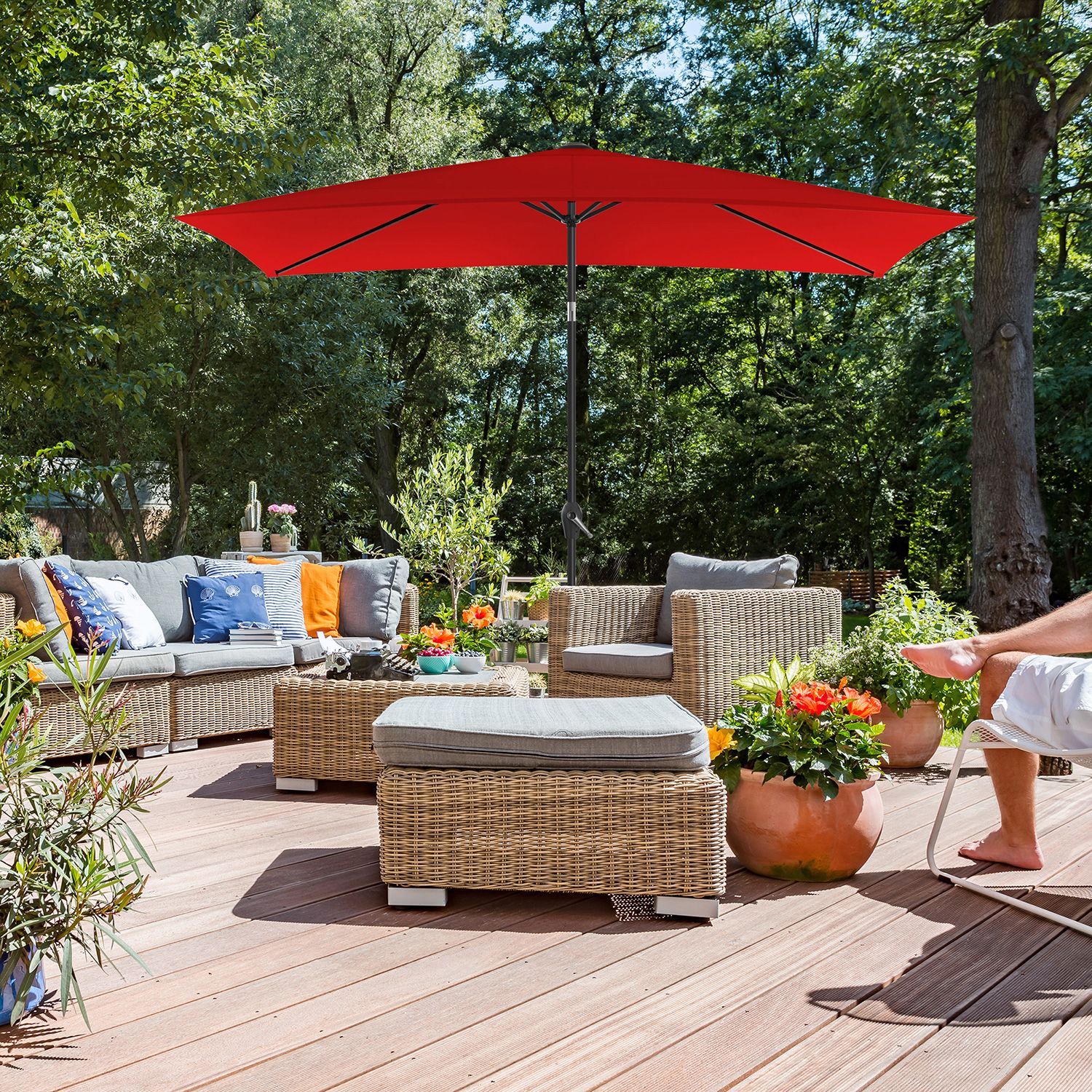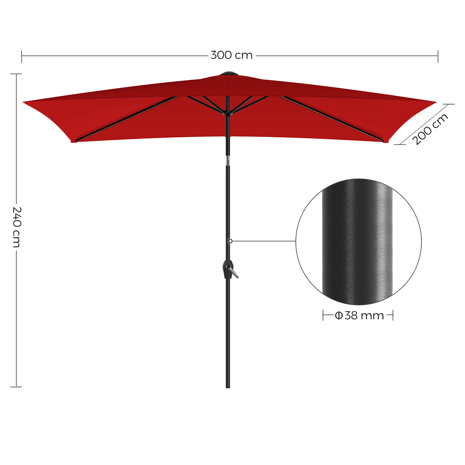Kesä, aurinko, hauskaa: ulos ulos!Tämä aurinkovarjo ei vain näytä modernilta, vaan tarjoaa myös riittävän varjon ulkona mitoiltaan 3 x 2 m. Kutsu ystäväsi ja nauttikaa viileitä juomia raikkaassa ilmassa aurinkovarjon alla – älä pelkää kirkasta auringonvaloa! Tärkeimmät syyt, miksi tämä aurinkovarjo on juuri sinulle sopiva: Erinomainen aurinkosuoja: Varjokangas tarjoaa optimaalisen UV-suojan (UPF 50+) ja estää 98 % UV-säteistä. Kestävä taivutusmekanismi: Taivutusmekanismi on valmistettu sinkkiseoksesta ja takaa pitkän käyttöiän. Helppo avata ja sulkea: Kätevä käsikampi helpottaa sateenvarjon avaamista ja sulkemista. Korkea vakaus: Suorakulmaiset ripat antavat parvekesateenvarjolle lisää vakautta. Tuotetiedot:Väri: punainen Materiaali: metallinen varjostimen varsi, 180 g/m² polyesteristä valmistettu varjostimen kangas Varjostimen kankaan koko: 3 x 2 m (P x L) Korkeus: 2,4 m Paino: 6,2 kg Toimitus sisältää: 1 x aurinkovarjo 1 x ohjeet SONGMICSin huomautukset:Varjostimen jalustaa ei toimiteta mukana. Älä avaa varjostinta väkisin, vaan avaa se varovasti ja hitaasti. Sulje varjostin yöllä, kovalla tuulella tai sateisella säällä vahingoittumisen estämiseksi. Suojaa varjostin suojapeitteellä (ei sisälly toimitukseen), jotta se kestää käytössä pidempään.