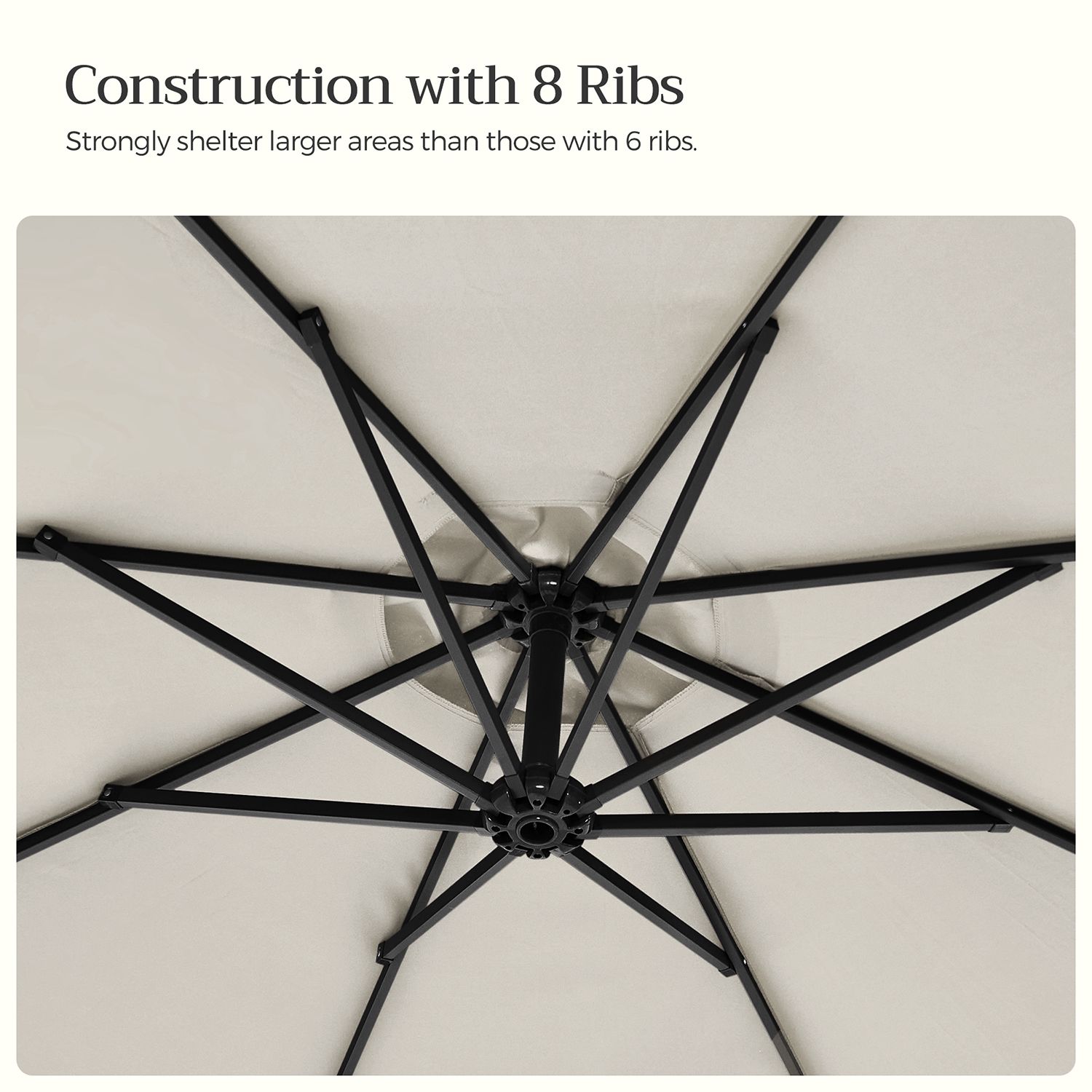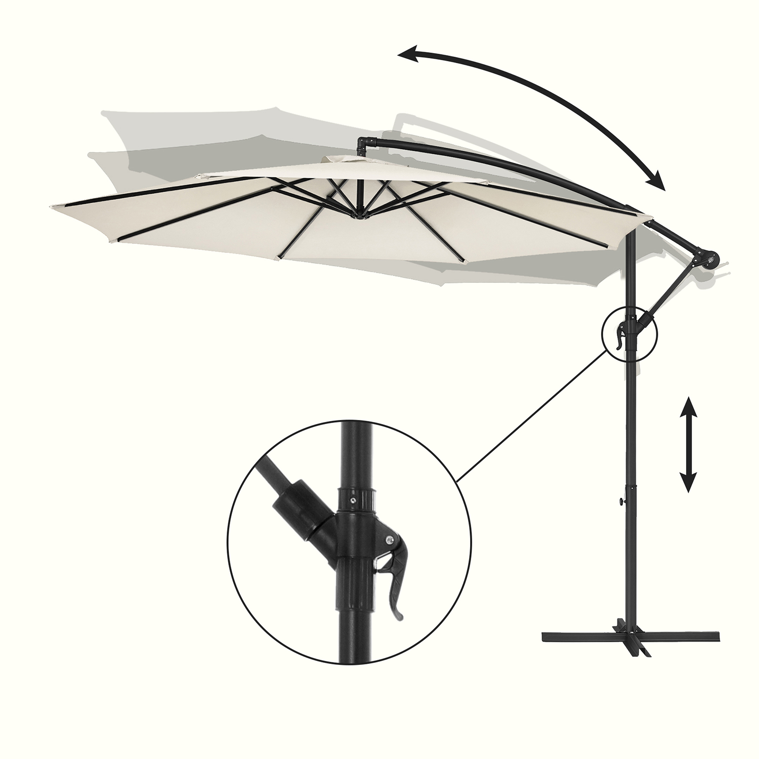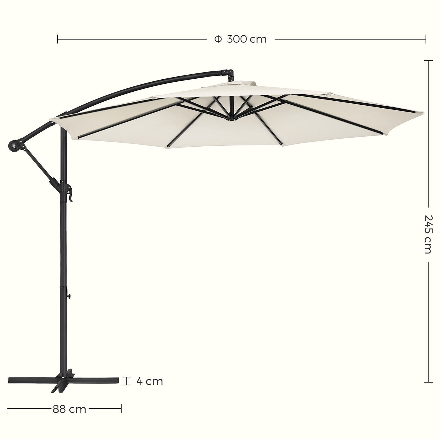 Tuotetiedot: Väri: Beige Materiaali: Metallinen varjostimen varsi, 180 g/m² polyesterikangas Ø Varjostin: 3 m Korkeus: 2,45 m Paino: 13 kg Toimitus sisältää: 1 x aurinkovarjo 1 x jalusta 1 x ohjeet (DE, EN, FR, ES, IT) SONGMICS Huomautukset:Aseta painavia esineitä (ei sisälly toimitukseen) jalustalle tuotteen vakauden varmistamiseksi. Avaa aurinkovarjo varovasti ja hitaasti, älä väkisin. Sulje aurinkovarjo yöllä, kovalla tuulella tai sateisella säällä vahingoittumisen estämiseksi.Suojaa sateenvarjo suojapeitteellä (ei sisälly toimitukseen), jotta se kestää pidempään.