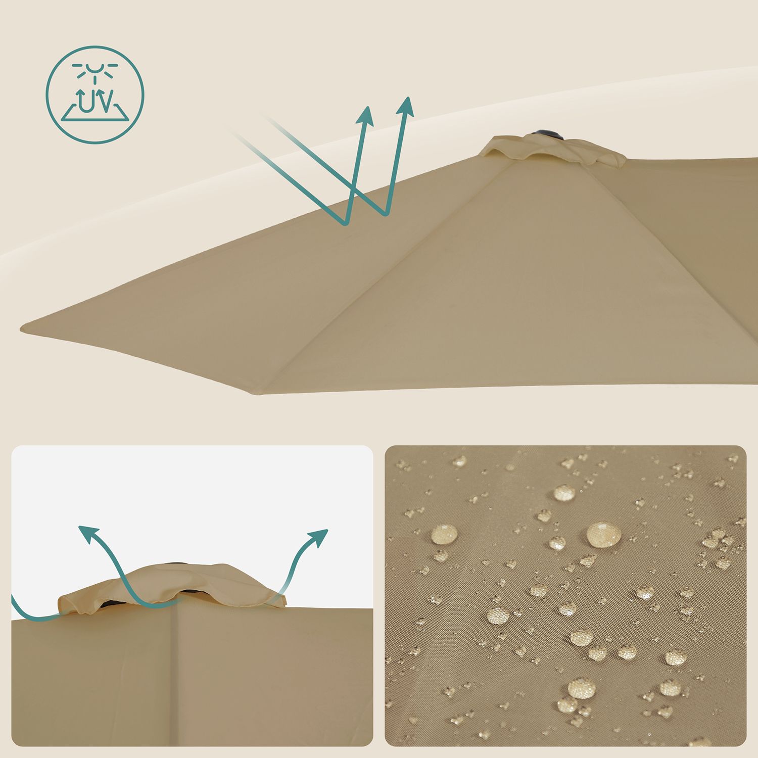 SONGMICS-tuotemerkin kaksinkertaisen aurinkovarjon kohokohdat: Erityisen suuri varjokangas (460 x 270 cm); tarjoaa laajan varjostuksen UV-suoja UPF 50+; optimaalinen suoja UV-säteilyltä Kestävä varjomasto Ø 48 mm metallitangoista 12 metallista varjokaaria; antavat sateenvarjolle vahvan tuen; sateenvarjon kangas 180 g/m² polyesteriä; takaa pitkän käyttöiän; sateenvarjo on helppo avata ja sulkea kätevän vipukahvan avulla; kätevä lukitusjousi; mahdollistaa sateenvarjon 2 metallitangon helpon yhdistämisen toisiinsa; työkaluja ei tarvita; asennus onnistuu muutamassa minuutissaTuotetiedot:Väri: harmaaMateriaali: metallinen sateenvarjon varsi ja sateenvarjon tukiripat, 180 g/m² polyesteriKorkeus: 245 cmSateenvarjon kankaan koko: 460 x 270 cm (P x L) Sateenvarjon varren halkaisija: 48 mm Nettopaino: 15 kg Toimitus sisältää: 1 x aurinkovarjo 1 x ohjeet (DE, EN, FR, ES, IT) SONGMICSin huomautukset: Sateenvarjon jalustaa ei toimiteta mukana. Suosittelemme käyttämään yli 50 kg painavaa aurinkovarjotelinettä. Älä avaa aurinkovarjoa väkisin, vaan avaa se varovasti ja hitaasti. Puhdista varjokangas pehmeällä, neutraalilla puhdistusaineella kostutetulla liinalla. Säilytä tuotetta kuivassa, hyvin ilmastoidussa paikassa, mutta vasta kun sateenvarjon kangas on täysin kuivunut. Sulje sateenvarjo tuulisina päivinä vahingoittumisen estämiseksi. Pidä tuote kaukana tulen lähteistä; suojaa sitä myös äärimmäiseltä kylmyydeltä tai kuumuudelta ja muilta sääolosuhteilta, kuten sateelta, tuulelta, lumelta, rakeilta jne.