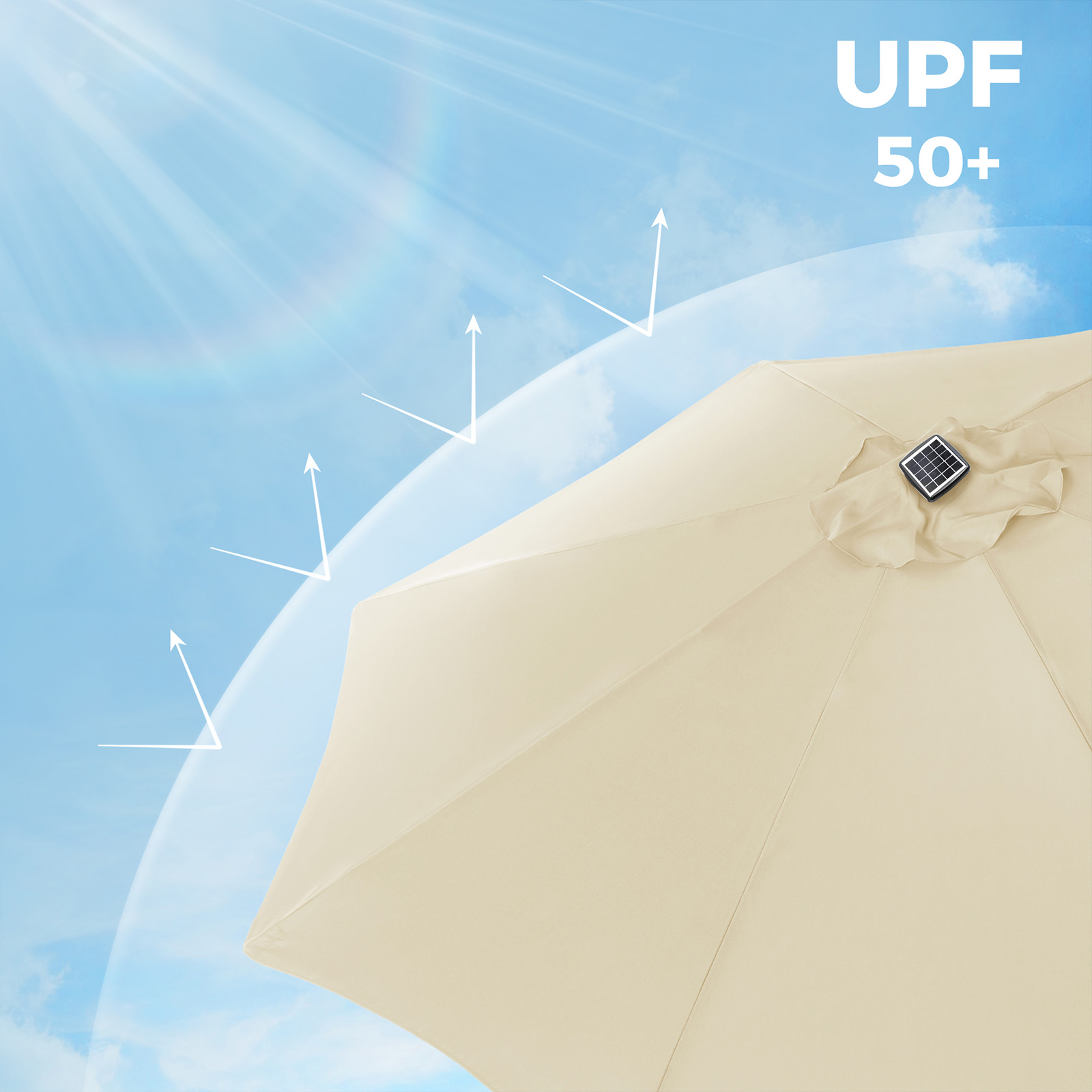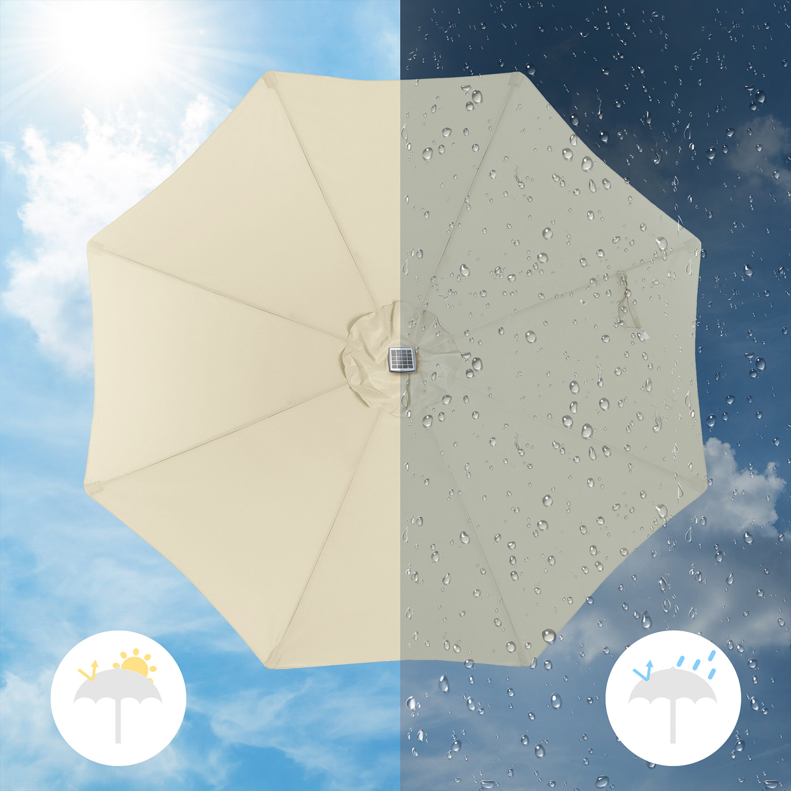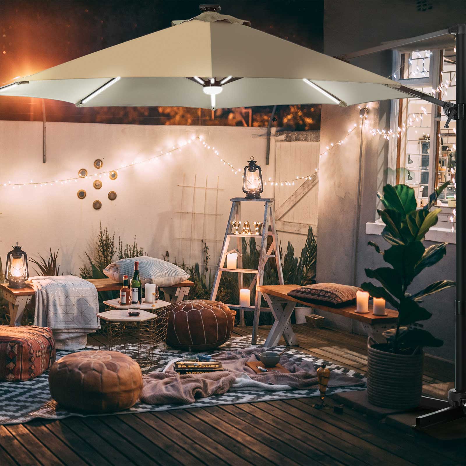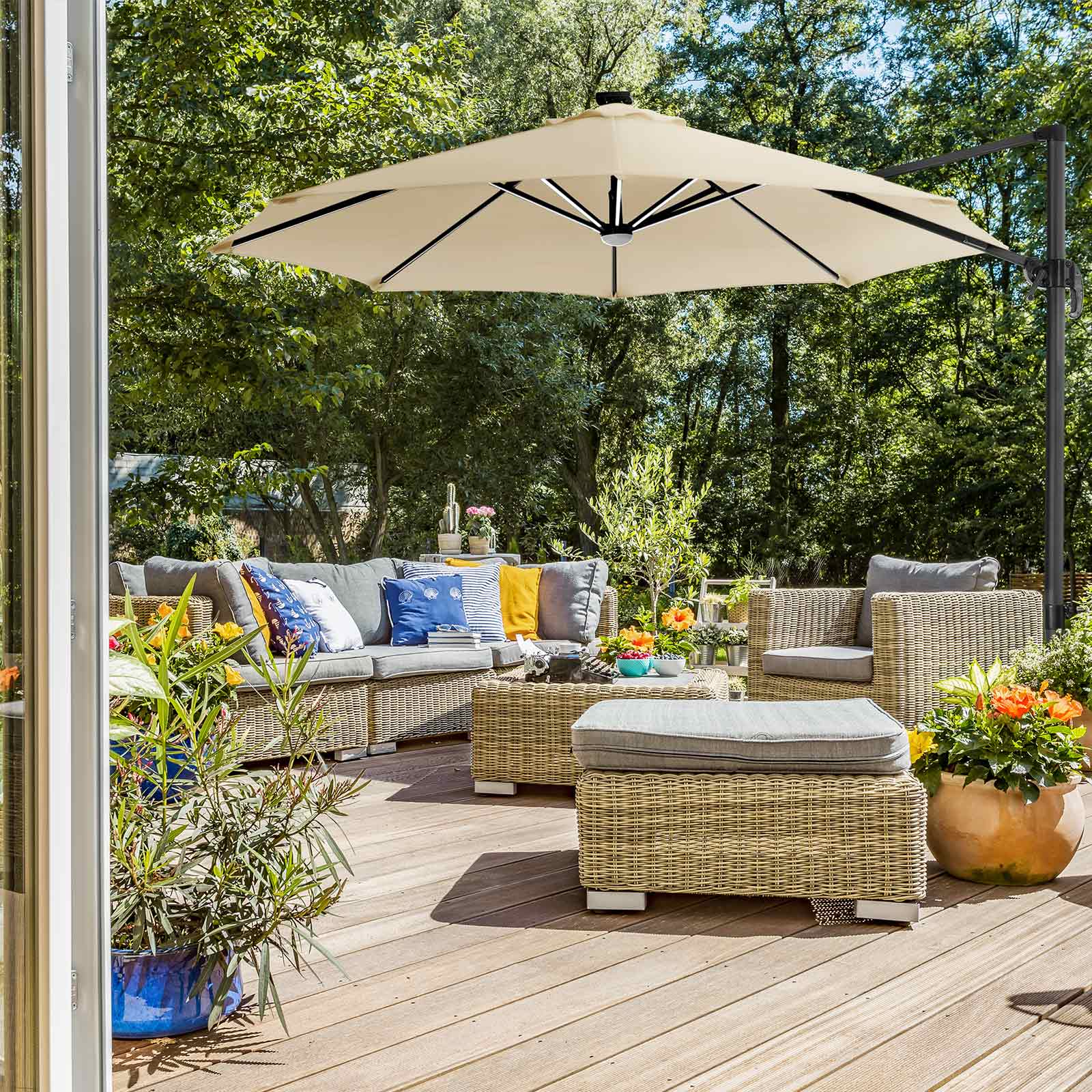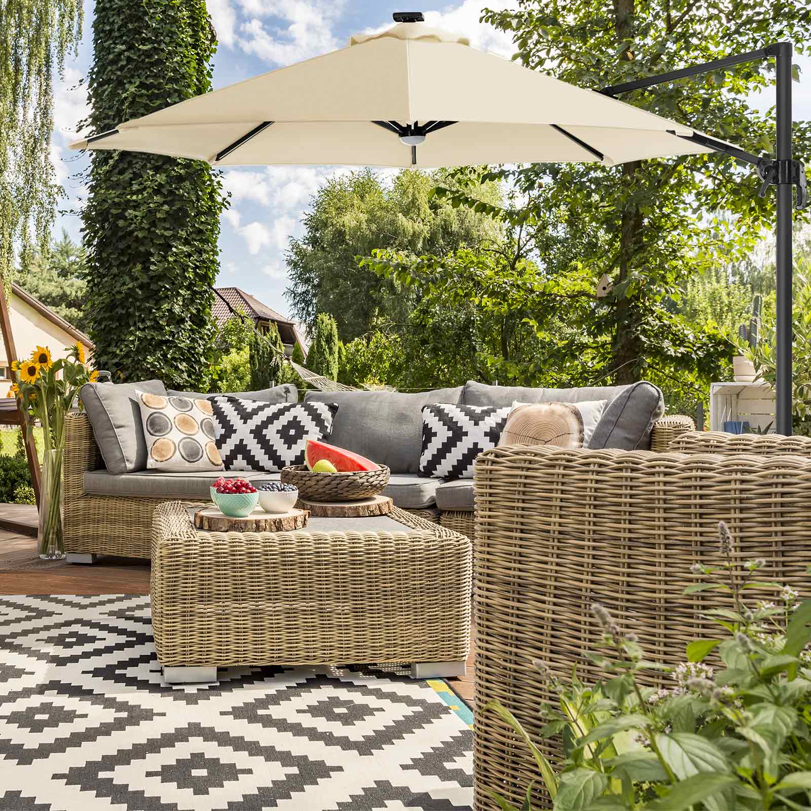 Auringonnoususta auringonlaskuun: kaunis sää voi tulla! Ulos aurinkoon! Mutta älä unohda aurinkosuojaa! Varusta puutarhasi tai terassisi tällä aurinkovarjolla, joka tarjoaa erinomaisen UV-suojan jopa UPF 50+. Avaa varjo kätevällä käsikammella. Säädä aurinkovarjon kallistuskulmaa sivussa olevalla kahvalla, kun aurinko liikkuu. Paina poljinta ja käännä varjon masto, jotta varjo osoittaa toiseen suuntaan. Ihanaa! Hauskuus ei ole vielä ohi! Kun aurinko laskee, kytke varjon LED-valaistus päälle, se tuo romantiikkaa puutarhaan! Valaistus saa virran yläosassa olevasta aurinkopaneelista tai mukana toimitetusta USB-kaapelista.Tuotetiedot: Väri: beige Materiaali: alumiininen varjostimen varsi, metalliset varjostimen säteet, 240 g/m² polyesterikangas PA-pinnoitteella Ø varjostin: 3 m Korkeus: 2,5 m Paino: 18,5 kg Toimitus sisältää: 1 x varjostin 1 x jalusta 1 x ohjeet SONGICSin huomautukset:Aseta painavat esineet (ei sisälly toimitukseen) jalustalle, jotta tuote pysyy vakaana. Avaa aurinkovarjo varovasti ja hitaasti, älä väkisin. Sulje aurinkovarjo yöllä, kovalla tuulella tai sateisella säällä vahingoittumisen estämiseksi.Suojaa sateenvarjo suojapeitteellä (ei sisälly toimitukseen), jotta se kestää pidempään.