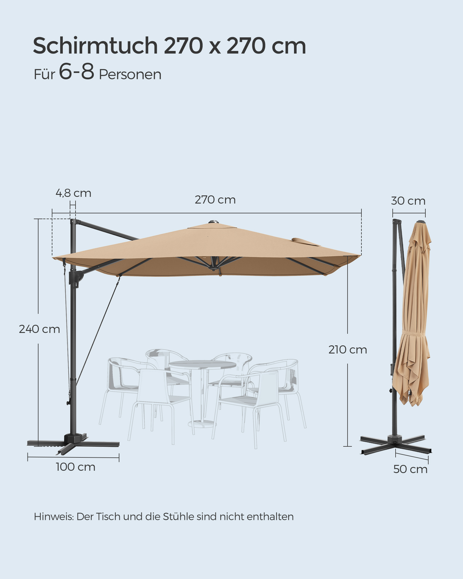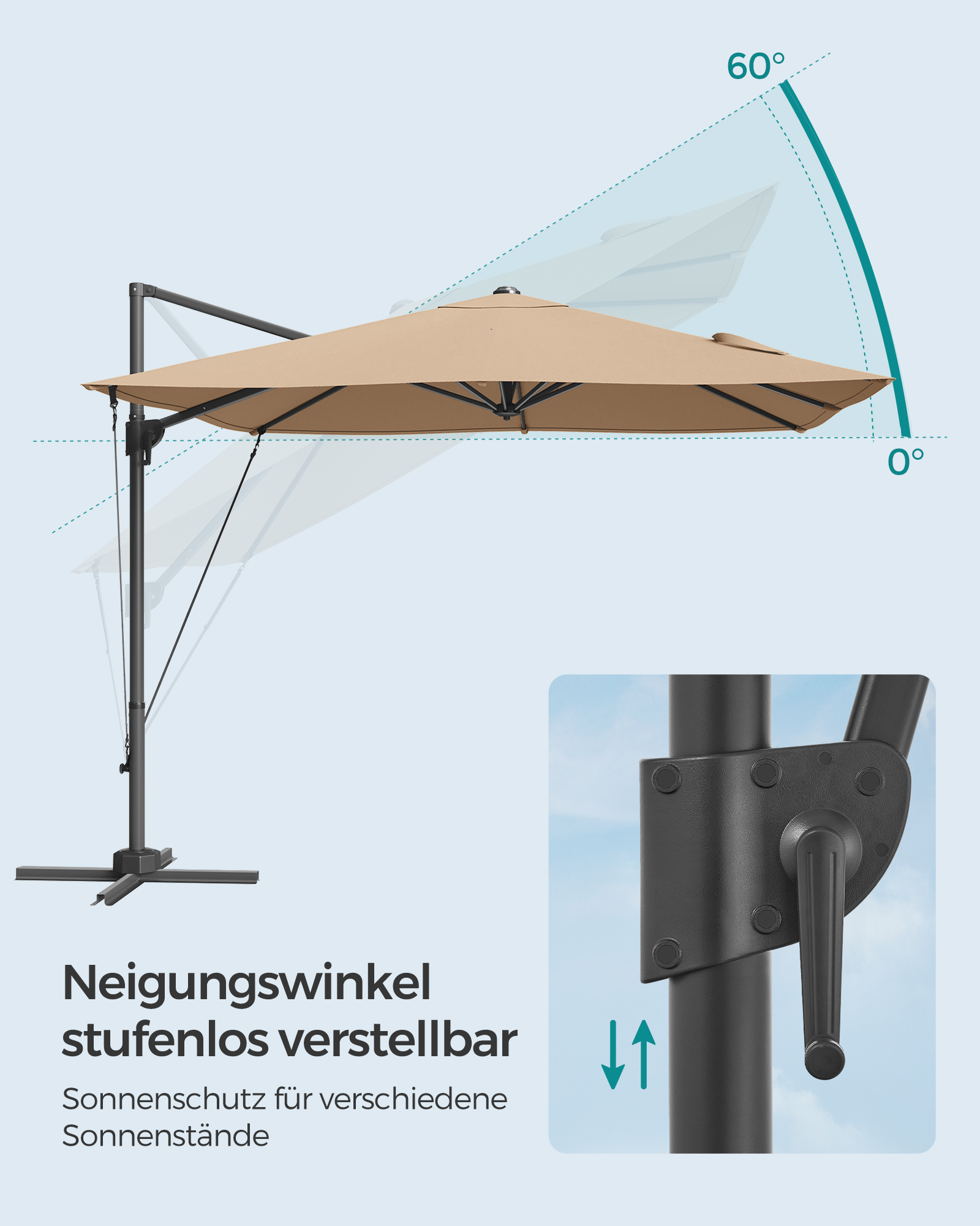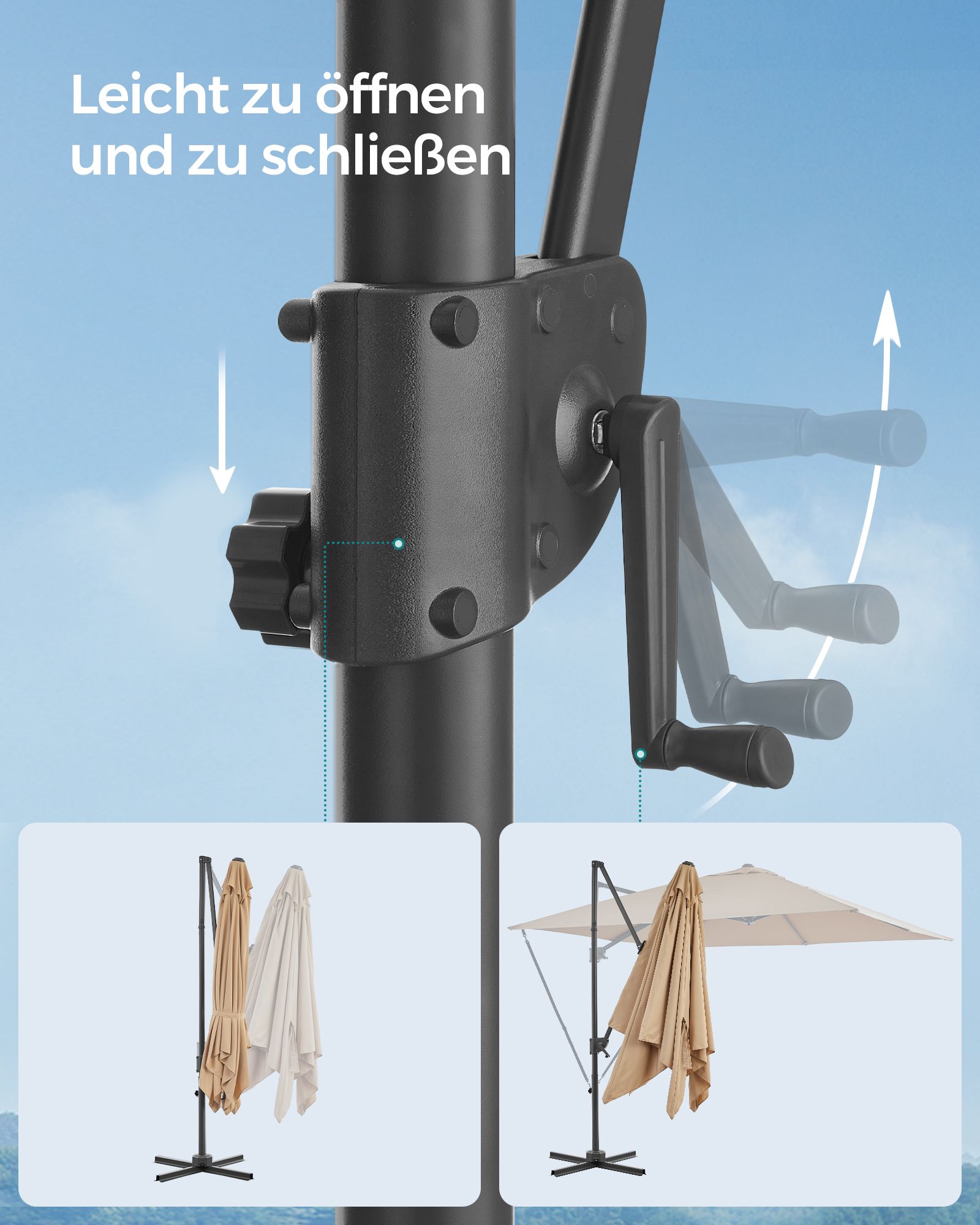 SONGMICS aurinkovarjo, riippuva aurinkovarjo, 270 x 270 cm, UV-suoja UPF 50+, puutarhavarjo, 360° kääntyvä, kallistuskulma säädettävissä, kampi, ristijalka
