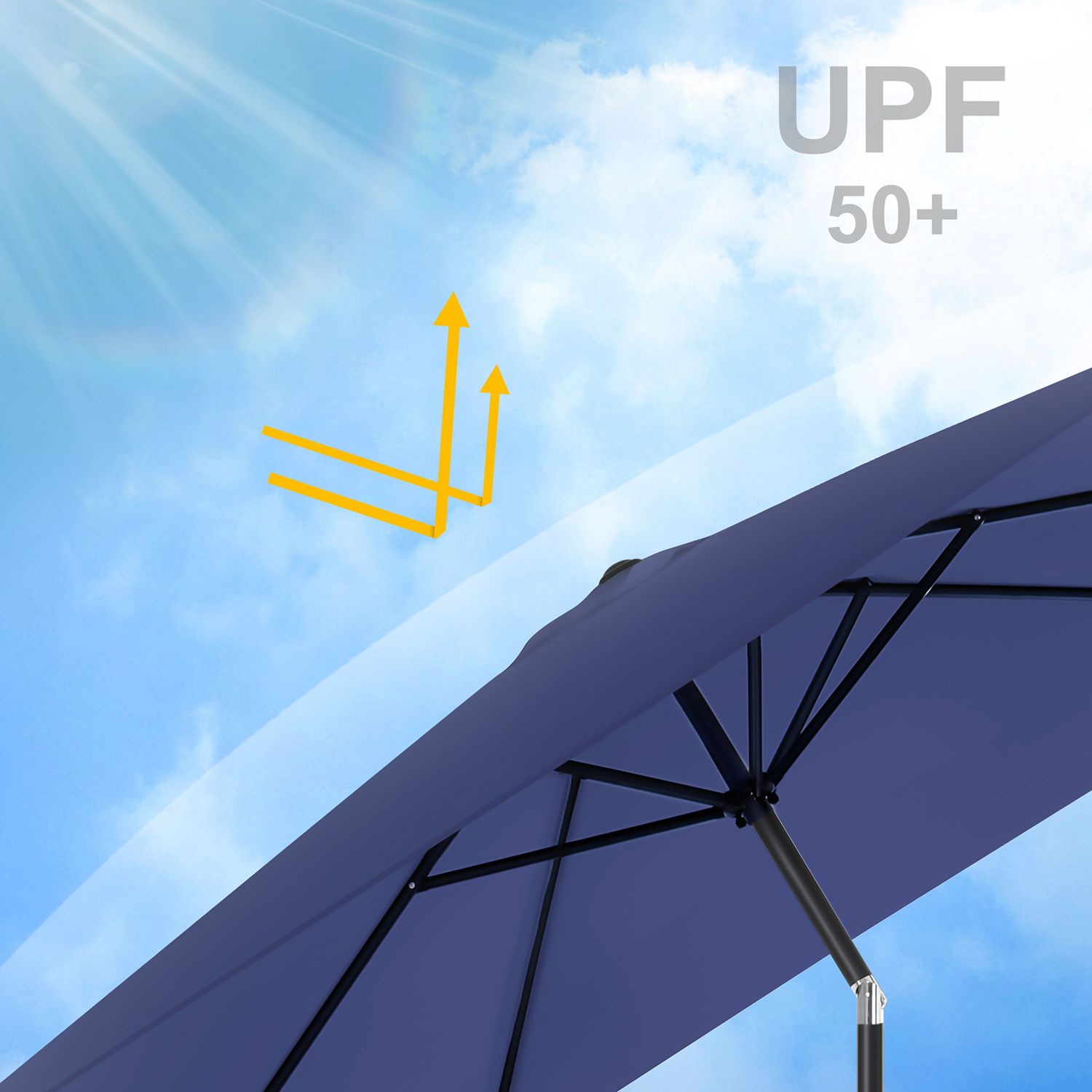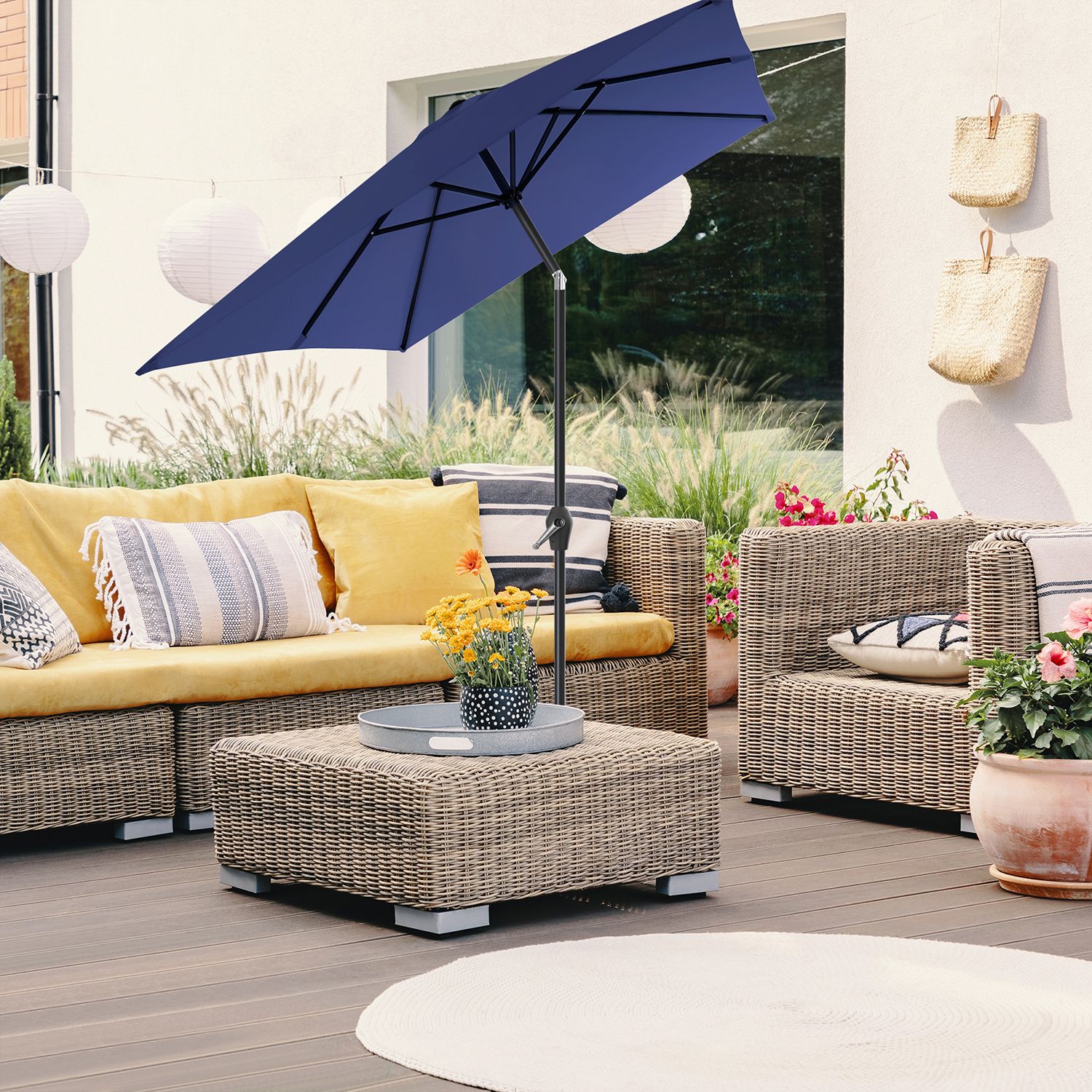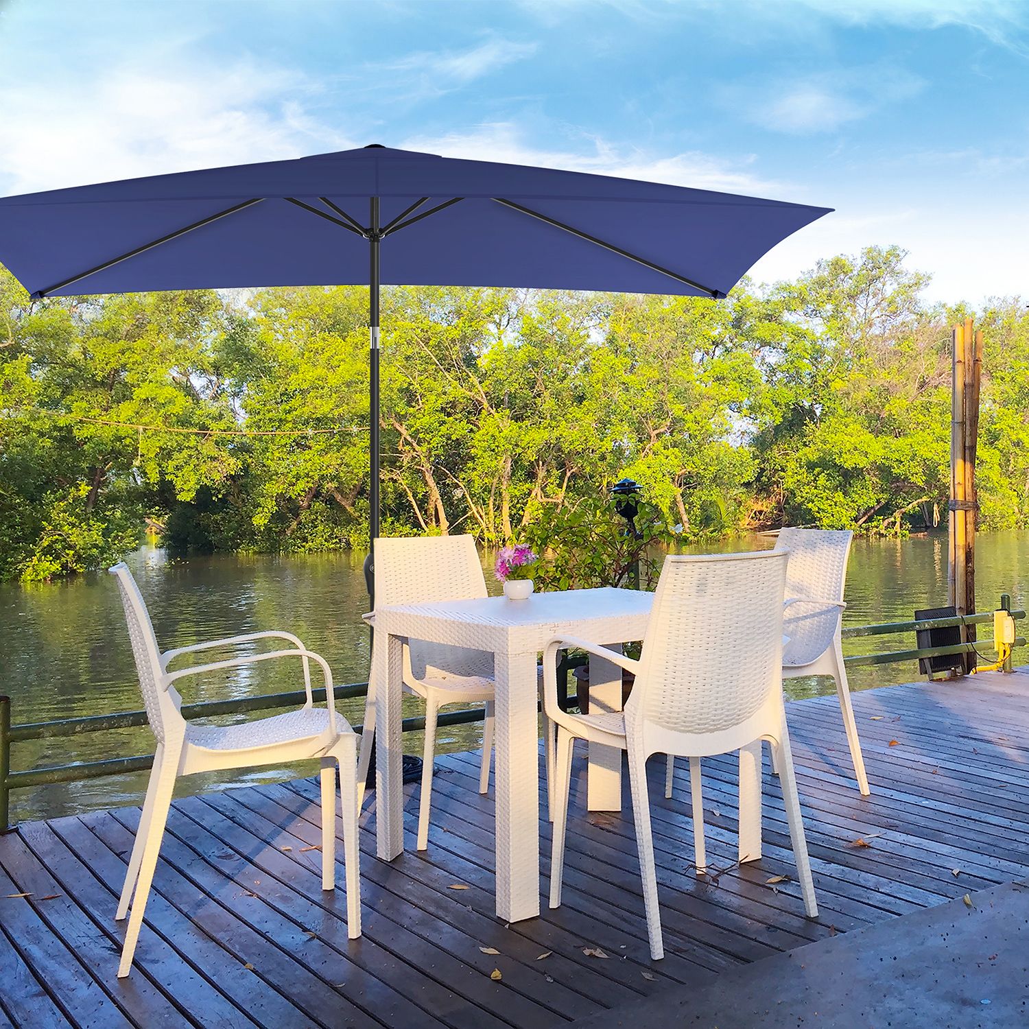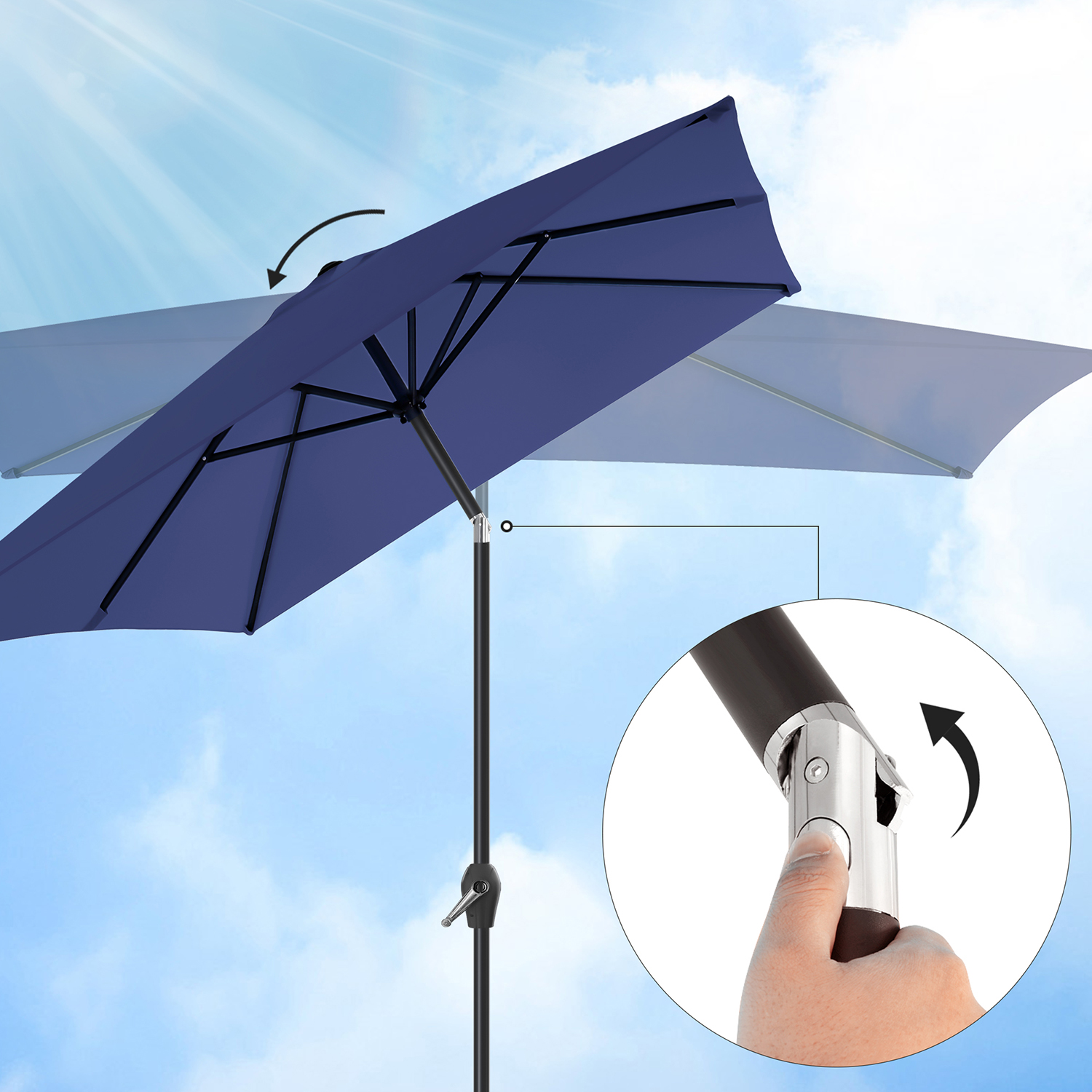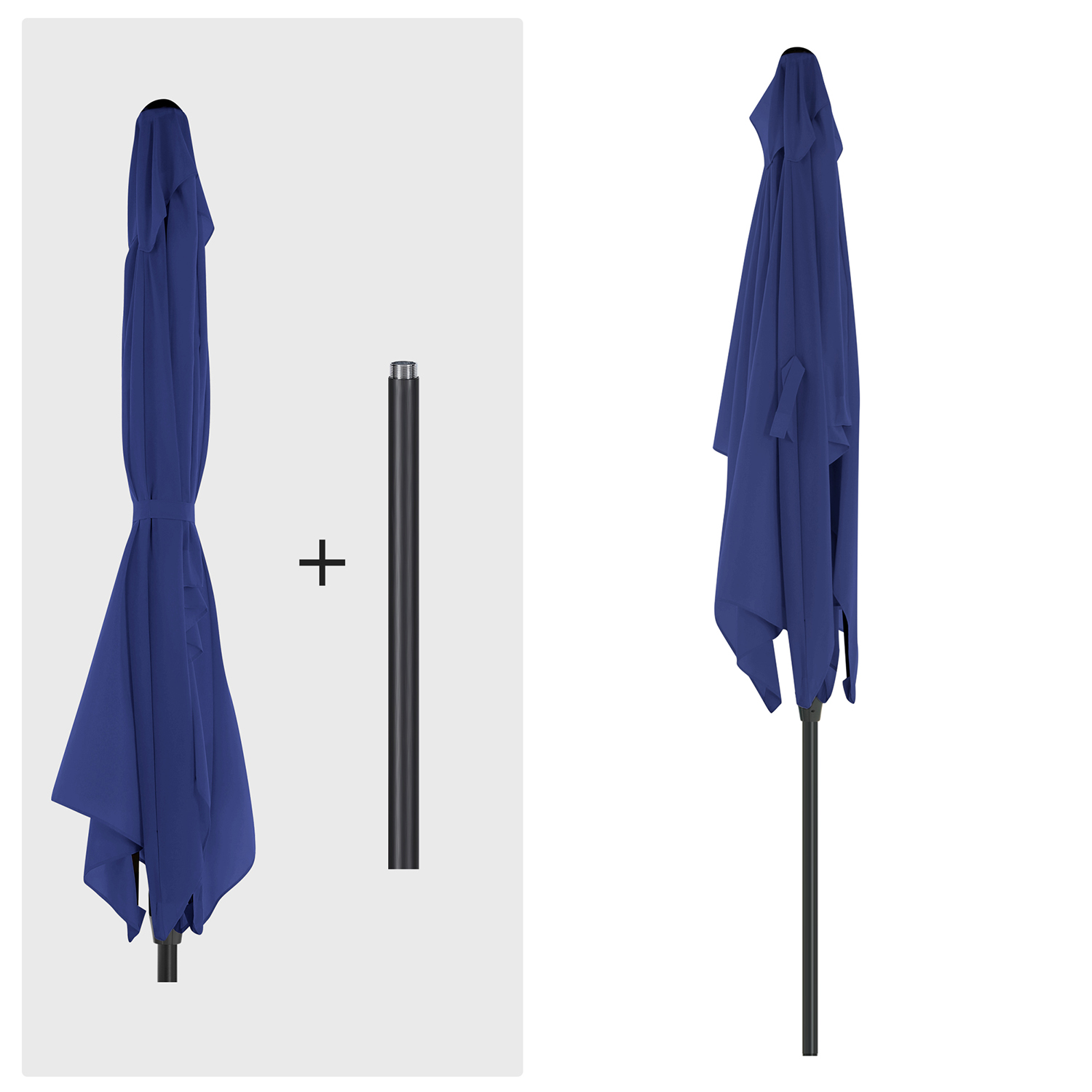 Kesä, aurinko, hauskaa: ulos ulos!Tämä aurinkovarjo ei vain näytä modernilta, vaan tarjoaa myös riittävän varjon ulkona mitoiltaan 3 x 2 m. Kutsu ystäväsi ja nauttikaa viileitä juomia raikkaassa ilmassa aurinkovarjon alla – älä pelkää kirkasta auringonvaloa! Tärkeimmät syyt, miksi tämä aurinkovarjo on juuri sinulle sopiva: Erinomainen aurinkosuoja: Varjokangas tarjoaa optimaalisen UV-suojan (UPF 50+) ja estää 98 % UV-säteistä. Kestävä taivutusmekanismi: Taivutusmekanismi on valmistettu sinkkiseoksesta ja takaa pitkän käyttöiän. Helppo avata ja sulkea: Kätevä käsikampi helpottaa sateenvarjon avaamista ja sulkemista. Korkea vakaus: Suorakulmaiset ripat antavat parvekesateenvarjolle lisää vakautta. Tuotetiedot:Väri: tummansininen Materiaali: metallinen varjostimen varsi, 180 g/m² polyesteristä valmistettu varjostimen kangas Varjostimen kankaan koko: 3 x 2 m (P x L) Korkeus: 2,4 m Paino: 6,2 kg Toimitus sisältää: 1 x aurinkovarjo 1 x ohjeet SONGMICSin huomautukset:Varjostimen jalustaa ei toimiteta mukana. Älä avaa varjostinta väkisin, vaan avaa se varovasti ja hitaasti. Sulje varjostin yöllä, kovalla tuulella tai sateisella säällä vahingoittumisen estämiseksi. Suojaa varjostinta suojapeitteellä (ei sisälly toimitukseen), jotta se kestää käytössä pidempään.