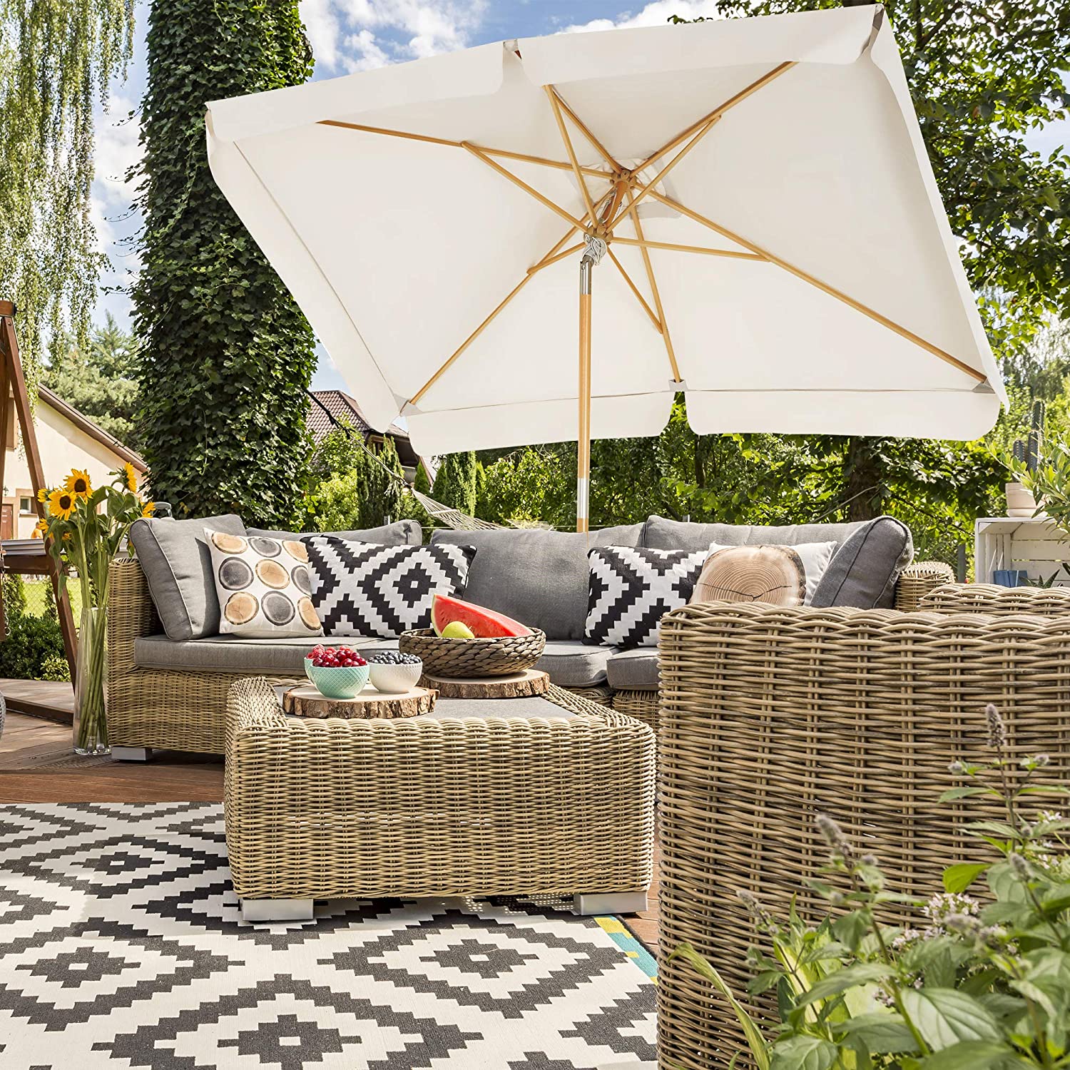 Lämmin aurinko, sininen taivas, raikas ilma, kaunis luonto… Mitä vielä odotat? Aika rentoutua parvekkeella! Pelkäätkö voimakkaita auringon säteitä? Älä huoli. Avaa vain tämä SONGMICS-aurinkovarjo ja nauti kauniista säästä varjossa! Tämän aurinkovarjon kohokohdat: Tämä suorakulmainen, 3 x 2 m:n kokoinen aurinkovarjo sopii täydellisesti parvekkeelle. Tarjoaa erinomaisen UV-suojan. Taivutusominaisuuden ansiosta voit kallistaa puutarhavarjon niin, että se heittää varjon aina oikeaan kohtaan. Varjon varsi on valmistettu tukevasta pyökkipuusta. 6 varjon tukiripaa on valmistettu korkealaatuisesta ja kestävästä kovapuusta. 180 g/m² polyesterikangasta on pitkäikäinen. Sateenvarjo on helppo avata ja sulkea käytännöllisen köyden avulla. Sateenvarjon varsi koostuu kahdesta tangosta, jotka on helppo ruuvata yhteen. Puurakenteinen sateenvarjo tuo puutarhaan lämpimän tunnelman. Tuotetiedot:Väri: beige Materiaali: sateenvarjon varsi pyökkipuusta, sateenvarjon säteet kovapuusta, 180 g/m² polyesterikangas Sateenvarjon kangas: 3 x 2 m (P x L) Paino: 10,3 kg Toimitus sisältää: 1 x sateenvarjo 1 x ohjeet SONGICSin huomautukset:Sateenvarjotelinettä ei toimiteta mukana. Älä avaa sateenvarjoa väkisin, vaan avaa se varovasti ja hitaasti. Sulje sateenvarjo tuulisina päivinä vahingoittumisen estämiseksi. Suojaa tuote suojapeitteellä (ei sisälly toimitukseen), jotta se kestää käytössä pidempään.Ole varovainen, kun käytät aurinkovarjon taittomekanismia, jotta et purista sormiasi.