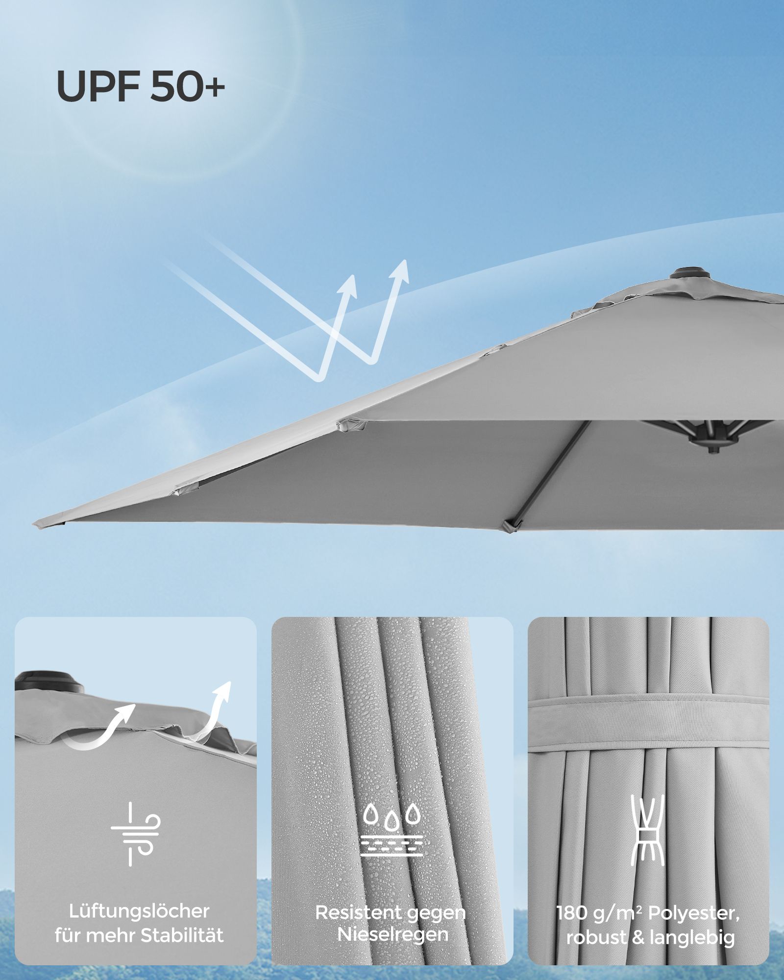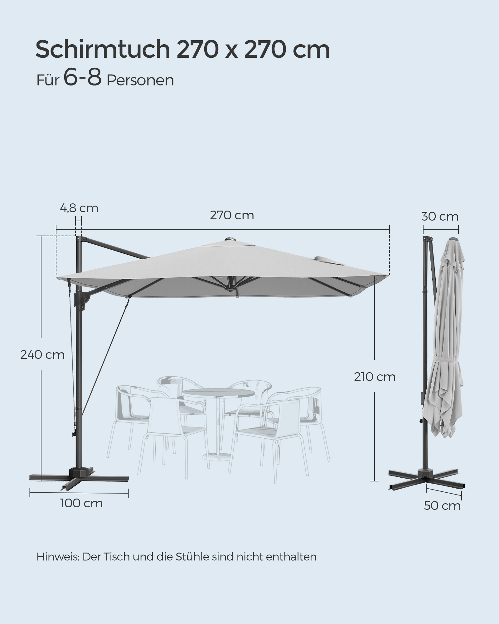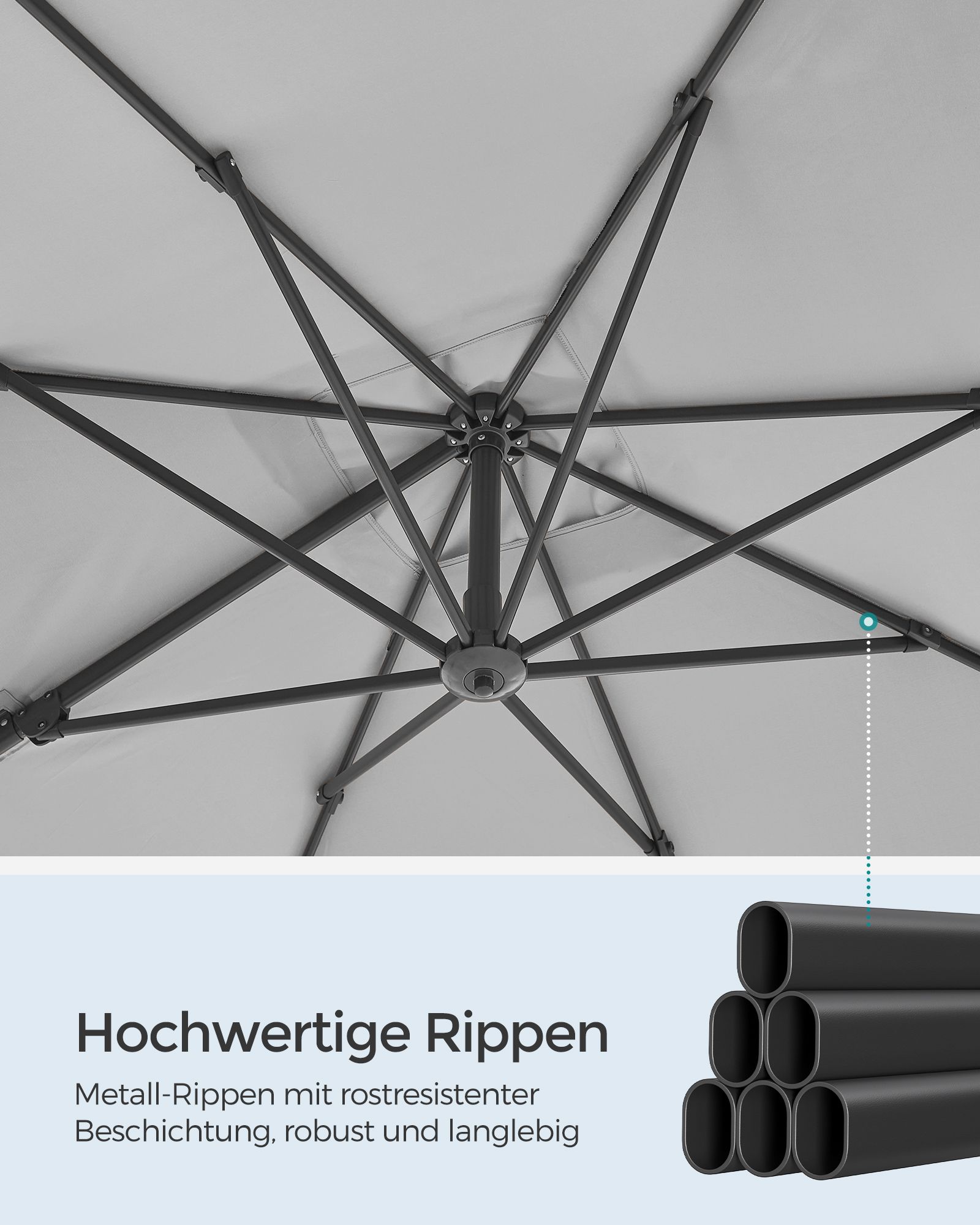 SONGMICS aurinkovarjo, riippuva aurinkovarjo, 270 x 270 cm, UV-suoja UPF 50+, puutarhavarjo, 360° kääntyvä, kallistuskulma säädettävissä, kampi, ristijalka