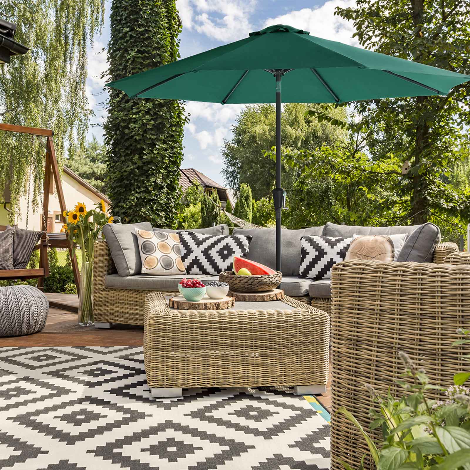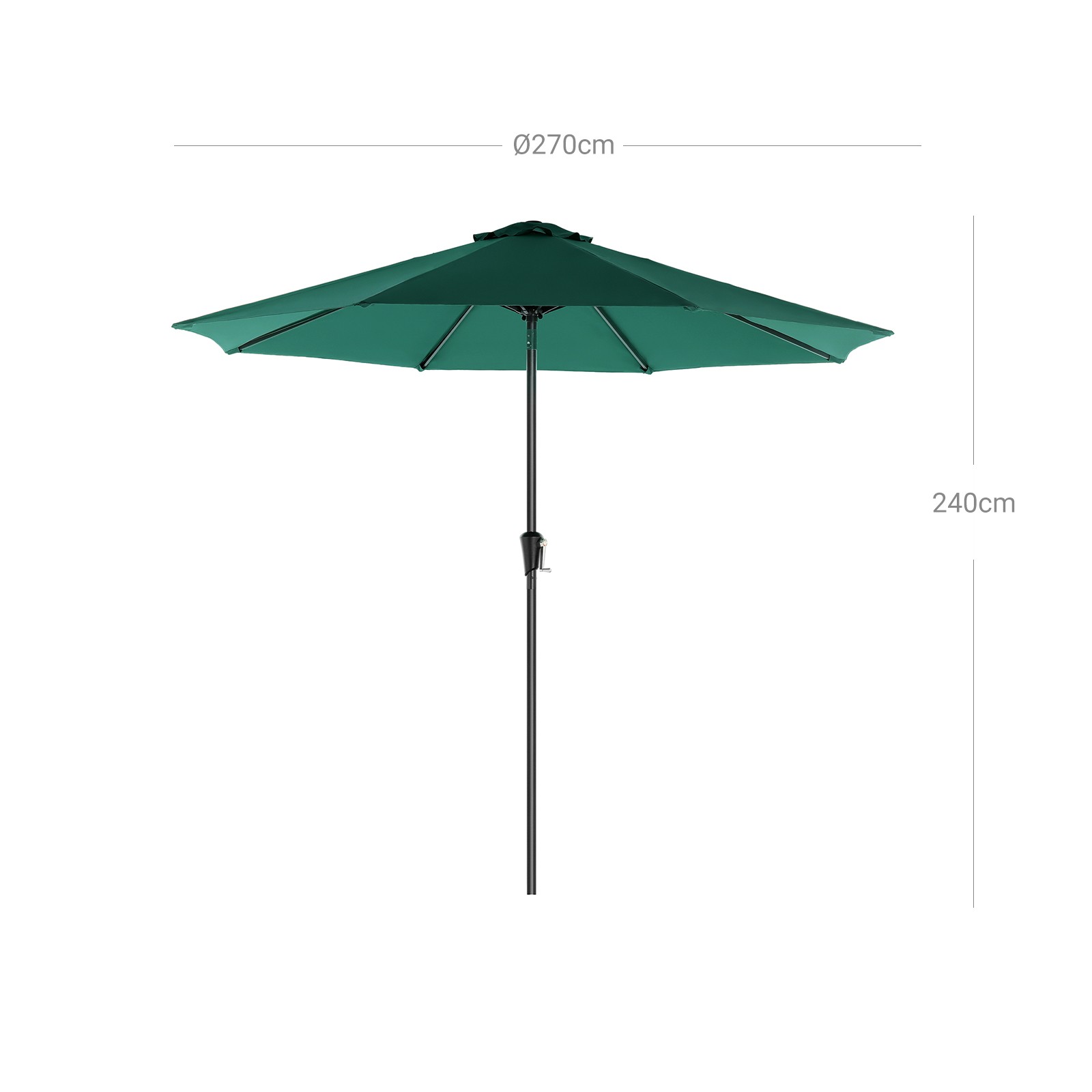 Lämmin aurinko, sininen taivas, raikas ilma, kaunis luonto… Mitä vielä odotat? Aika rentoutua parvekkeella! Pelkäätkö voimakkaita auringon säteitä? Älä huoli. Avaa vain tämä SONGMICS-aurinkovarjo ja nauti kauniista säästä varjossa! Tässä ovat tämän aurinkovarjon kohokohdat: 180 g/m² polyesterikankaasta valmistettu varjokangas tarjoaa erinomaisen UV-suojan UPF 50+ asti. Laadukas sinkkiseoksesta valmistettu taivutusmekanismi takaa pitkän käyttöiän.Metallinen varjostimen varsi on tukeva ja antaa terassillesi erityisen ilmeen. 8 suorakulmaista varjostimen ripaa antavat varjostimelle vahvan tuen. Varjostin on helppo avata ja sulkea kätevän vipukahvan avulla. Sinun tarvitsee vain ruuvata varjostimen varren yläosa yhteen alaosan kanssa, niin aurinkovarjo on käyttövalmis. Yläosan tuuletusaukot pitävät aurinkovarjon vakaana myös kevyessä tuulessa. Tuotetiedot: Väri: tummanvihreä Materiaali: Metallinen sateenvarjon varsi, 180 g/m² polyesterikangas Sateenvarjon halkaisija: 2,7 m Korkeus: 2,4 m Paino: 7 kg Toimitus sisältää: 1 x sateenvarjo 1 x ohjeet SONGICSin ohjeet: Aseta painavat esineet (ei sisälly toimitukseen) jalustalle, jotta tuote pysyy vakaana.Älä avaa aurinkovarjoa väkisin, vaan avaa se varovasti ja hitaasti. Sulje aurinkovarjo yöllä, kovalla tuulella tai sateisella säällä vahingoittumisen estämiseksi. Suojaa varjo suojapeitteellä (ei sisälly toimitukseen) sen käyttöiän pidentämiseksi.