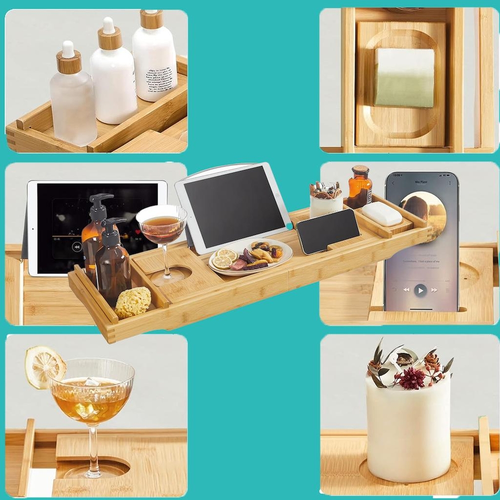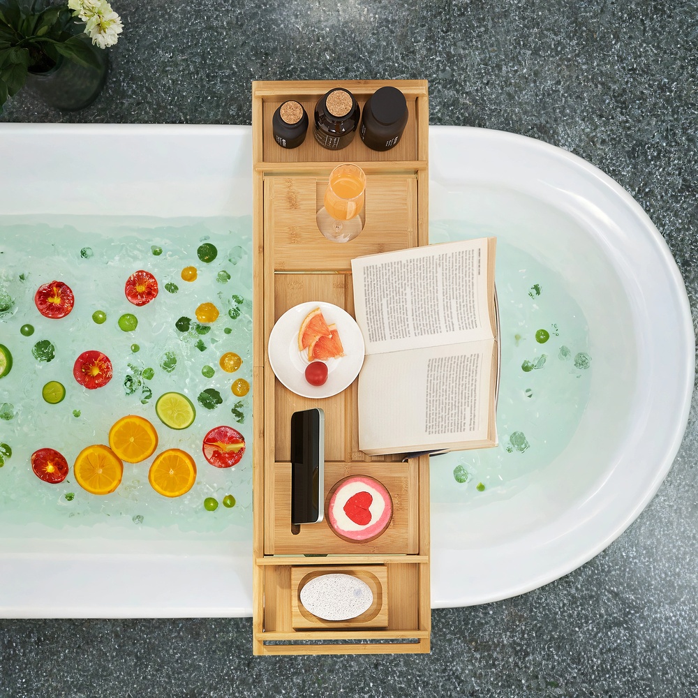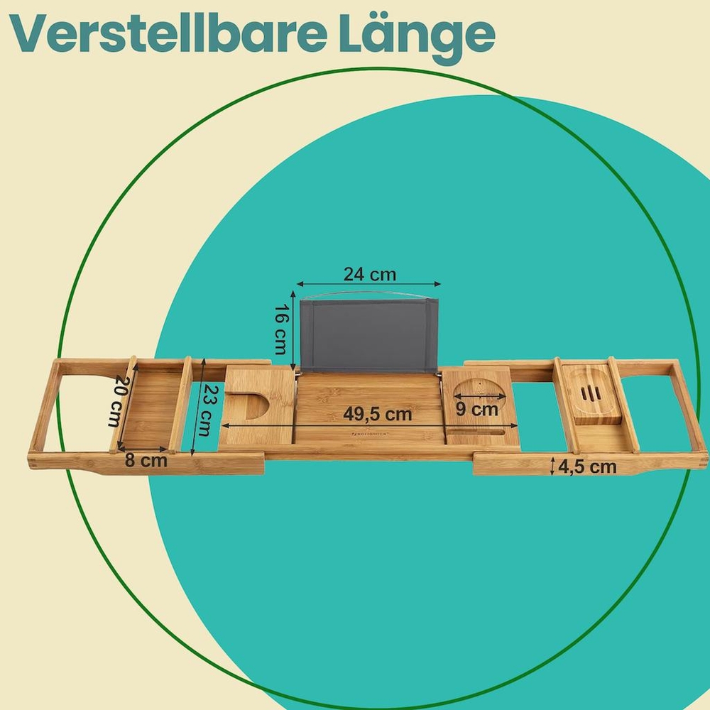 Tuotetiedot: – Väri: luonnonväri – Materiaali: bambu – Kantavuus: 3 kg – Mitat: 75–109 x 4,5 x 23 cm (L x K x S) – Paino: 1,96 kg Toimitus sisältää: – 1 x kylpyammeen hylly Huomautukset: – Pyyhi ennen käyttöä kostealla liinalla bambukuidut pois pinnalta.