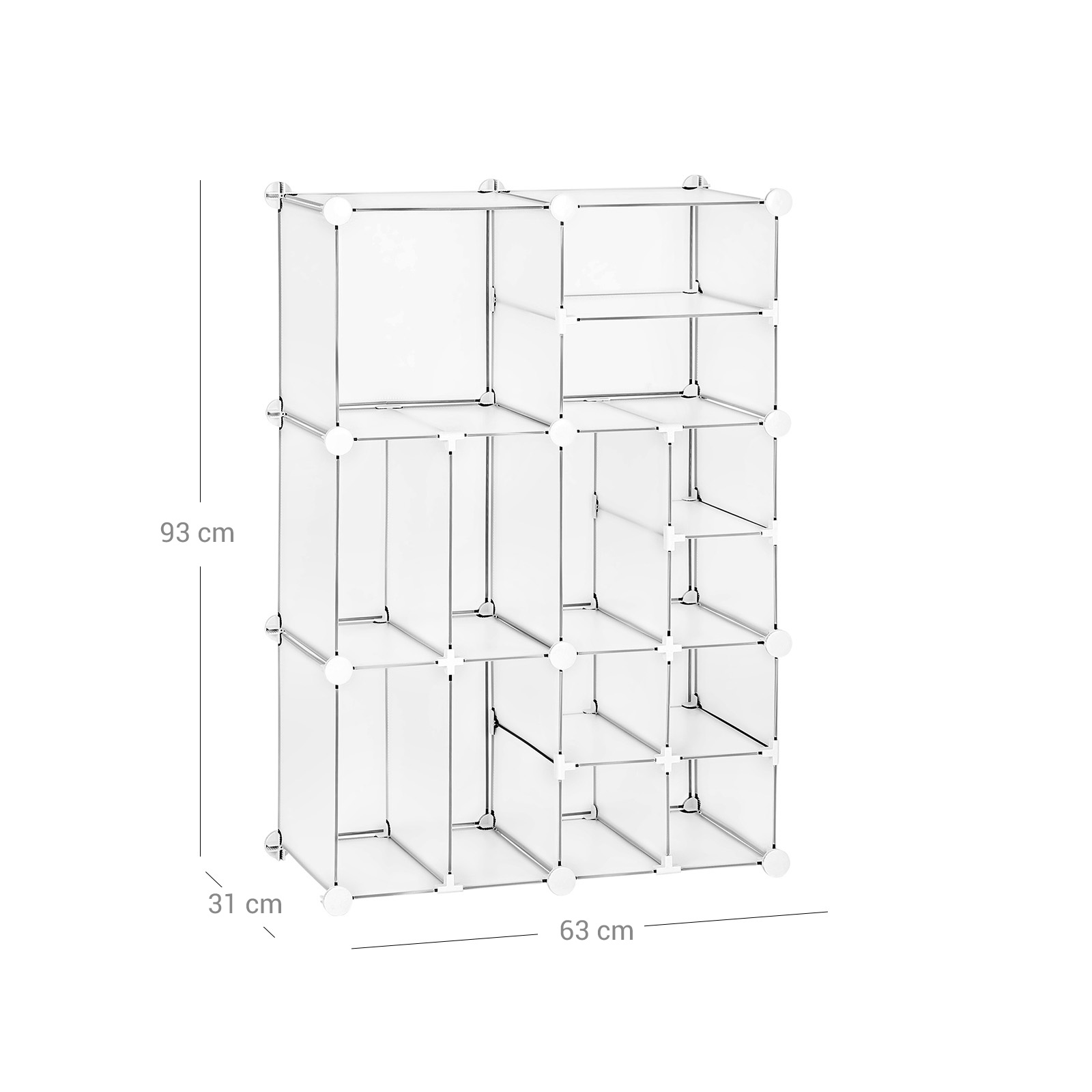 Vakaus on etusijalla: tämän hyllyjärjestelmän PP-muovilevyt on kiinnitetty toisiinsa korkealaatuisilla liitoskappaleilla, mikä takaa hyvän kantavuuden. Jokainen lokero kestää 10 kg:n painon. Voit siis säilyttää siinä vaatteita, kenkiä, leluja tai laukkuja ilman ongelmia. Hyllyn vakautta lisäävät myös mukana toimitetut kaksi kaatumisenestohihnaa. Kaikki tarvittavat työkalut mukana: Asennuksen helpottamiseksi toimitamme kaiken tarvittavan, mukaan lukien kumivasaran. Seuraa vain ohjeita tai asennusvideota ja kokoa hylly vaihe vaiheelta. Näin asennus sujuu hetkessä. Tuotetiedot: Väri: Puoliläpinäkyvä valkoinen Materiaali: PP-muovilevyt metallilankakehyksellä, PC-ABS-seosmuoviset liitoskappaleet Koko: 63 x 31 x 93 cm (P x L x K) Paino: 6,4 kg Maks. staattinen kantavuus kuutiota kohti: 10 kg Toimitus sisältää: 15 x muovilevy (30 x 30 cm)13 x muovilevy, jossa on lovet (30 x 30 cm) 3 x muovilevy (30 x 15 cm) 24 x pyöreä liitoskappale 20 x T-muotoinen liitoskappale 6 x ristimuotoinen liitoskappale 1 x kumivasara 2 x kaatumisenestohihna 1 x ohjeet (DE, EN, FR, ES, IT) SONGMICS Huomautukset:Pidä lapset poissa pienistä osista mahdollisten vaarojen välttämiseksi. Kaikki muovilevyt on painettava kokonaan alas asennuksen aikana. Tarkista myös, että lankakehykset on painettu kokonaan liitoskappaleeseen tuotteen vakauden parantamiseksi.