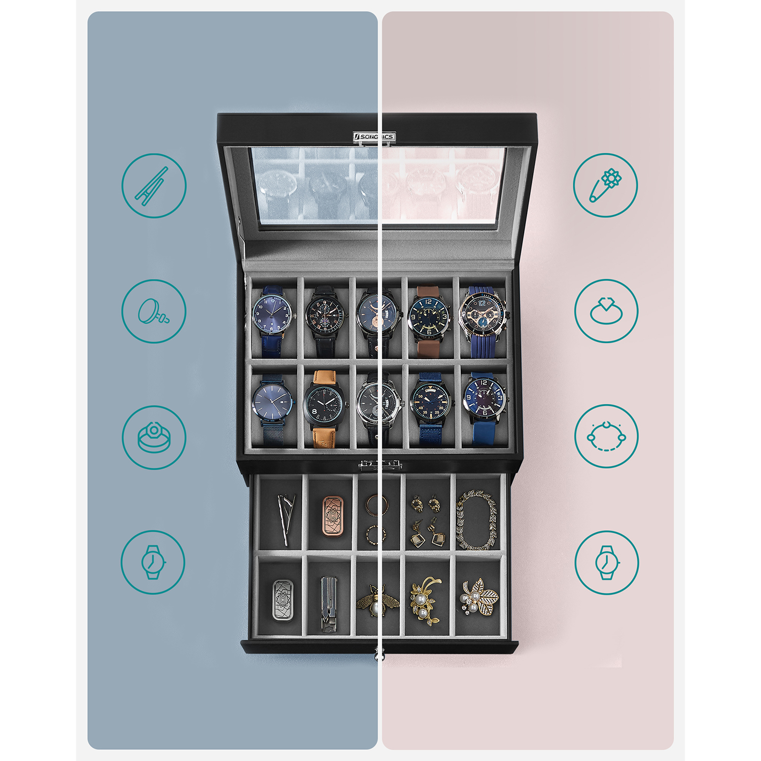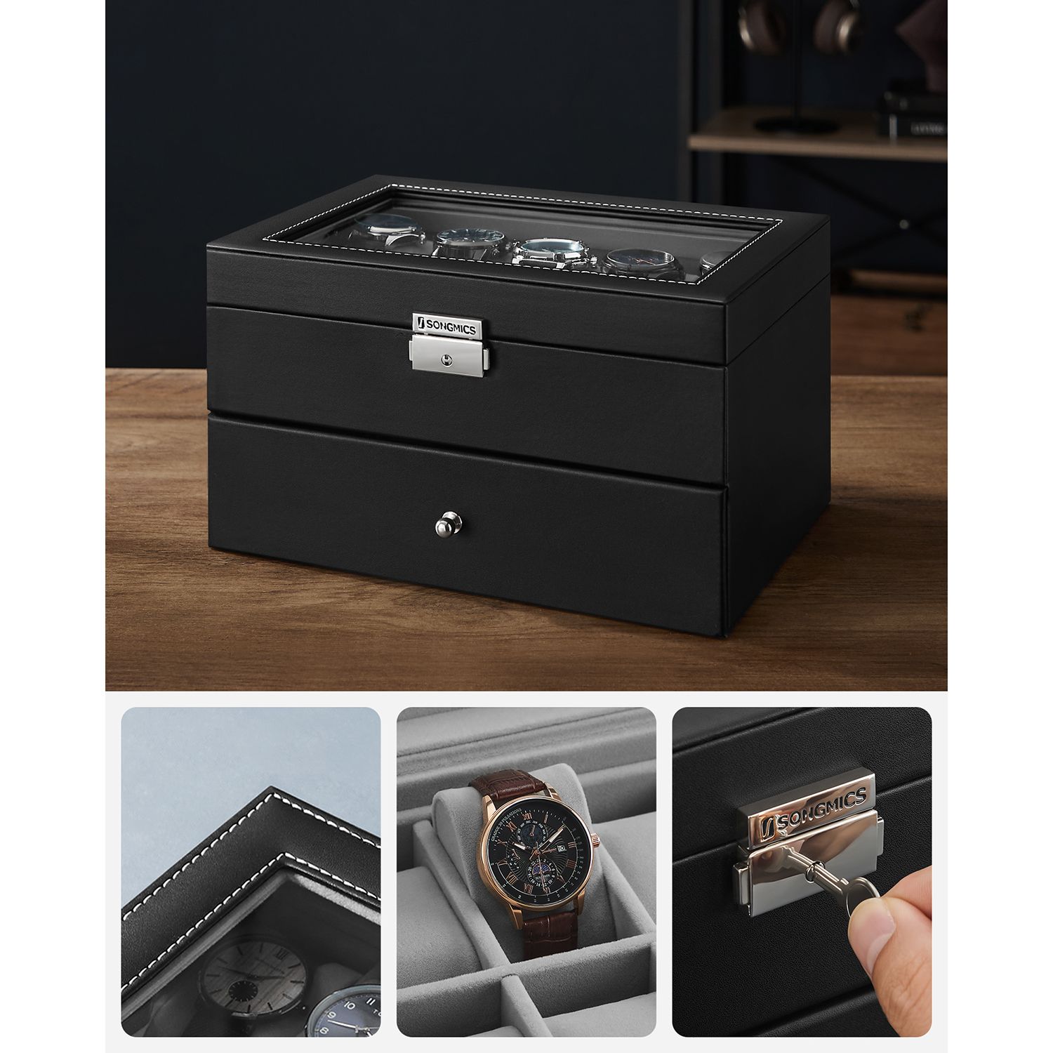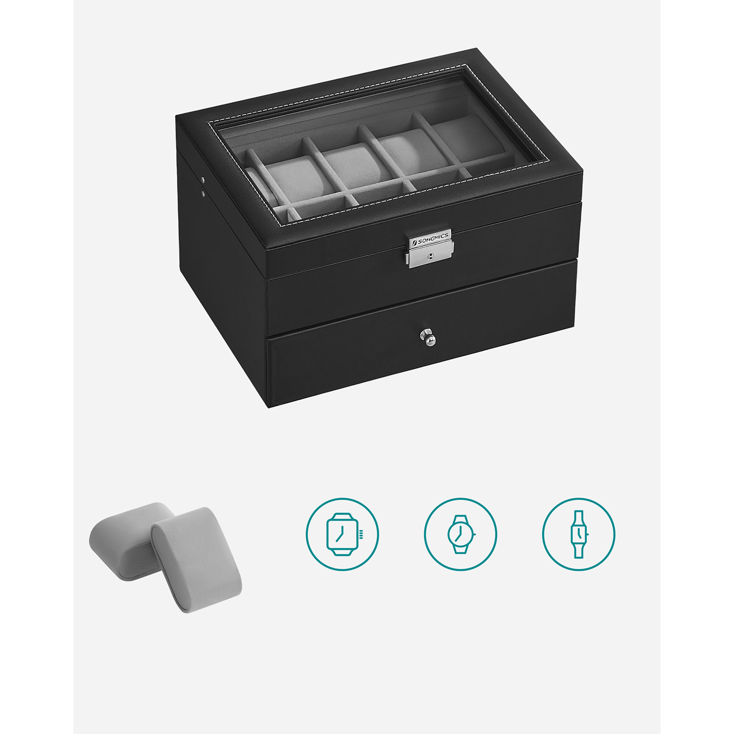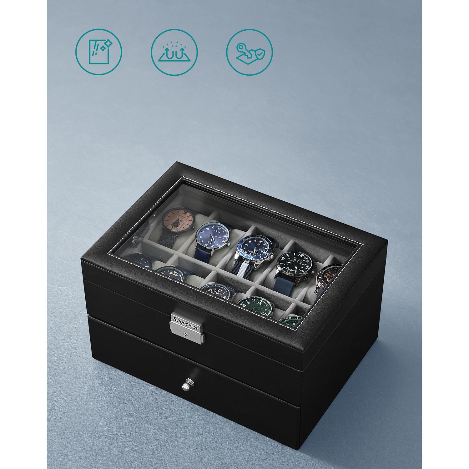 Tuotetiedot: – Tuotteen mitat: 28,5 x 20,5 x 16 cm (P x L x K) – Lokeron koko: 4,5 x 9 cm – 20 tyynyä: (kukin 4,5 x 7,5 x 4,0 cm) Helppohoitoinen: – Lasikannella varustettu kellolaatikko on kaunis. Pinnan tahrat voidaan pyyhkiä helposti hieman kostutetulla liinalla. Säilytys ja hoito – Aseta kellokotelo tuuletettuun tilaan ja vältä jättämästä koteloa pitkäksi aikaa auringonvaloon tai kosteaan tilaan. Sopiva lämpötila: 10–40 ℃. – Pinnan tahrat voidaan pyyhkiä pois hieman kostutetulla liinalla. Vältä veden pääsyä kellokoteloon. – Käytä säännöllisesti erityistä nahkahuoltotuotetta, jotta nahka säilyttää kiiltonsa pitkään.- Suojaa kellolaatikko varastoinnin aikana puristukselta. – Älä säilytä kellolaatikkoa kemikaalien kanssa. Toimitussisältö: – 1 x kellolaatikko – 2 x avain