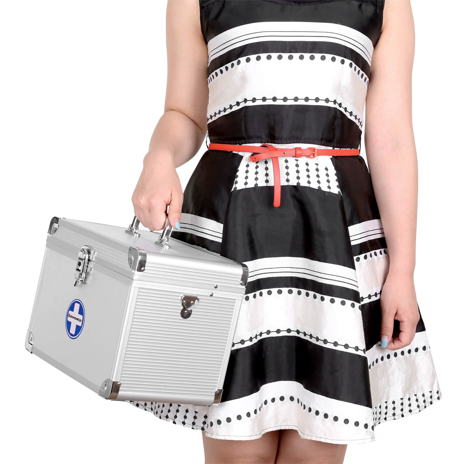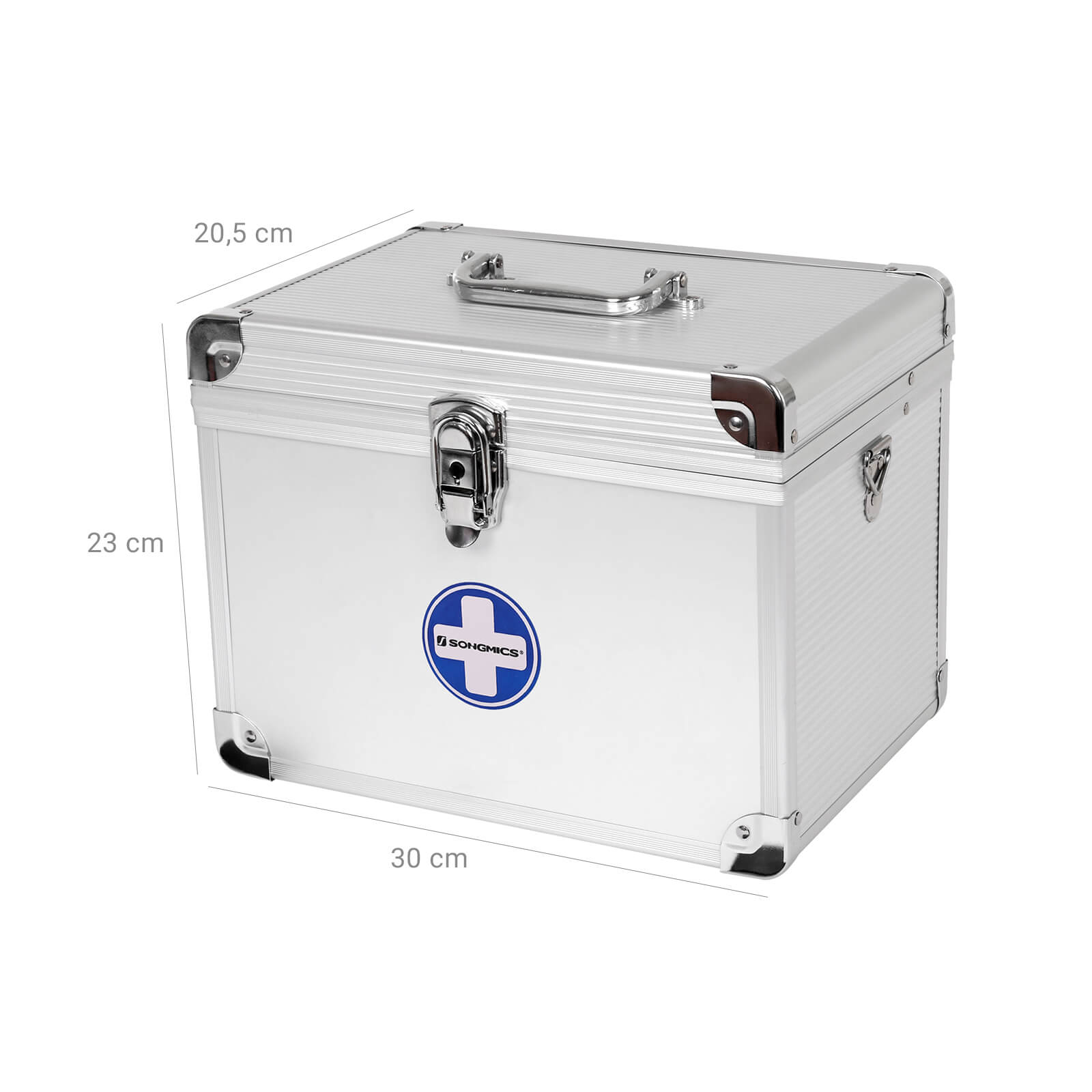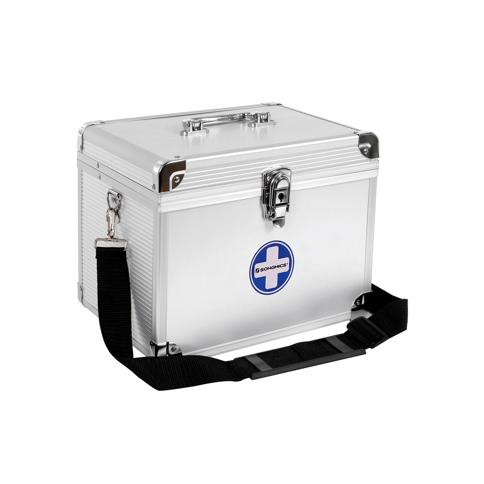 Tämä trendikäs lääkekaappi on iskunkestävä ja särkymätön, ja pitää kotiapteekkisi aina käden ulottuvilla. Sen tyylikäs ja huomiota herättävä ulkonäkö tekee siitä todellisen katseenvangitsijan! Tilava ensiapulaukku tarjoaa runsaasti tilaa kahdella tasolla ja sivutaskulla. Siihen mahtuu erilaisia haavanhoitotuotteita (siteet, kompressit, laastarit) ja yleisiä lääkkeitä. Kaikki pysyy järjestyksessä ja on aina käden ulottuvilla. Lukolla ja kahdella avaimella lääkkeet voidaan säilyttää turvallisesti poissa lasten ja muiden henkilöiden ulottuvilta. Mukavan kantokahvan ja kantohihnan ansiosta lääkekaappi on helppo kuljettaa. Huomautukset: – Ennen sulkemista sinun on kohdistettava ura oikein kotelon reunassa olevaan jouseen. – Irrotettava lokero sopii vain alle 5 cm korkeille esineille. – Ennen tilaamista tutustu laatikon mittoihin. Tuotetiedot: – Materiaali: – Runko: MDF-levy + hopeiset alumiinilistat – Verhoilu: hopeinen ABS, uritettu pinta – Sisävuori: harmaa sametti – Kahva: kromattu ABS-muovi – Kokonaismitat: 30 x 23 x 20,5 cm (L x K x S) – Mitat 1. taso: 28 x 3 x 10,5 cm (L x K x S) – Mitat suorakulmainen lokero : 17 x 3 x 9,5 cm (L x K x S) – Mitat neliönmuotoinen lokero: 9,5 x 3 x 9,5 cm (L x K x S) – Mitat 2. taso: 29 x 17 x 19 cm (L x K x S) – Mitat tasku: 12 x 8 cm (L x K) Toimitus sisältää: – 1 x lääkärilaukku – 1 x kantohihna – 2 x avain