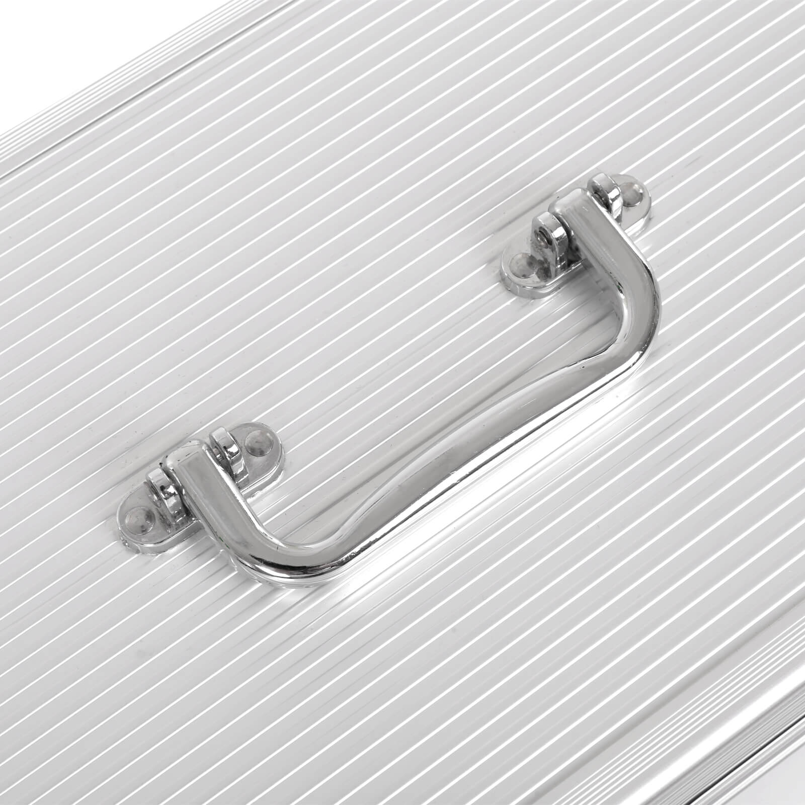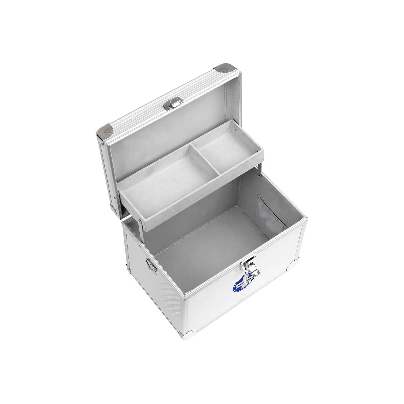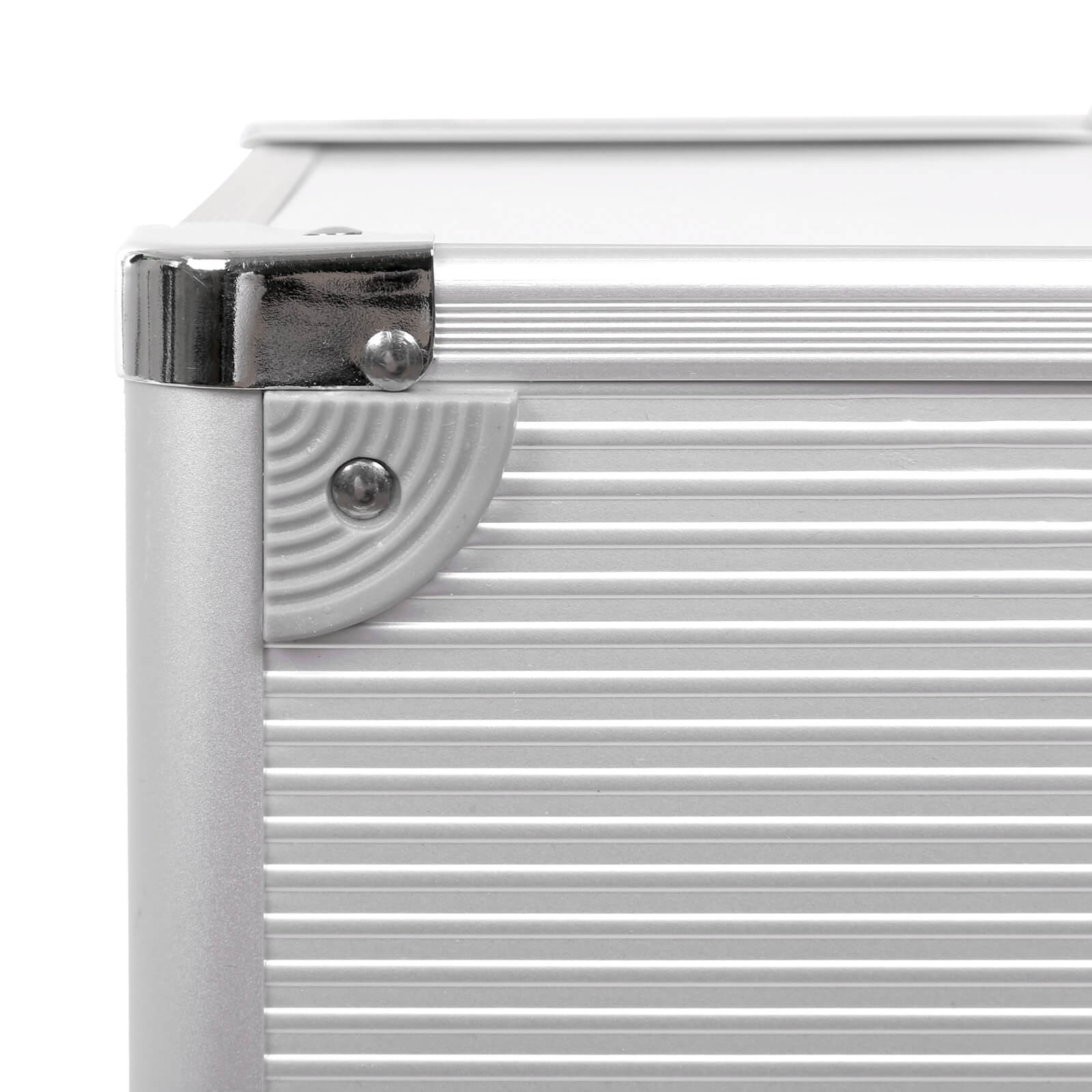 Tämä trendikäs lääkekaappi on iskunkestävä ja särkymätön, ja pitää kotiapteekkisi aina käden ulottuvilla. Sen tyylikäs ja huomiota herättävä ulkonäkö tekee siitä todellisen katseenvangitsijan! Tilava ensiapulaukku tarjoaa runsaasti tilaa kahdella tasolla ja sivutaskulla. Siihen mahtuu erilaisia haavanhoitotuotteita (siteet, kompressit, laastarit) ja yleisiä lääkkeitä. Kaikki pysyy järjestyksessä ja on aina käden ulottuvilla. Lukolla ja kahdella avaimella lääkkeet voidaan säilyttää turvallisesti poissa lasten ja muiden henkilöiden ulottuvilta. Mukavan kantokahvan ja kantohihnan ansiosta lääkekaappi on helppo kuljettaa. Huomautukset: – Ennen sulkemista sinun on kohdistettava ura oikein kotelon reunassa olevaan jouseen. – Irrotettava lokero sopii vain alle 5 cm korkeille esineille. – Ennen tilaamista tutustu laatikon mittoihin. Tuotetiedot: – Materiaali: – Runko: MDF-levy + hopeiset alumiinilistat – Verhoilu: hopeinen ABS, uritettu pinta – Sisävuori: harmaa sametti – Kahva: kromattu ABS-muovi – Kokonaismitat: 30 x 23 x 20,5 cm (L x K x S) – Mitat 1. taso: 28 x 3 x 10,5 cm (L x K x S) – Mitat suorakulmainen lokero : 17 x 3 x 9,5 cm (L x K x S) – Mitat neliönmuotoinen lokero: 9,5 x 3 x 9,5 cm (L x K x S) – Mitat 2. taso: 29 x 17 x 19 cm (L x K x S) – Mitat tasku: 12 x 8 cm (L x K) Toimitus sisältää: – 1 x lääkärilaukku – 1 x kantohihna – 2 x avain