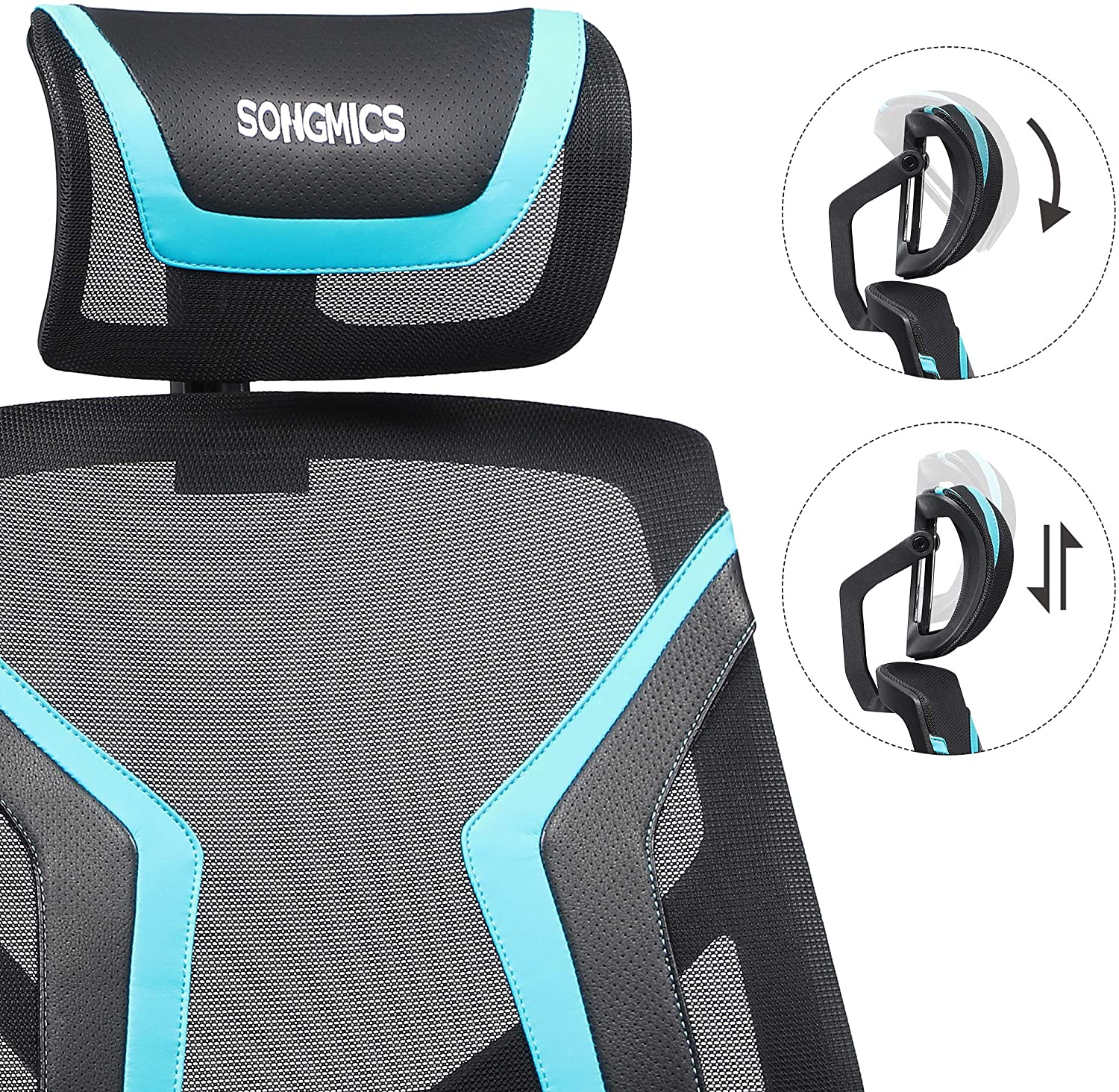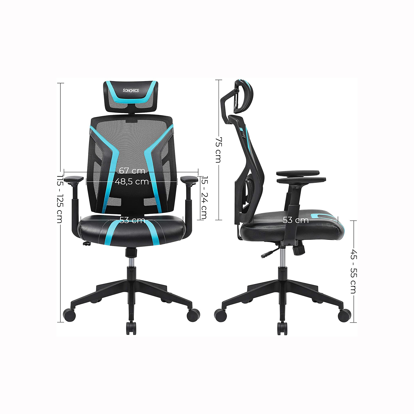 SONGMICS toimistotuoli, ergonominen pyörivä tuoli, kallistettava, säädettävä pääntuki, käsinojat ja pehmustettu lanneratatuki, pelituoli, kantavuus 120 kg, musta-sininen OBN059B01