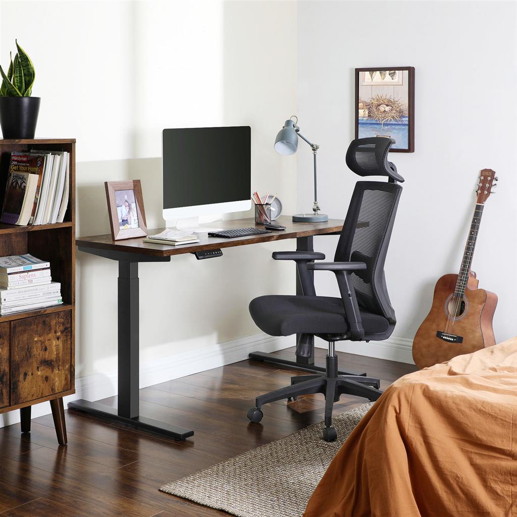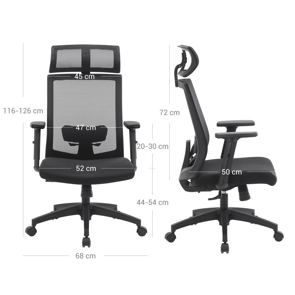 Kallistuskulman säätäminen: Kallistuskulman säätämiseksi sinun on ensin asetettava tuolin selkänoja pystyasentoon (90°). Vedä sitten tuolin sivussa olevaa vipua ulospäin. Nyt voit kallistaa selkänojaa taaksepäin 90°–120° välille. Paina vipua sisäänpäin lukitaksesi selkänojan haluttuun asentoon. Vastusasetus: Säädä kallistuskulman vastusta kääntämällä pyöreää ruuvikahvaa tuolin alaosassa. Käännä kahvaa myötäpäivään vähentääksesi vastusta; kierrä kahvaa vastapäivään lisätäksesi vastusta. Tuotetiedot: Väri: musta Materiaali: muovi, vaahtomuovi, nailon, teräs Koko: Korkeus: 116–126 cm Leveys ja syvyys: 65 x 53 cm Istuimen korkeus (lattiasta): 44–54 cm Istuimen mitat: 52 x 50 cm Selkänojan korkeus ja leveys: 72 x 45 cm Käsinojien korkeus (istuinpinnasta): 20–30 cm Pään tuen mitat: 43 x 20 cm Paino: 15,4 kg Maks. staattinen kantavuus: 120 kgToimitus sisältää:1 x verkkopäällysteinen työtuoli1 x kuusiokoloavain1 x lisävarusteet1 x ohjeet (DE, EN, IT, FR, ES)SONGMICS-ohjeet:Älä altista tuotetta suoralle auringonvalolle pitkäksi aikaa.Pidä tuote poissa terävien ja terävien esineiden läheisyydestä, jotta sen pinta ei vahingoitu.