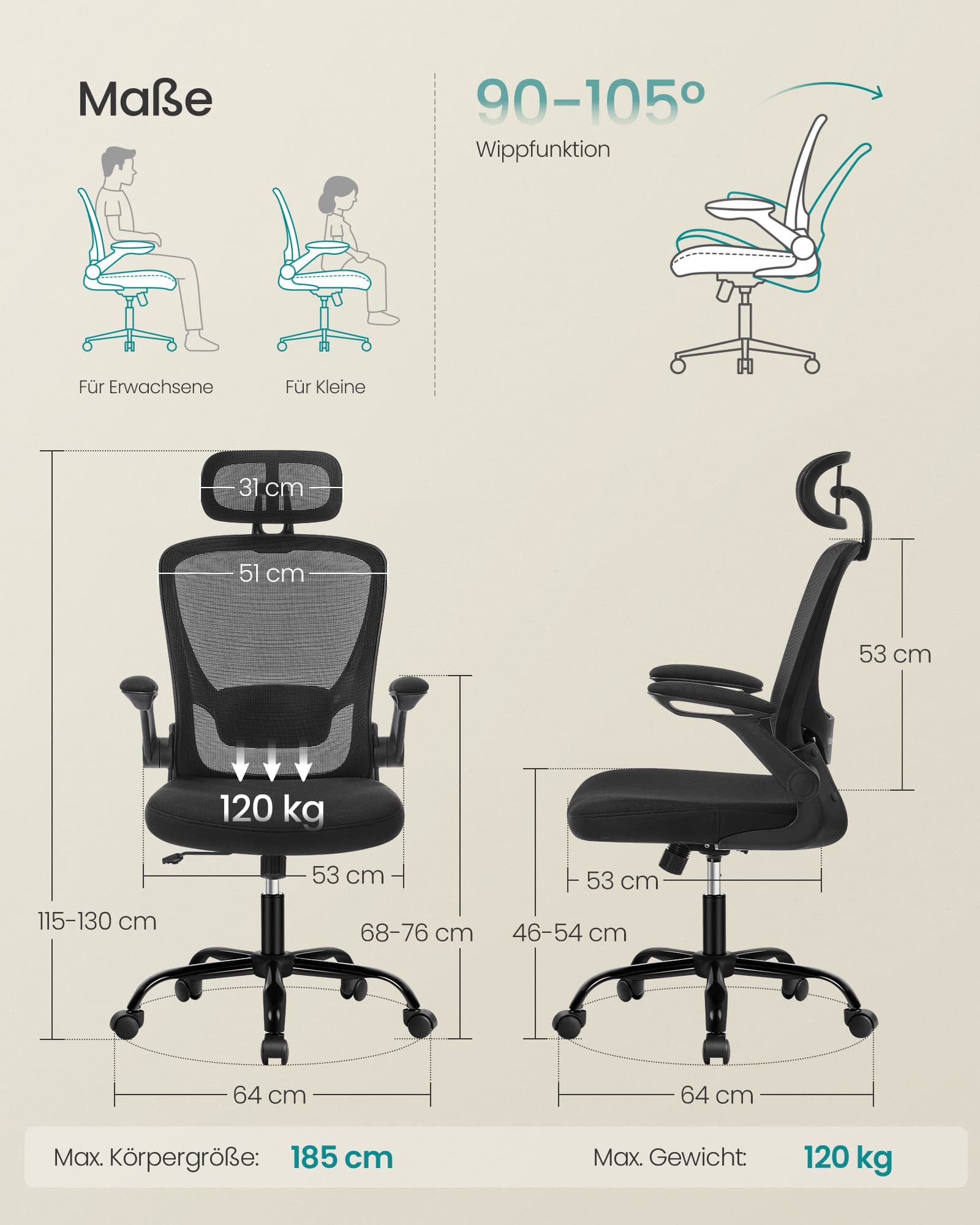 SONGMICS toimistotuoli, työtuoli, pyörivä tuoli verkkokankaalla, ergonominen, pehmustettu lanneratatuki, keinutoiminto, 53 cm:n istuin, taitettavat käsinojat