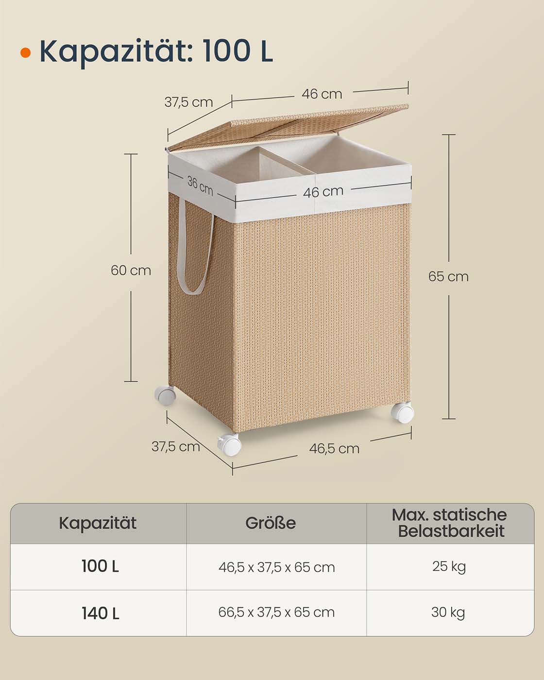 SONGMICS HOME pyykkikori 2 lokeroa, pyykkikori 100 l, pyykkisäilytys rullilla, kannella, pyykkipussi kahvoilla, rottinkimainen ulkonäkö, pesutupa, kylpyhuone, luonnonbeige-matta valkoinen LCB601N01
