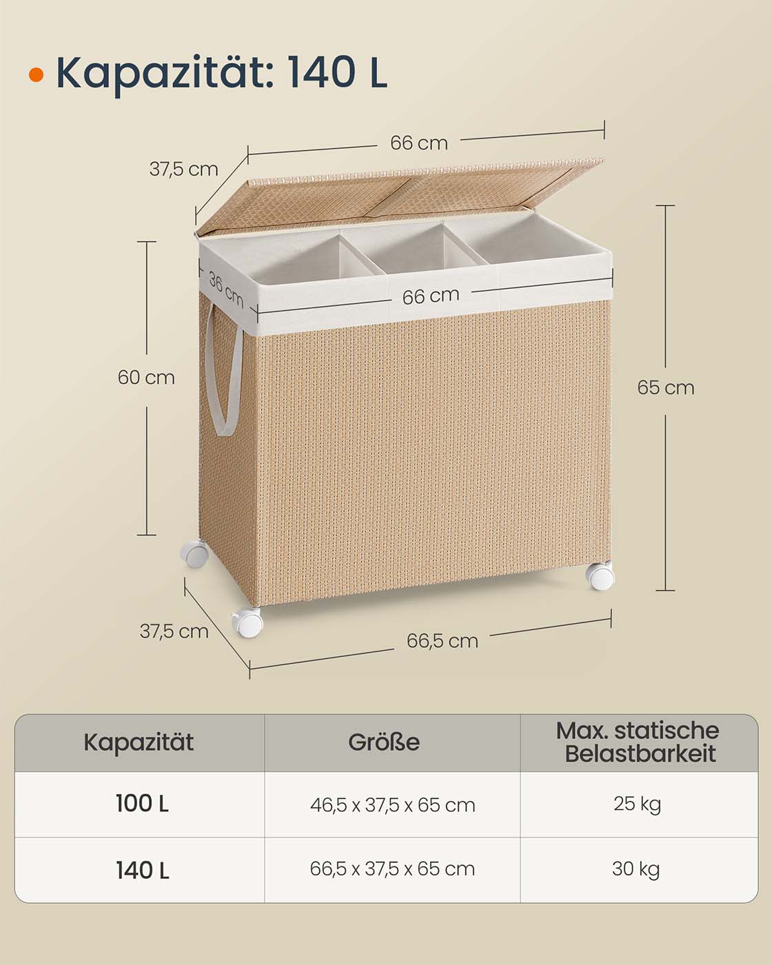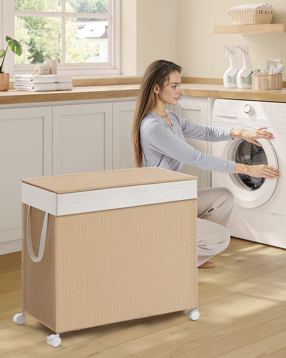 SONGMICS HOME pyykkikori 2 lokeroa, pyykkikori 100 l, pyykkisäilytys rullilla, kannella, pyykkipussi kahvoilla, rottinkimainen ulkonäkö, pesutupa, kylpyhuone, luonnonbeige-matta valkoinen LCB601N01