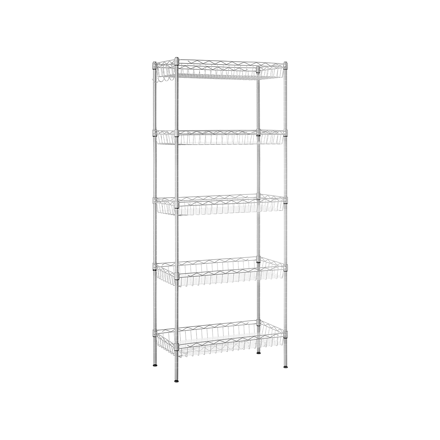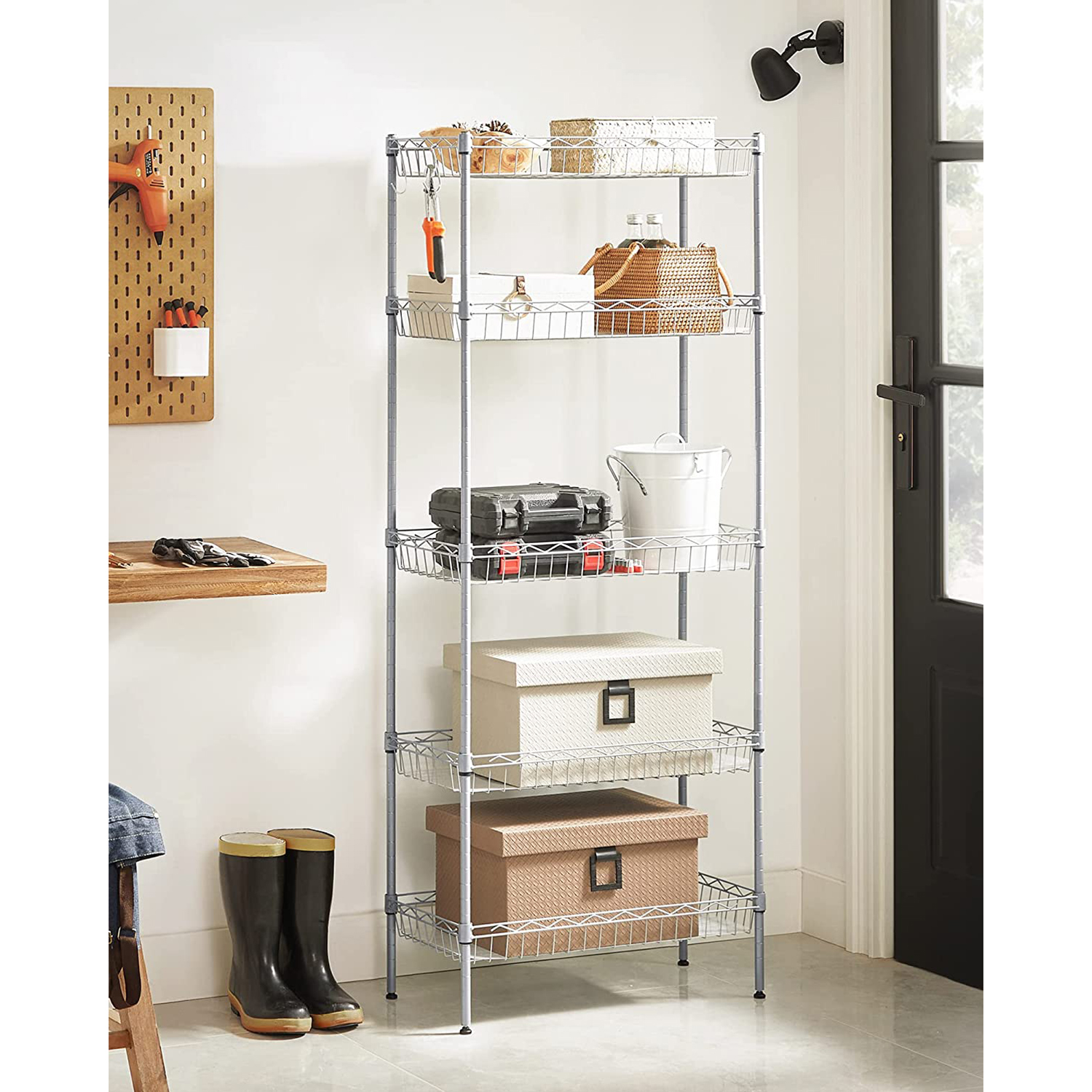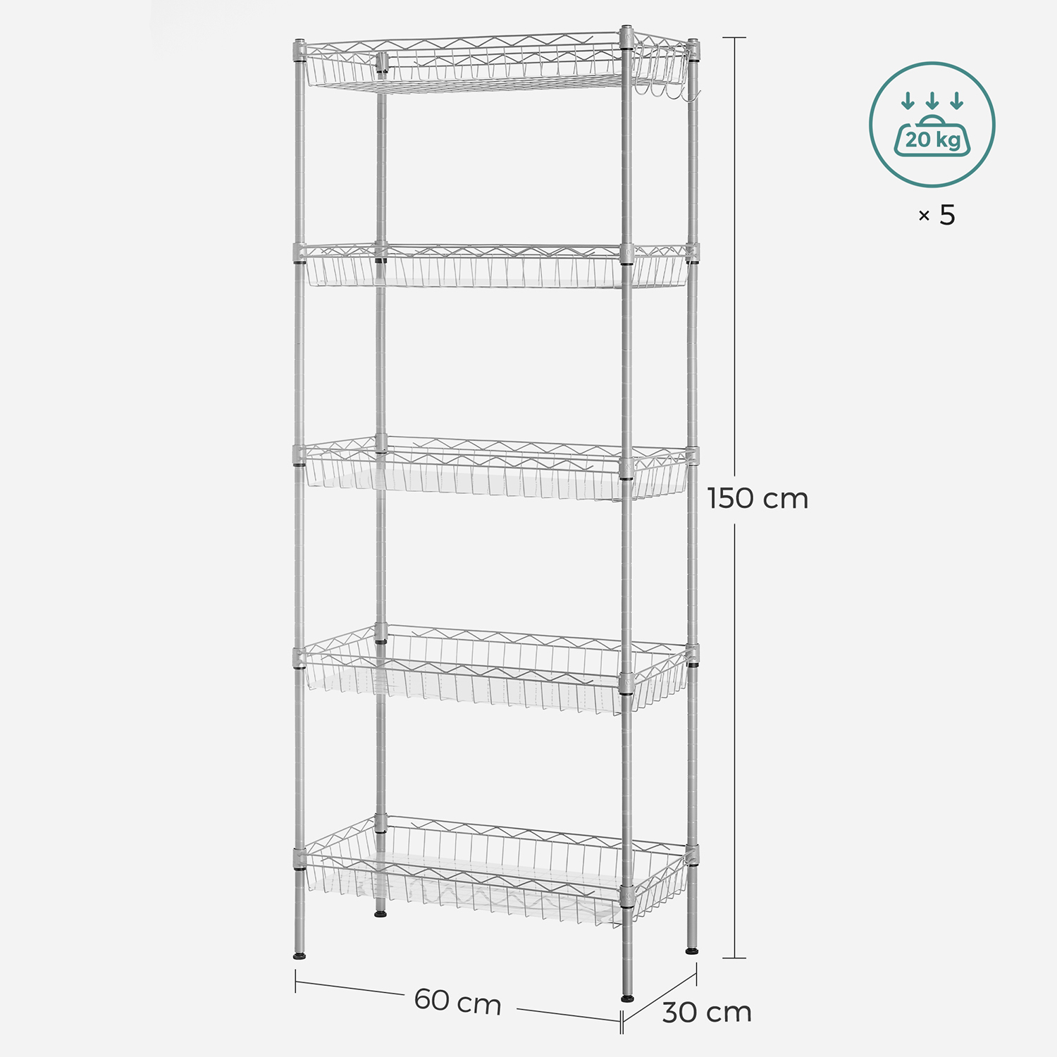Tuotetiedot: Väri: hopea Materiaali: teräs Koko: 60 x 30 x 150 cm (P x L x K) Paino: 5,4 kg Maks. staattinen kantavuus hyllytasoa kohti: 20 kg Toimitus sisältää: 1 x säilytyshylly 5 x PP-levy 4 x koukku 1 x kaatumissuoja 1 x ohjeet SONGMICS Huomautukset:Muovikiinnikkeitä asennettaessa TOP-nuoli tulee aina osoittaa ylöspäin. Tarkista asennuksen jälkeen kaikki kiinnikkeet varmistaaksesi, että ne eivät liiku. Varmista, että kiinnikkeet on kiinnitetty neljään putkeen samalle korkeudelle, jotta hyllyt ovat vaakatasossa. Hyllytasojen suurin staattinen kantavuus on 20 kg. Älä ylitä tätä enimmäispainoa. Kiinnitä tuote seinään kaatumissuojalla, jotta sen käyttö on turvallista.