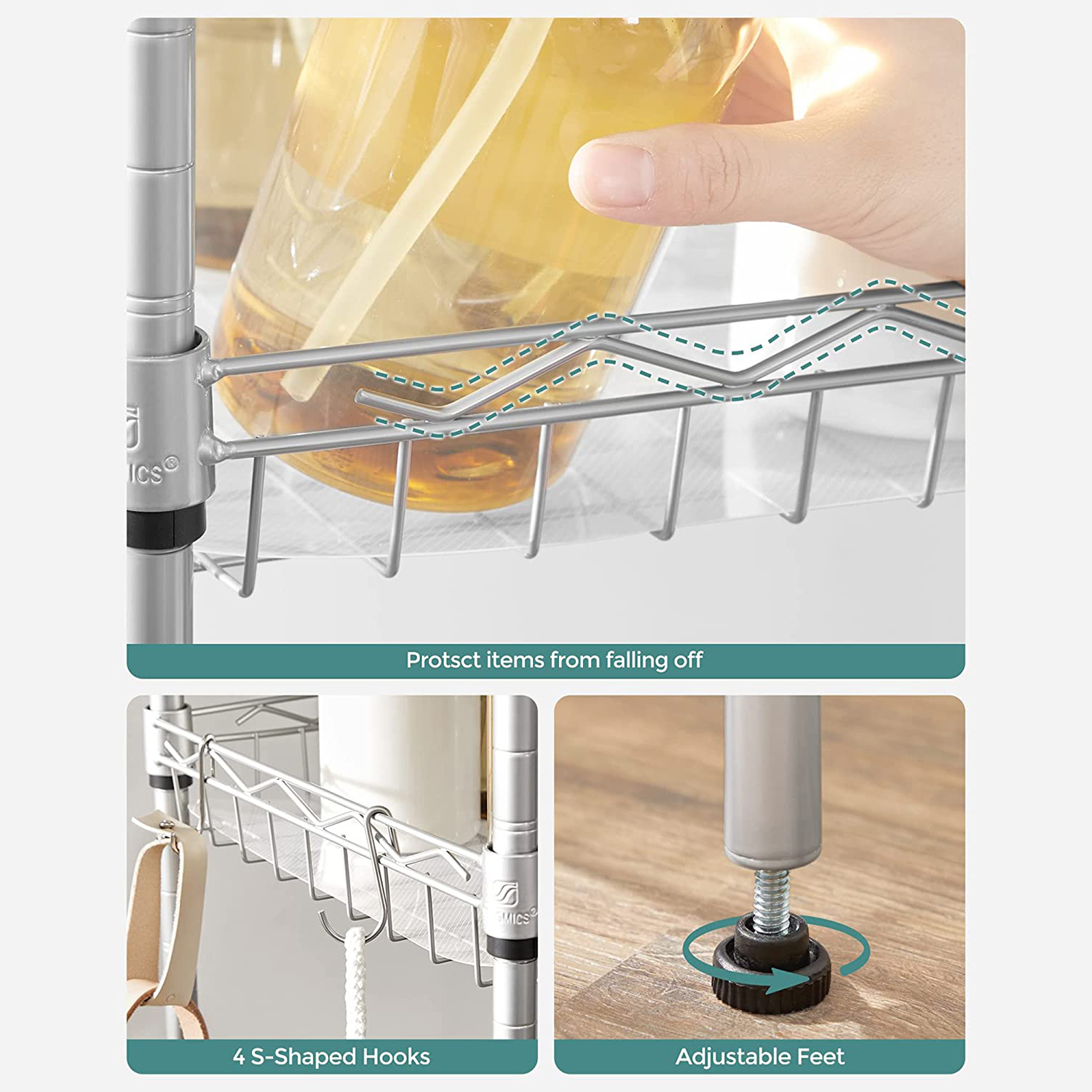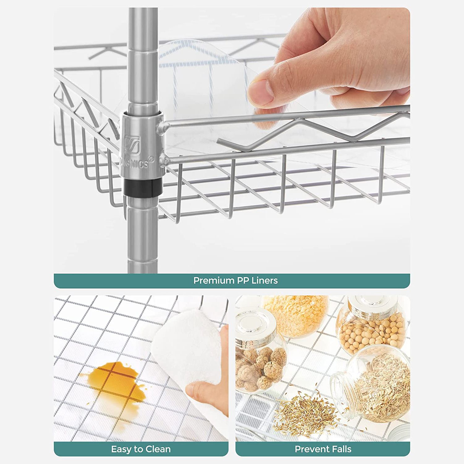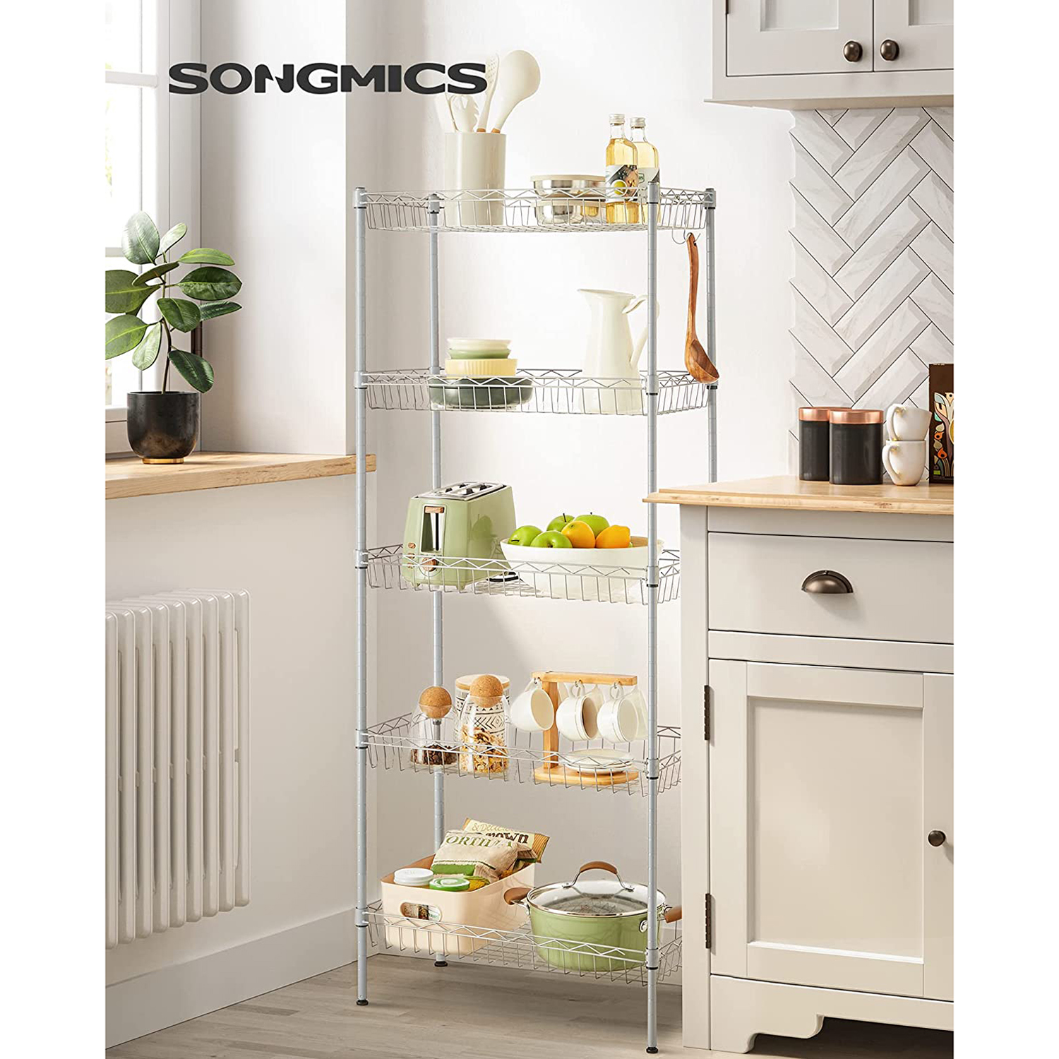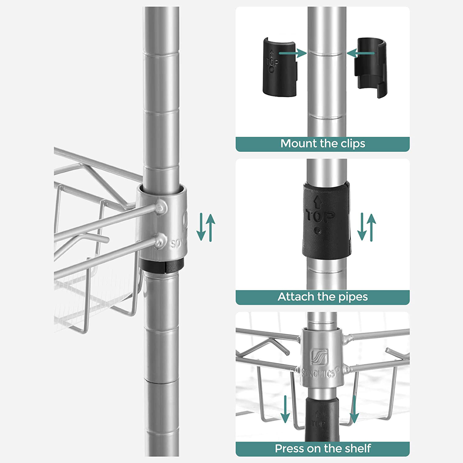 Tuotetiedot: Väri: hopea Materiaali: teräs Koko: 60 x 30 x 150 cm (P x L x K) Paino: 5,4 kg Maks. staattinen kantavuus hyllytasoa kohti: 20 kg Toimitus sisältää: 1 x säilytyshylly 5 x PP-levy 4 x koukku 1 x kaatumissuoja 1 x ohjeet SONGMICS Huomautukset:Muovikiinnikkeitä asennettaessa TOP-nuoli tulee aina osoittaa ylöspäin. Tarkista asennuksen jälkeen kaikki kiinnikkeet varmistaaksesi, että ne eivät liiku. Varmista, että kiinnikkeet on kiinnitetty neljään putkeen samalle korkeudelle, jotta hyllyt ovat vaakatasossa. Hyllytasojen suurin staattinen kantavuus on 20 kg. Älä ylitä tätä enimmäispainoa. Kiinnitä tuote seinään kaatumissuojalla, jotta sen käyttö on turvallista.