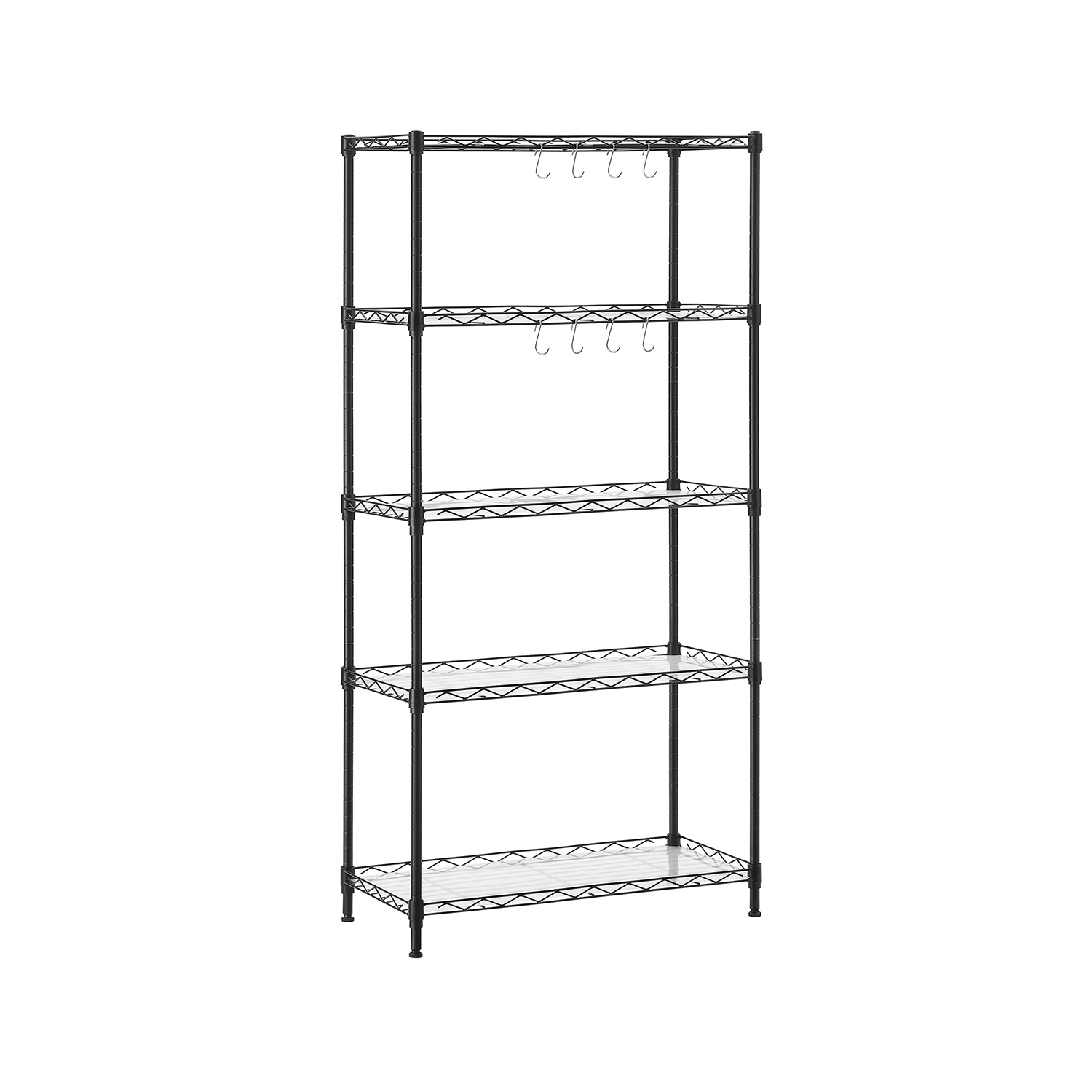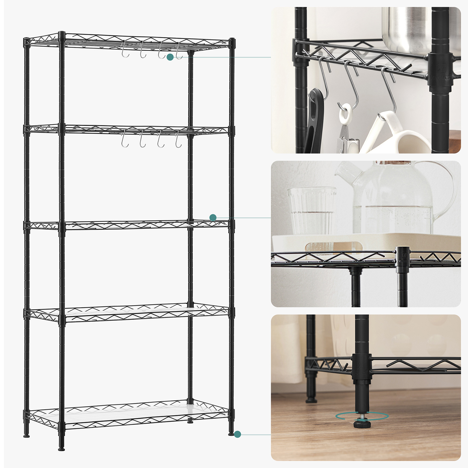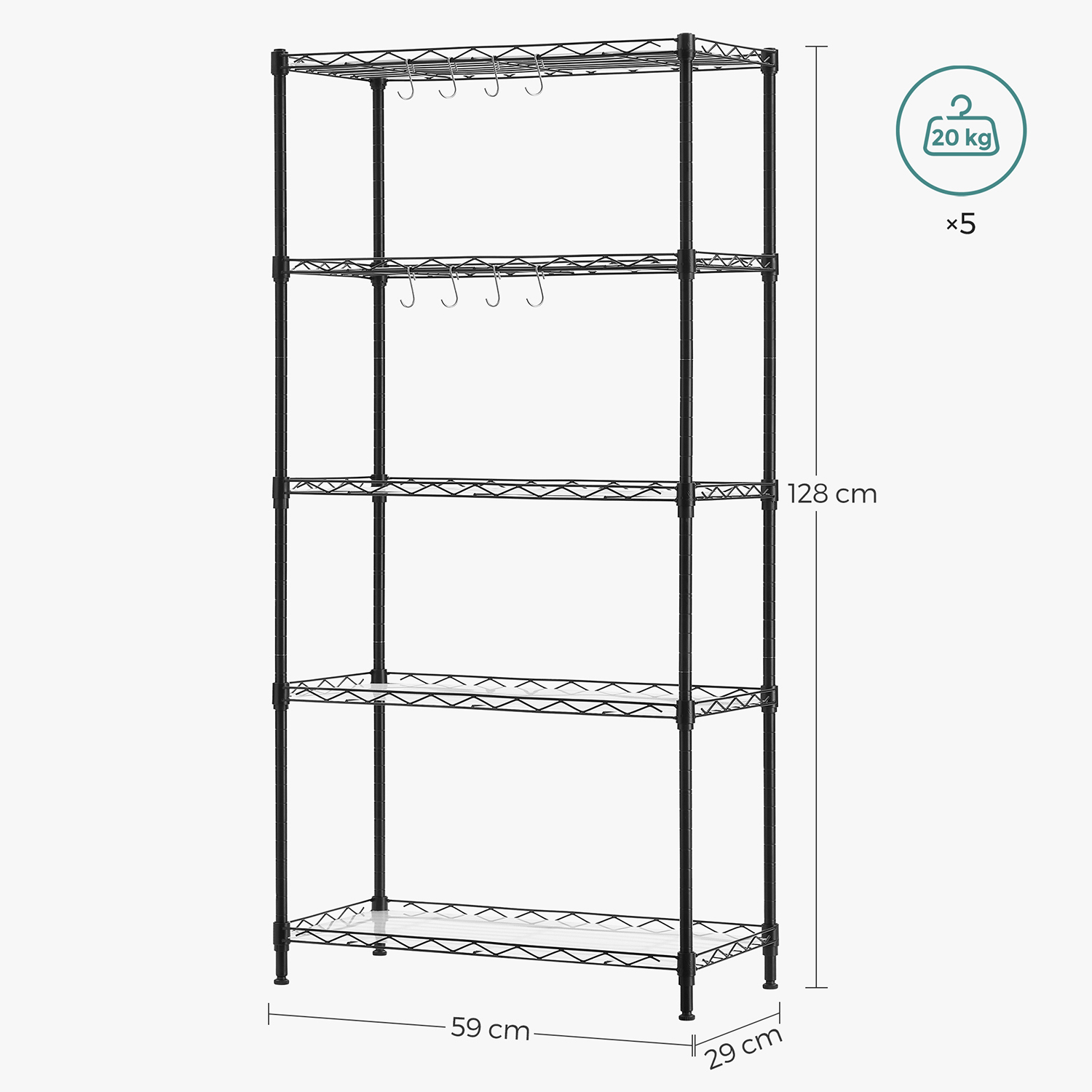 Tuotetiedot: – Väri: musta – Materiaali: teräs – Koko: 59 x 29 x 128 cm (P x L x K) – Paino: 5 kg – Maks. staattinen kantavuus hyllytasoa kohti: 20 kg – Maks. staattinen kantavuus yhteensä: 100 kg Toimitus sisältää:- 1 x keittiöhylly – 5 x PP-levy – 8 x S-koukku – 1 x kaatumissuoja – 1 x ohjeet SONGMICS Huomautukset: – Muovikiinnikkeitä asennettaessa TOP-nuolen tulee aina osoittaa ylöspäin. Tarkista asennuksen jälkeen kaikki kiinnikkeet varmistaaksesi, että ne eivät liiku. – Varmista, että kaikki kiinnikkeet ovat kunnolla lukittuneet pystytankojen syvennyksiin, jotta hyllyt ovat keittiön pöydän kanssa samansuuntaiset. – Kiinnitä tuote seinään kaatumissuojalla turvallisen käytön varmistamiseksi.