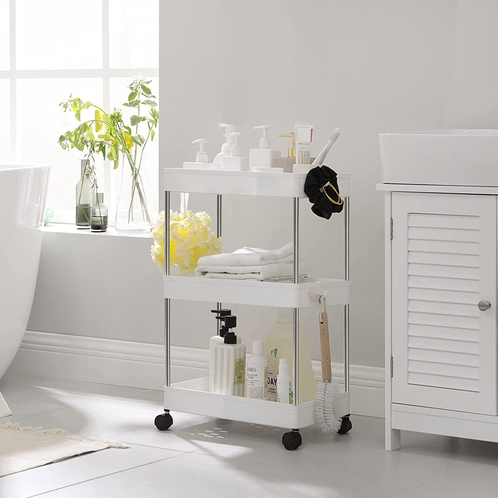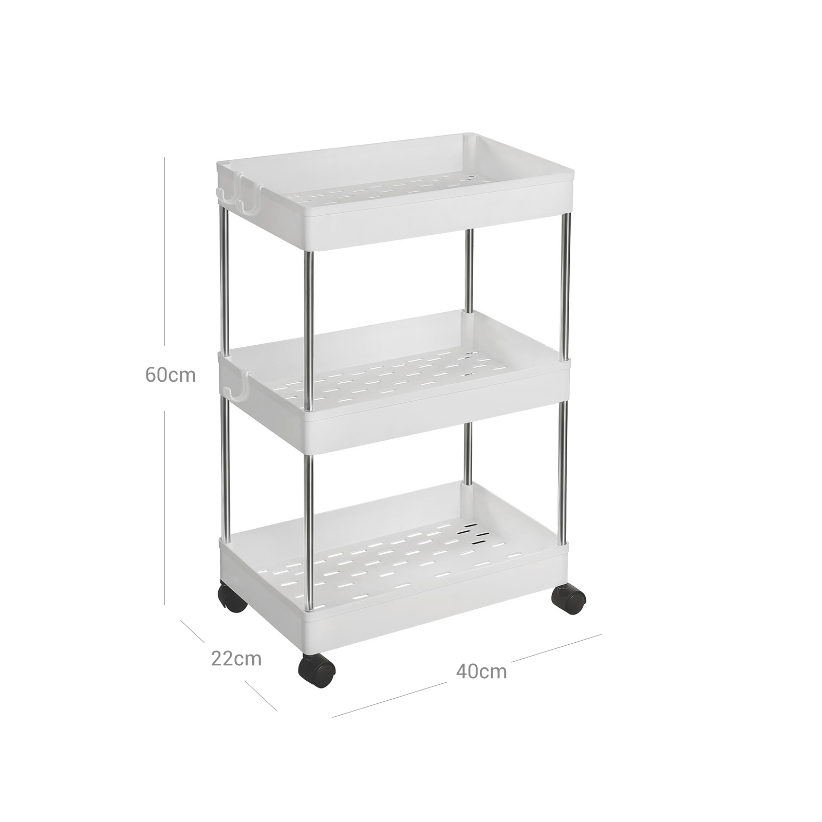 Ovatko jotkut esineet, joita käytit eilen, kadonneet tänään, ja joudut viettämään paljon aikaa niiden etsimiseen? Älä huoli, tämä SONGMICS-rullavaunu auttaa sinua lopettamaan tämän ärsyttävän piiloleikin! Kaikki käden ulottuvilla 3 korkealaatuisella PP-muovihyllyllä ja tukevilla metalliputkilla varustettu rullavaunu tarjoaa riittävästi tilaa kaikille esineille, joilla ei vielä ole vakiopaikkaa kotonasi. Tämä monipuolinen vaunu kestää myös niiden painon ongelmitta. Lisäksi tarjoiluvaunu sopii kompaktin kokonsa (40 x 22 x 60 cm) ansiosta täydellisesti kylpyhuoneeseen kauneustuotteiden säilyttämiseen, keittiöön keittiötarvikkeiden säilyttämiseen tai toimistoon asiakirjojen säilyttämiseen. Jos haluat usein käyttämäsi esineet aina käden ulottuvilla, tämä SONGMICS-tuote on juuri sinulle sopiva! Tuotetiedot: – Väri: valkoinen – Materiaali: PP (polypropeeni), metalliputket – Koko: 40 x 22 x 60 cm (P x L x K) – Paino: 1,2 kg – Maks. staattinen kokonaiskuormitus: 15 kg – Maks. staattinen kuormitus hyllyä kohti: 5 kg Toimitus sisältää:- 1 x rullavaunu – 3 x koukku – 1 x ohjeet (DE, EN, DE, FR, ES, IT) SONGMICS-ohjeet: – Asenna tuote vain tämän ohjeen mukaisesti. Älä pura sitä väkisin. – Jokainen hylly kestää enintään 5 kg:n kuormituksen. Älä säilytä tuotteella raskaampia esineitä.