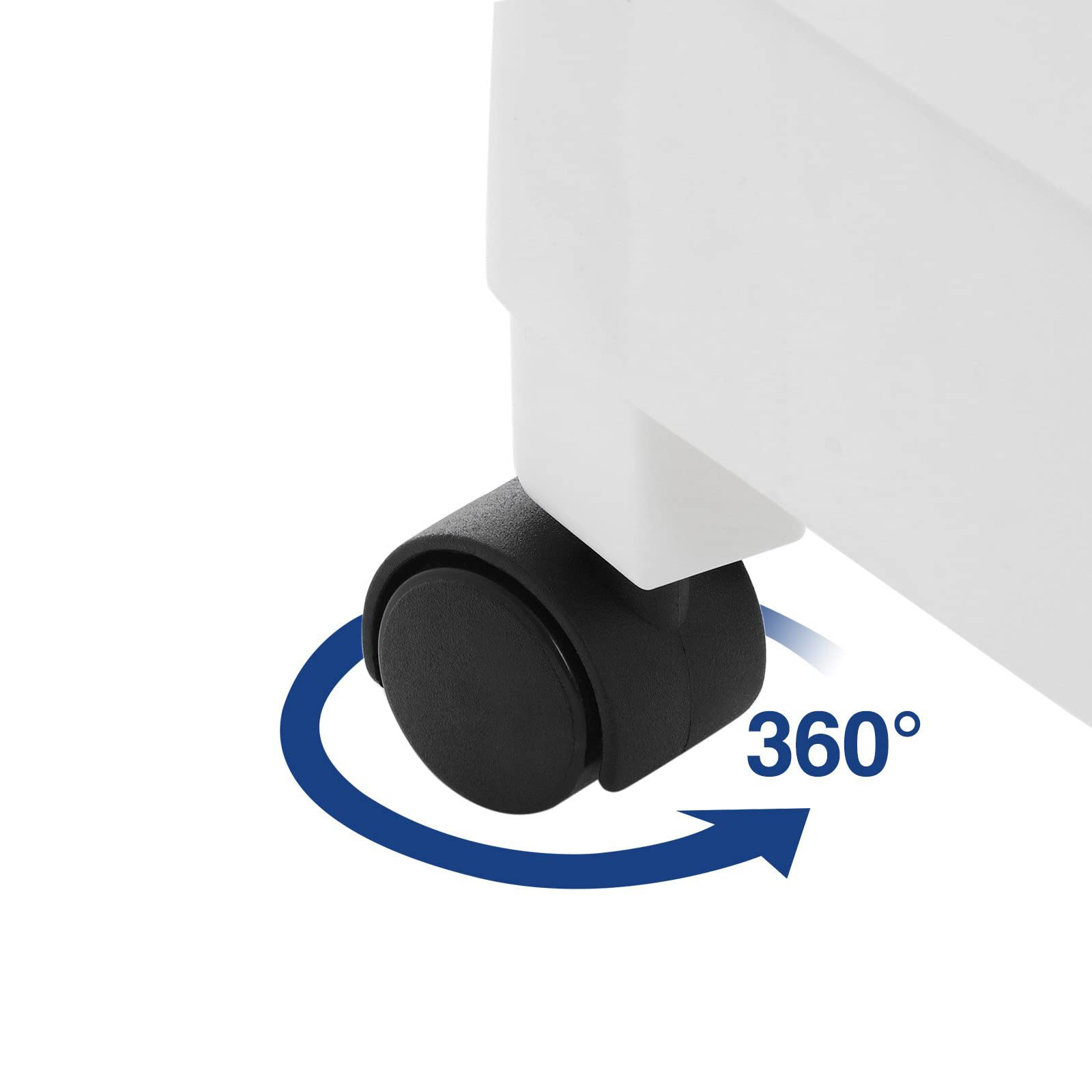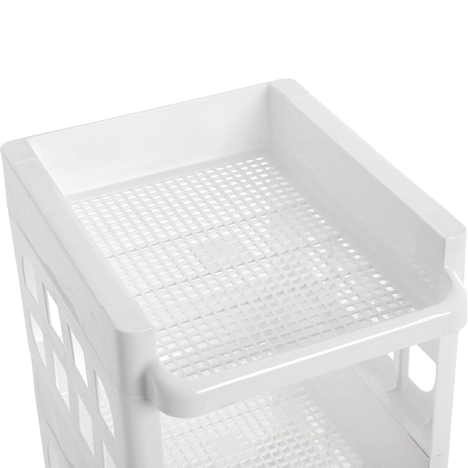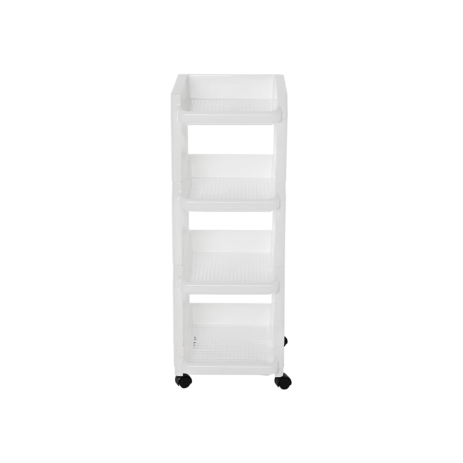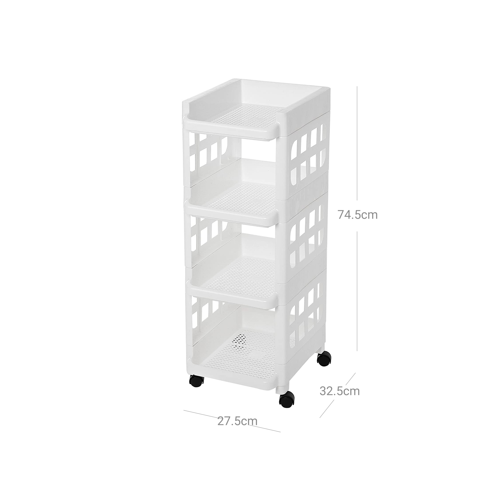 Tämä PP-muovista valmistettu rullavaunu on visuaalisesti houkutteleva tyylikkään valkoisena ja käytännöllinen neljän hyllyn ansiosta, ja se sopii täydellisesti erilaisiin tilanteisiin. Neljän universaalin rullan ansiosta se takaa erinomaisen joustavuuden/liikkuvuuden, joten saat tarvitsemasi tavarat nopeasti ja siististi käsiisi. Tuotetiedot: – Väri: valkoinen – Materiaali: PP-muovi – Tuotteen mitat: 27,5 x 74,5 x 32,5 cm (L x K x S) – Väli: 21 cm – Paino: 1,95 kg – Kantavuus: 20 kgToimitus sisältää:- 1 x rullavaunu – 1 x ohjeet (DE, EN, FR, ES, IT) Huomautukset: – Älä aseta liian painavia esineitä tuotteen päälle. Pitkän käyttöiän saavuttamiseksi vältä tämän tuotteen toistuva kokoaminen ja purkaminen. – Tuotetta tulee suojata lämmönlähteiltä.