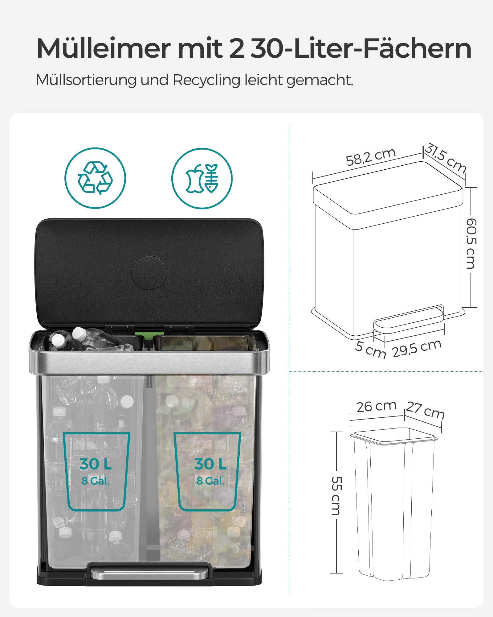 SONGMICS Keittiön roskakori, 2 x 30 l, jätteiden lajittelujärjestelmä, 2 lokeroa, 15 roskapussia, ruostumattomasta teräksestä valmistettu roskakori, muovinen sisäkori, kansi, pehmeä sulkeutuminen, 58 x 31,5 x 59 cm