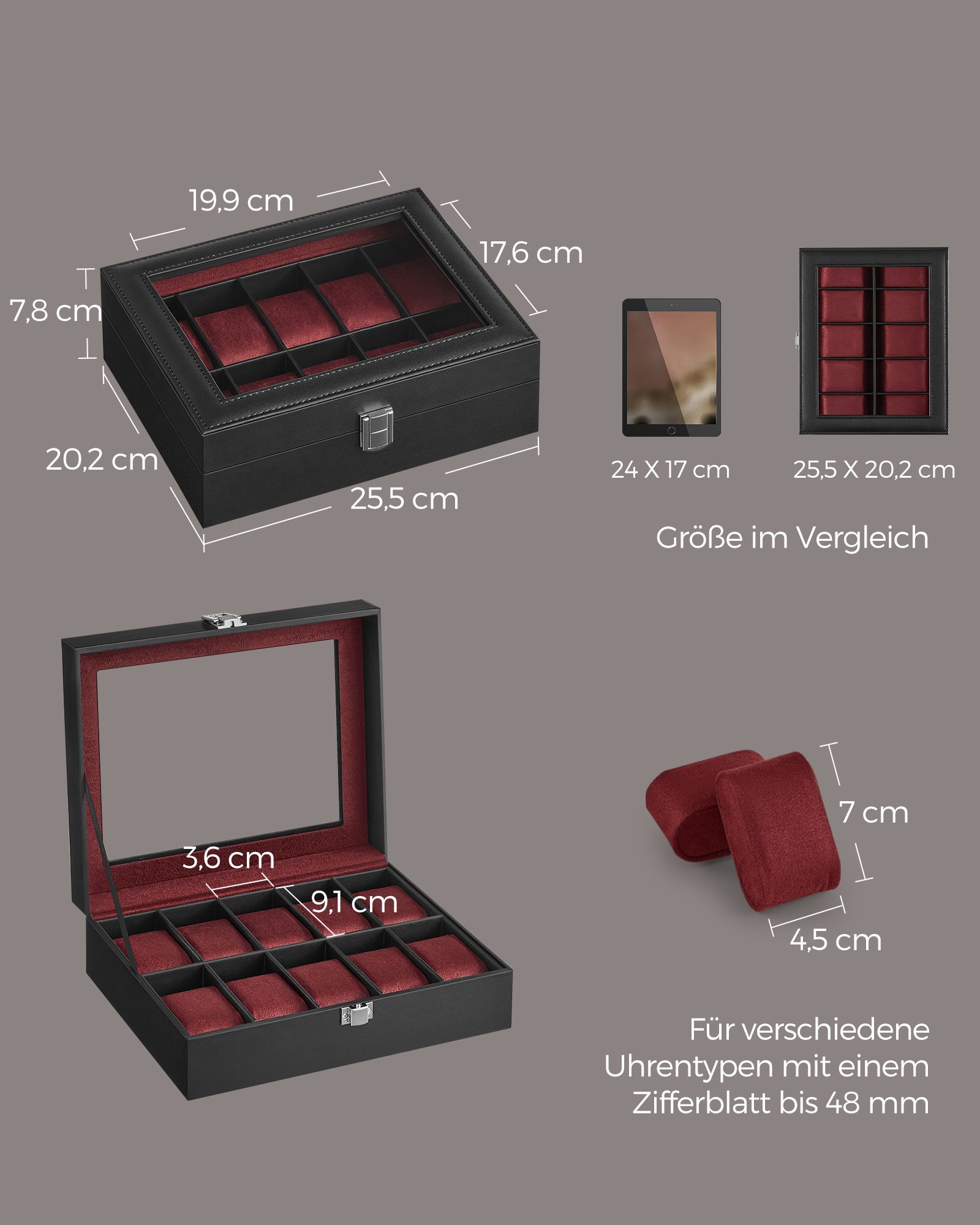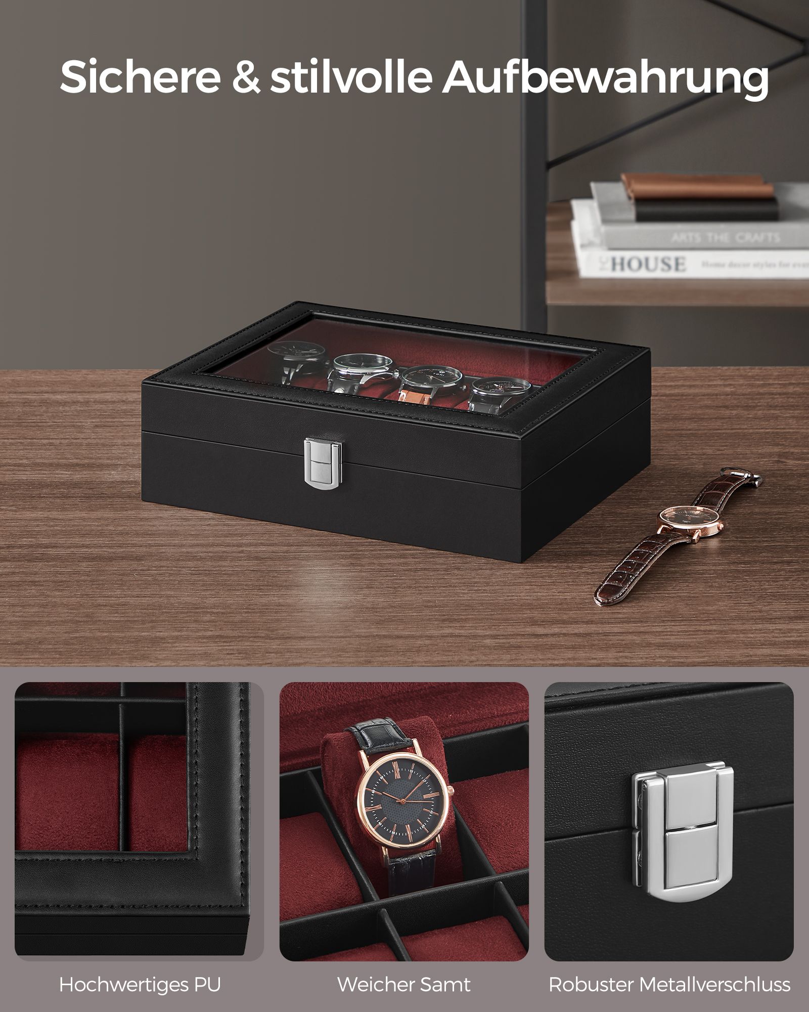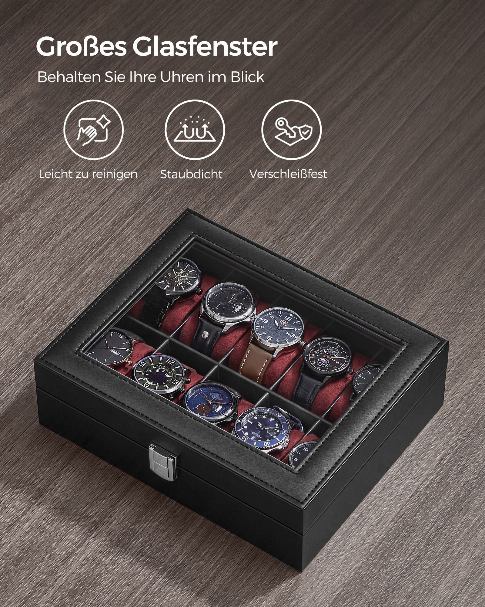 SONGMICS kellolaatikko 10 kellolle, lasi-ikkuna, musta JWB010
