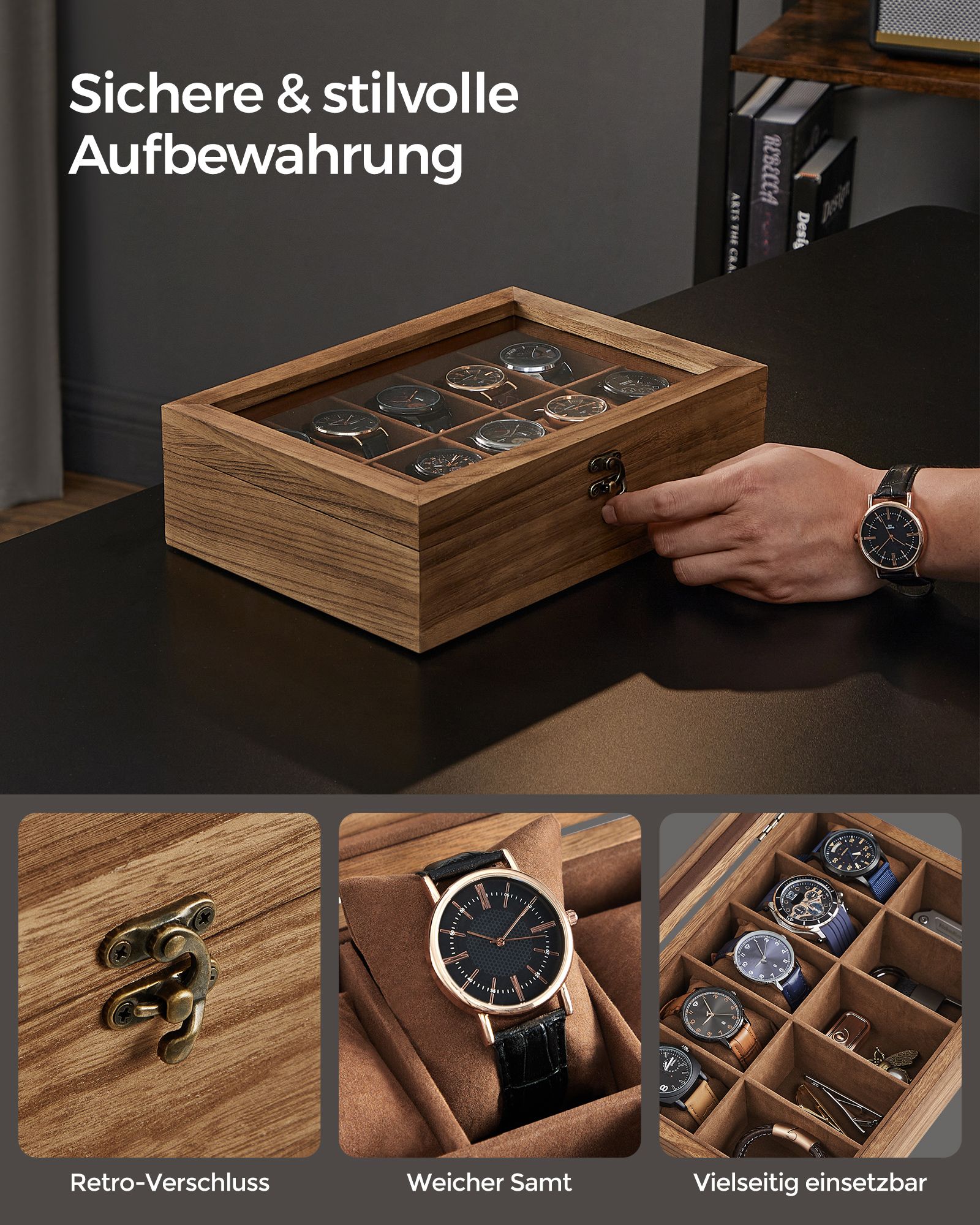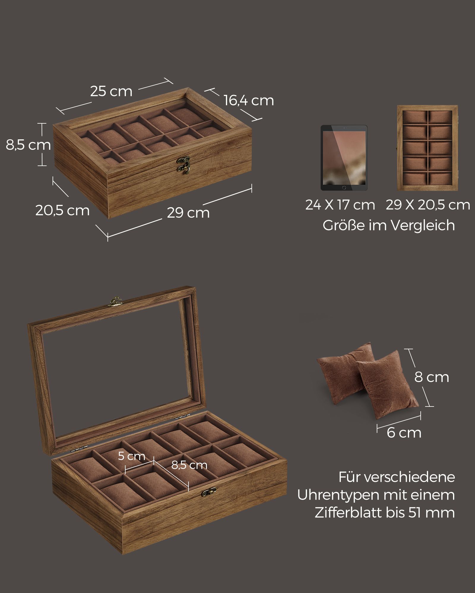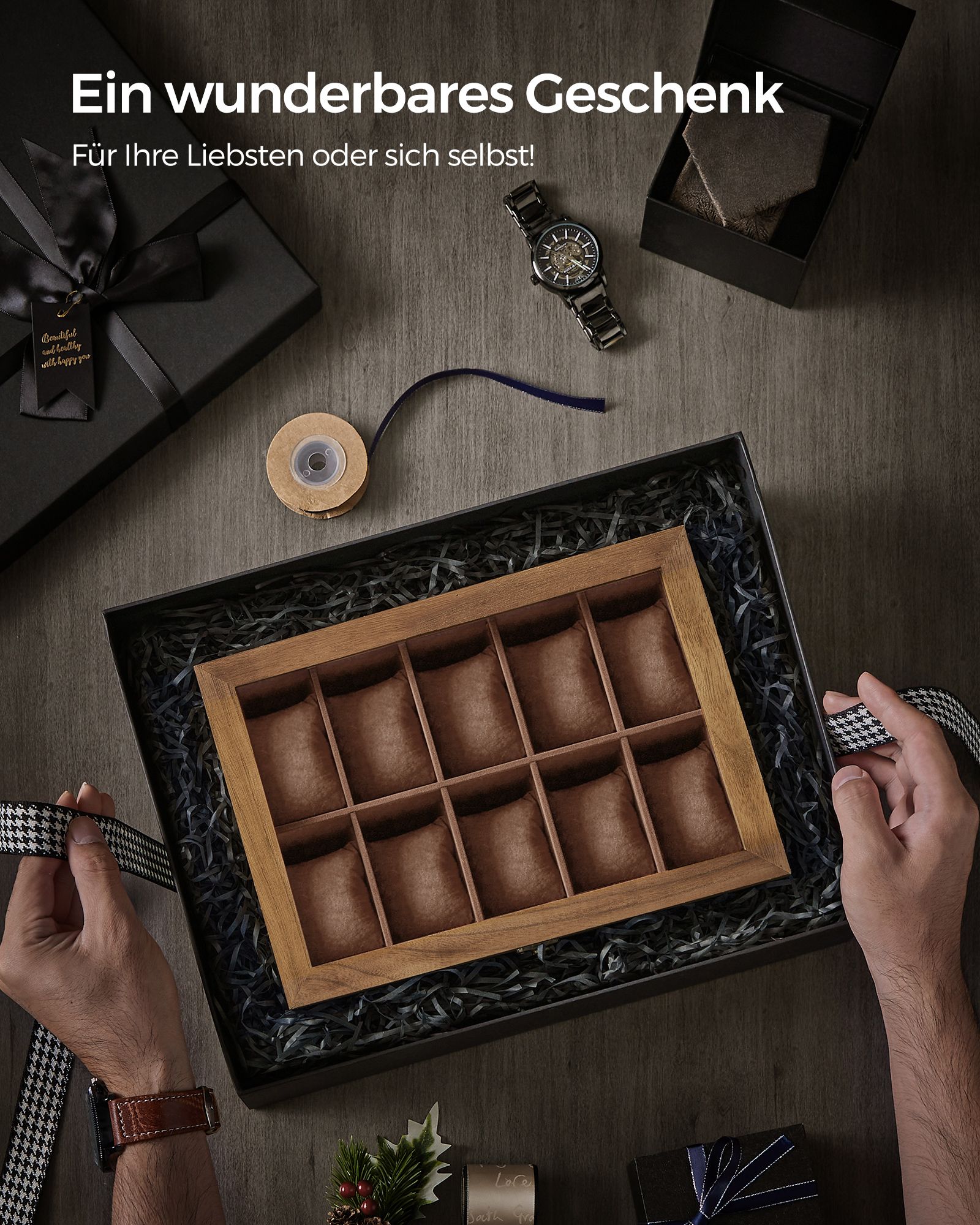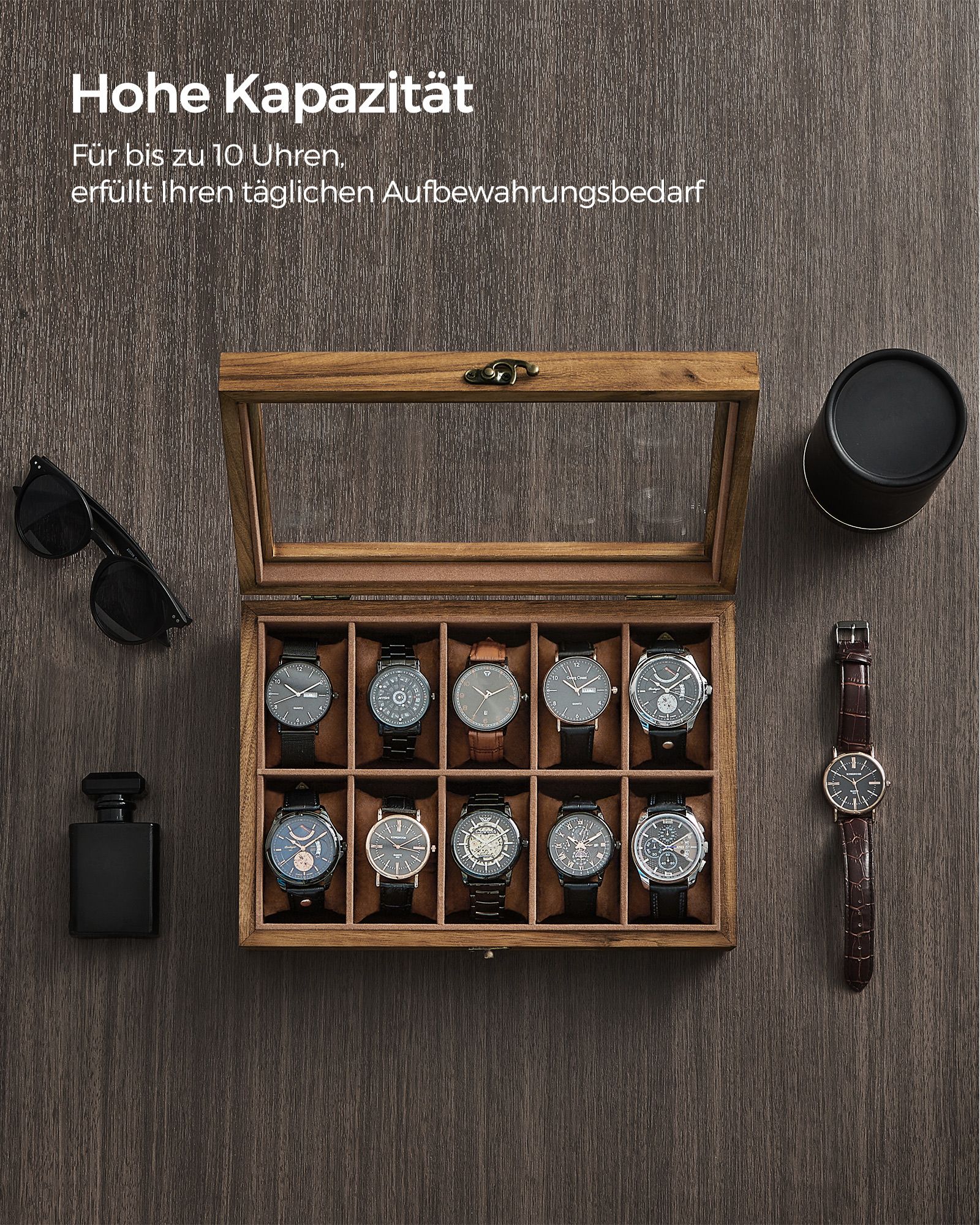 SONGMICS kellolaatikko, 10 lokeroa, massiivipuinen kellokotelo, lasikansi, kellotyyny, lahja rakkaimmillesi