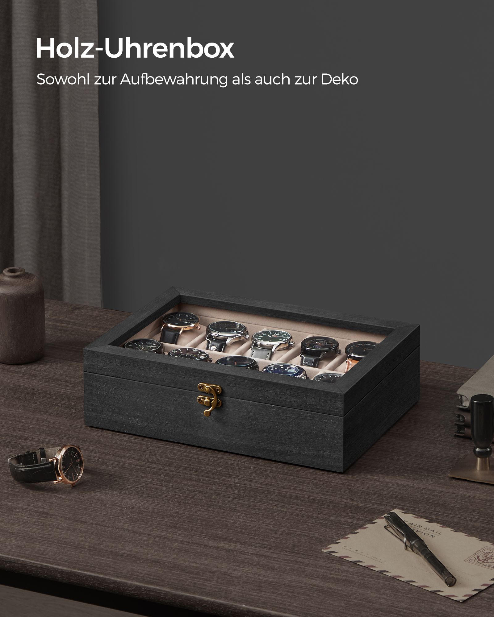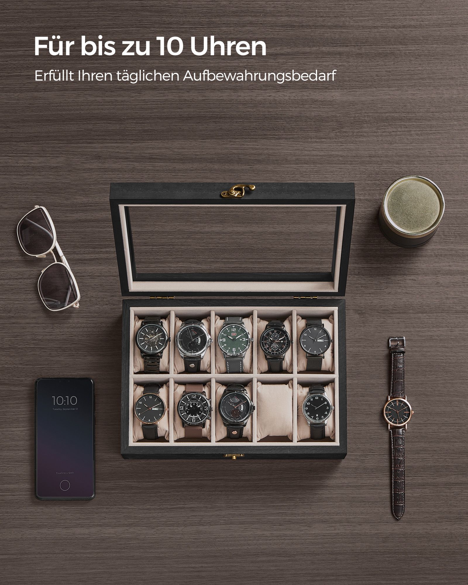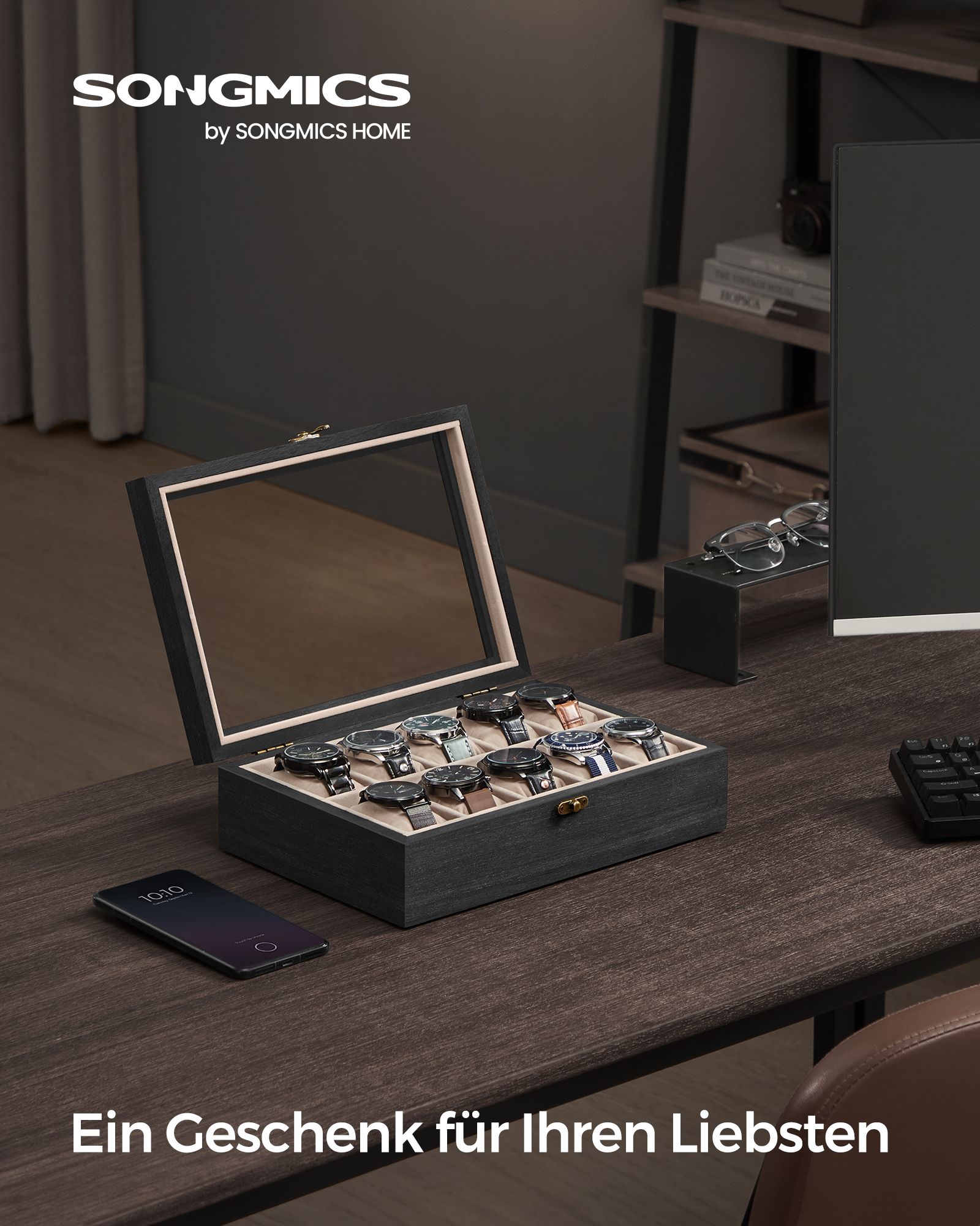 SONGMICS kellolaatikko, 10 lokeroa, massiivipuinen kellokotelo, lasikansi, kellotyyny, lahja rakkaimmillesi