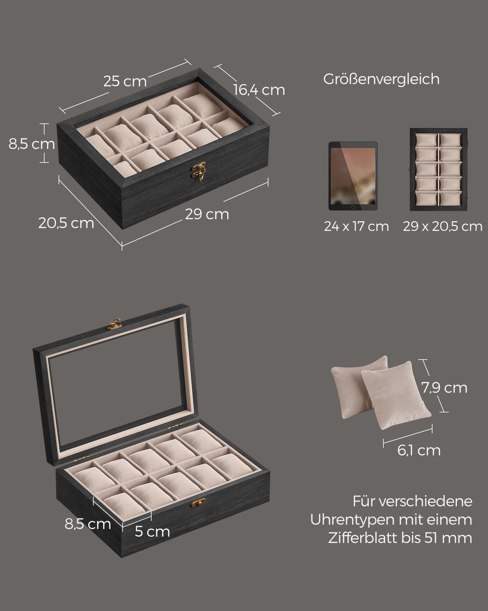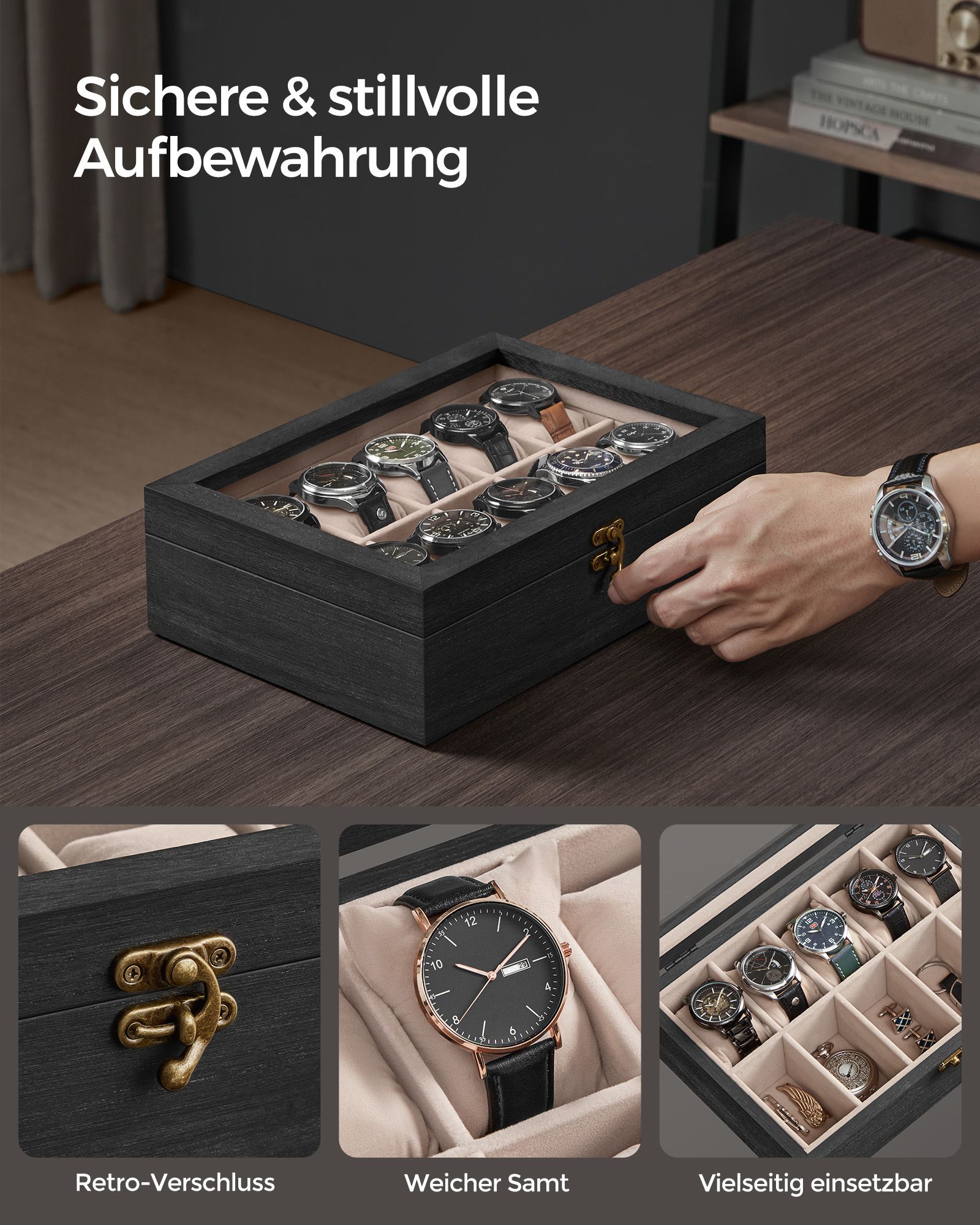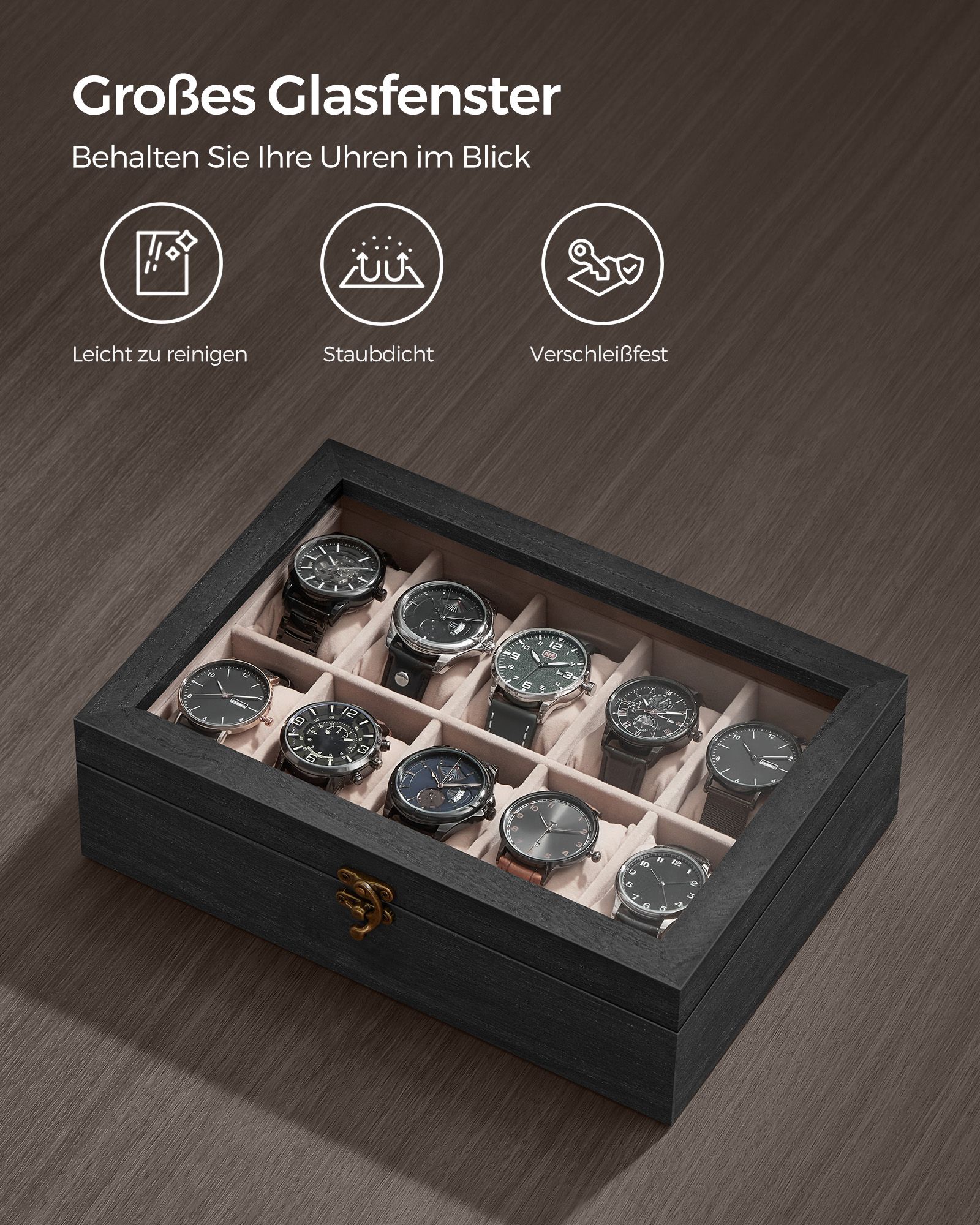 SONGMICS kellolaatikko, 10 lokeroa, massiivipuinen kellokotelo, lasikansi, kellotyyny, lahja rakkaimmillesi